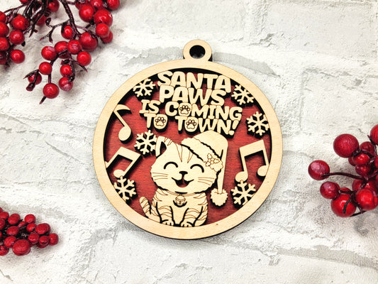 Santa Paws is Coming to Town Cat Ornament - Laser Cut Christmas Tree Decor