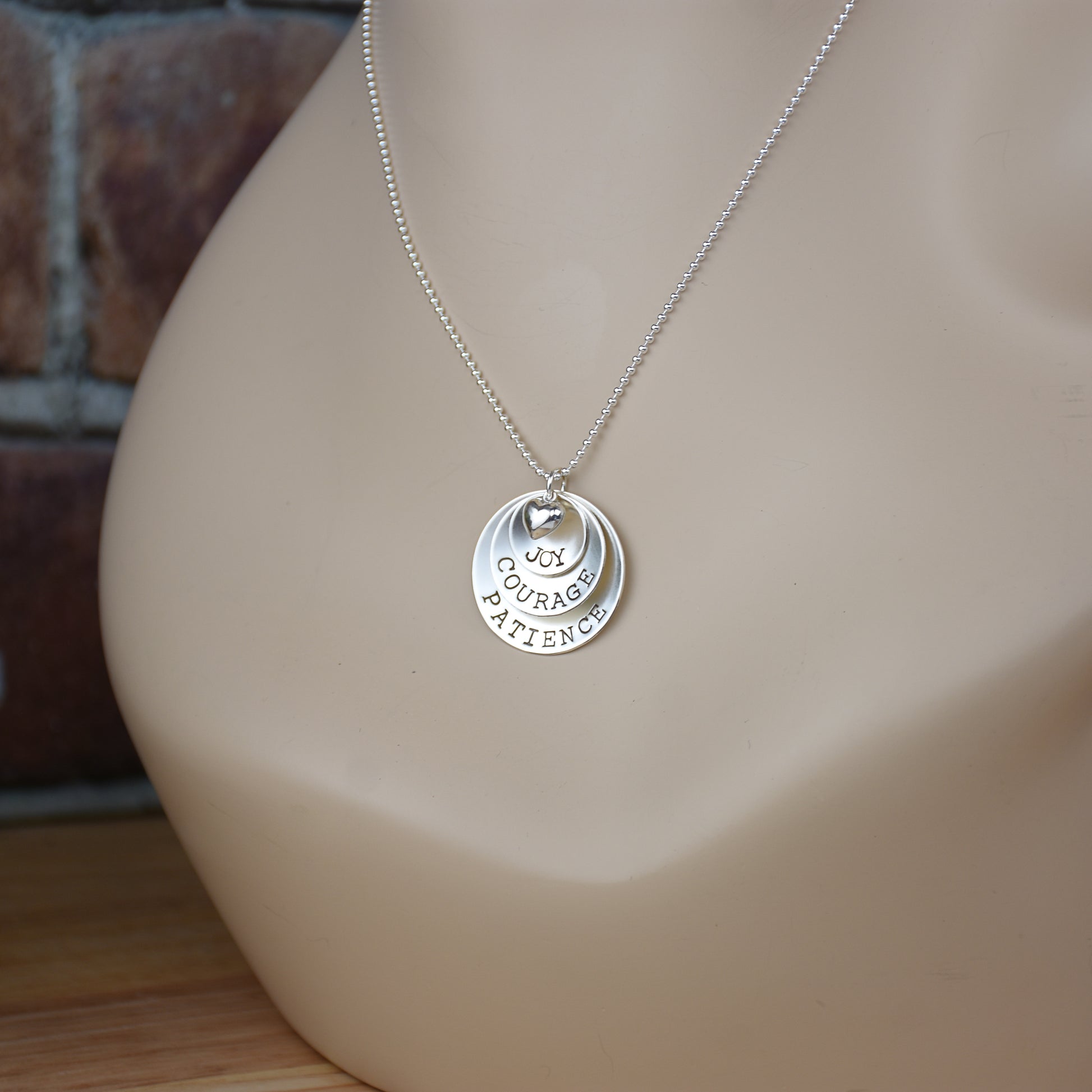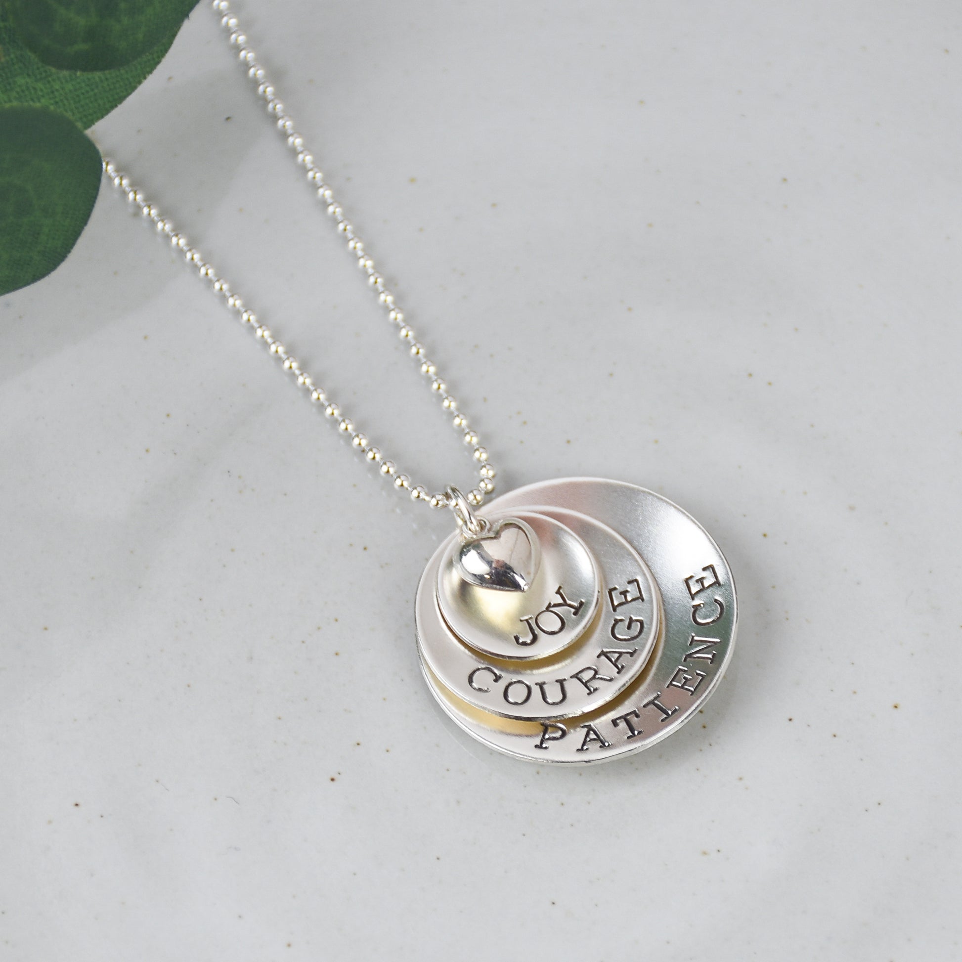 This 3 layer sterling silver necklace is the perfect personalized accessory. Each custom word is engraved on a disc, adding a unique touch. With a 16 to 20 inch adjustable chain, choose from a variety of styles to fit your preference. Upgrade your style with this inspirational piece.