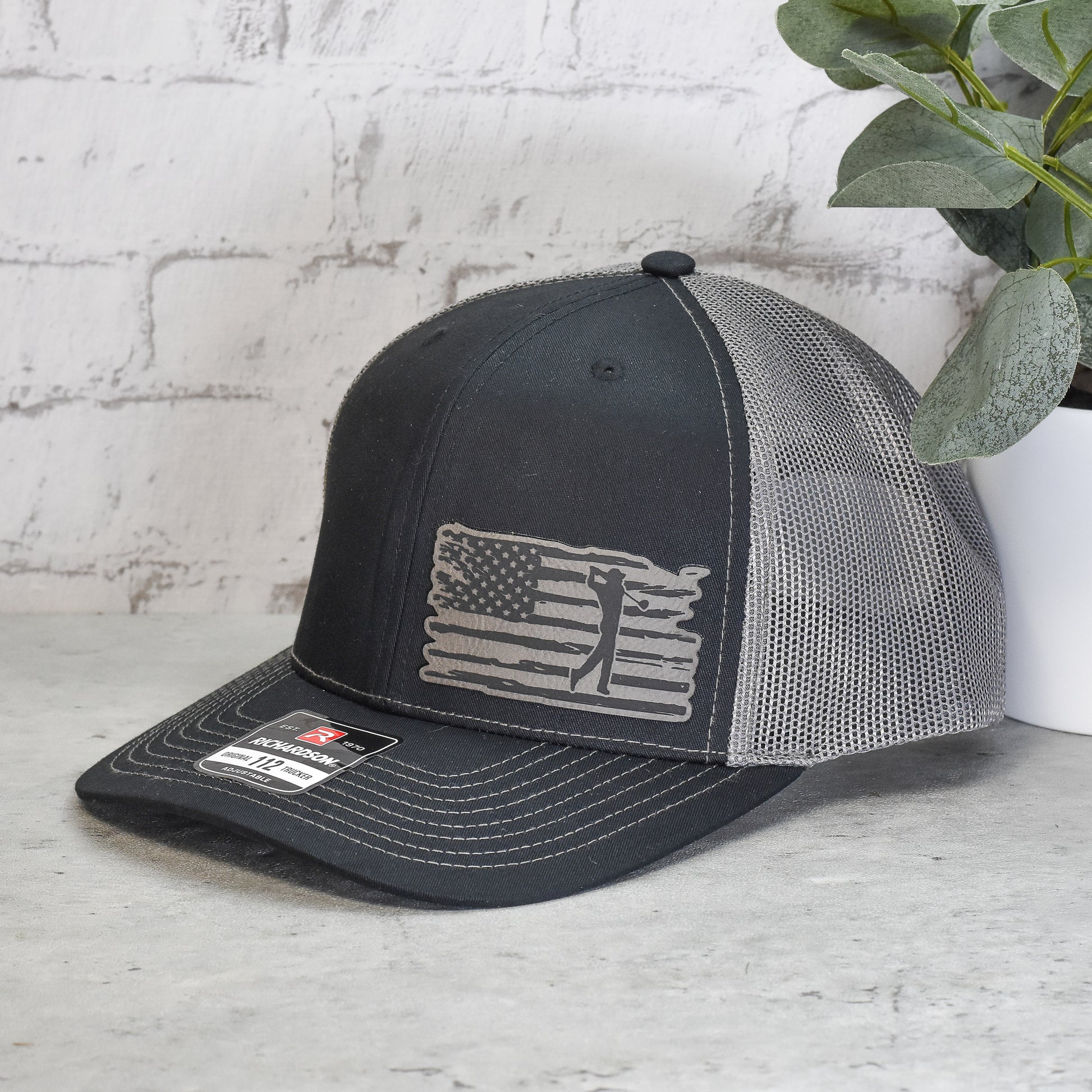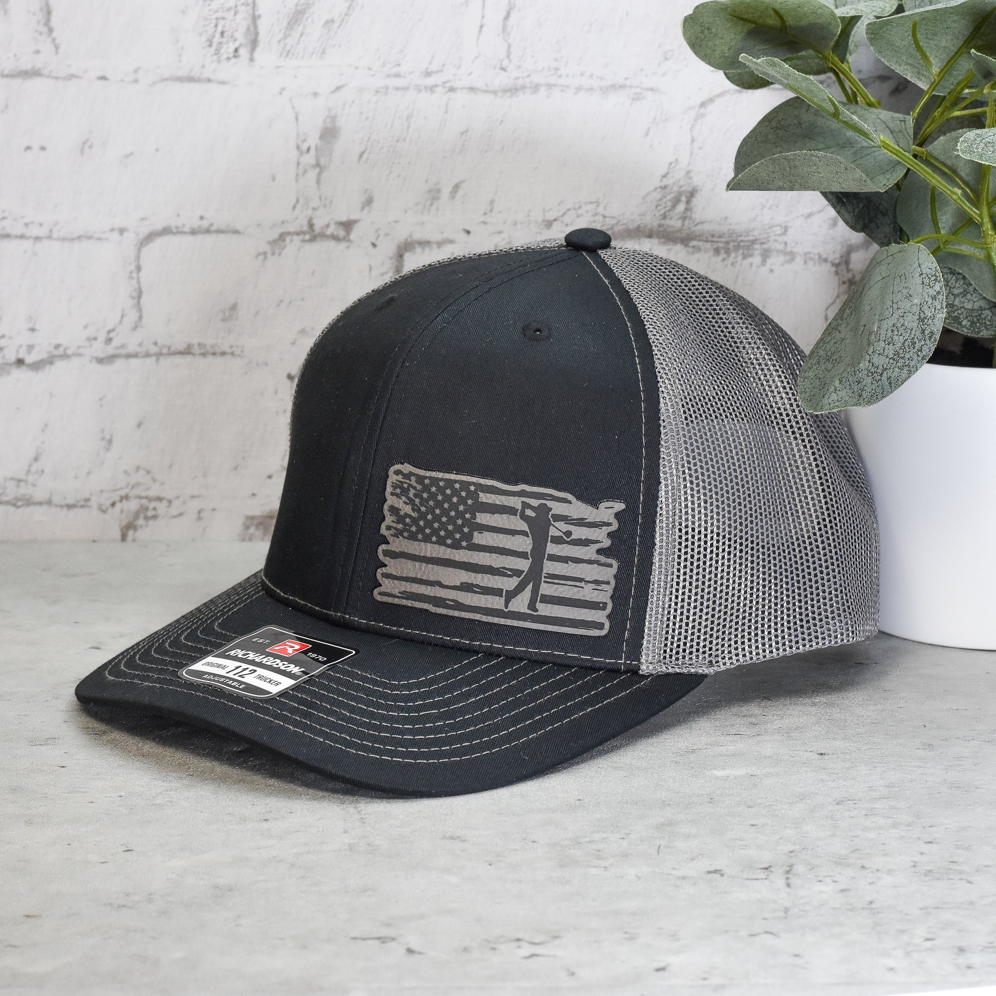 Golfer American Flag Trucker Hat - Custom Leatherette Logo