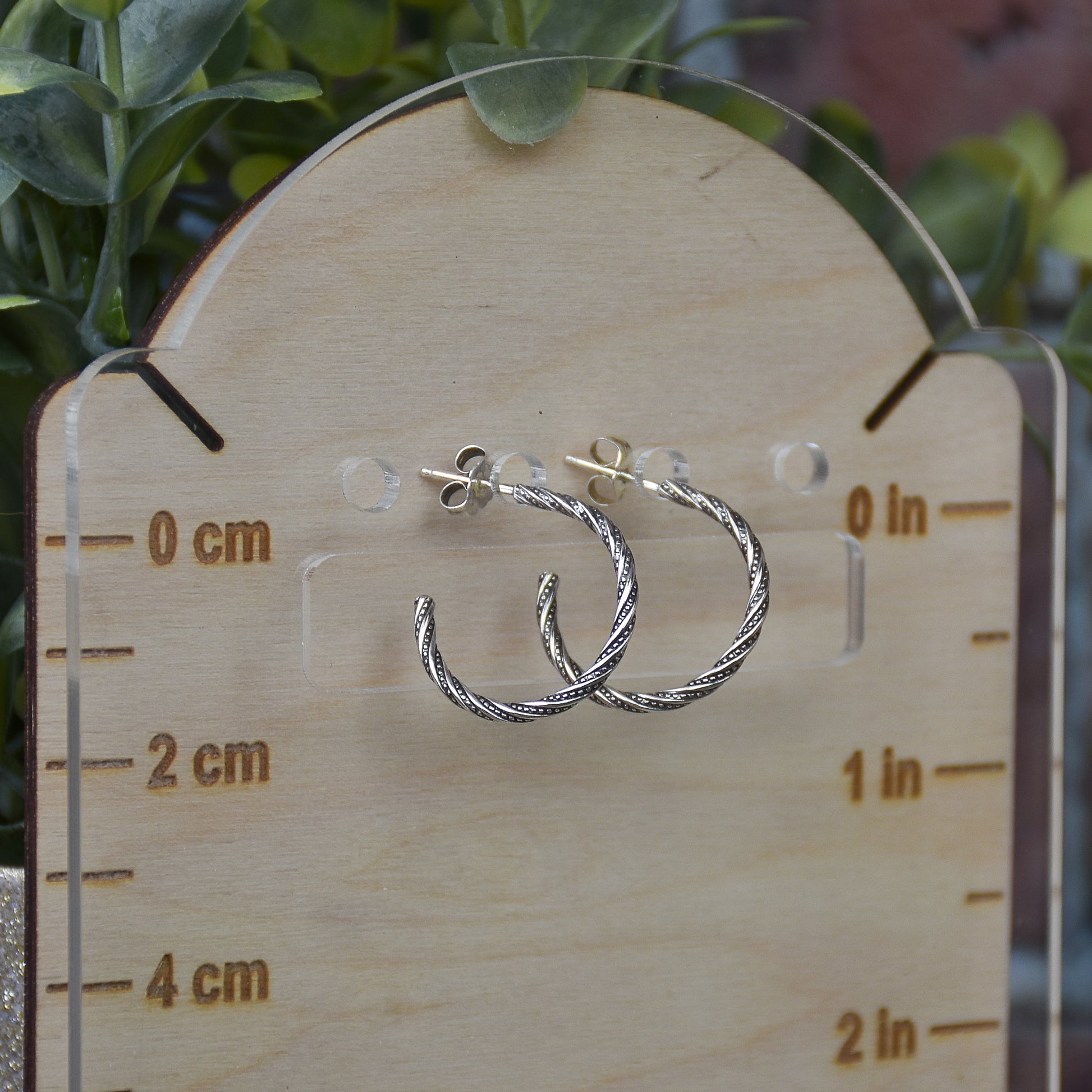 These sterling silver hoop earrings feature a unique antiqued dot twist design and secure post closure. Custom sizing options make them a perfect fit for any wearer. Enjoy the sleek and elegant look of these versatile earrings.
