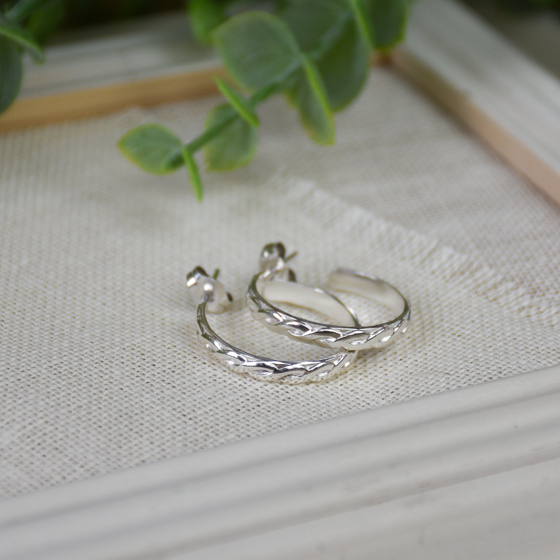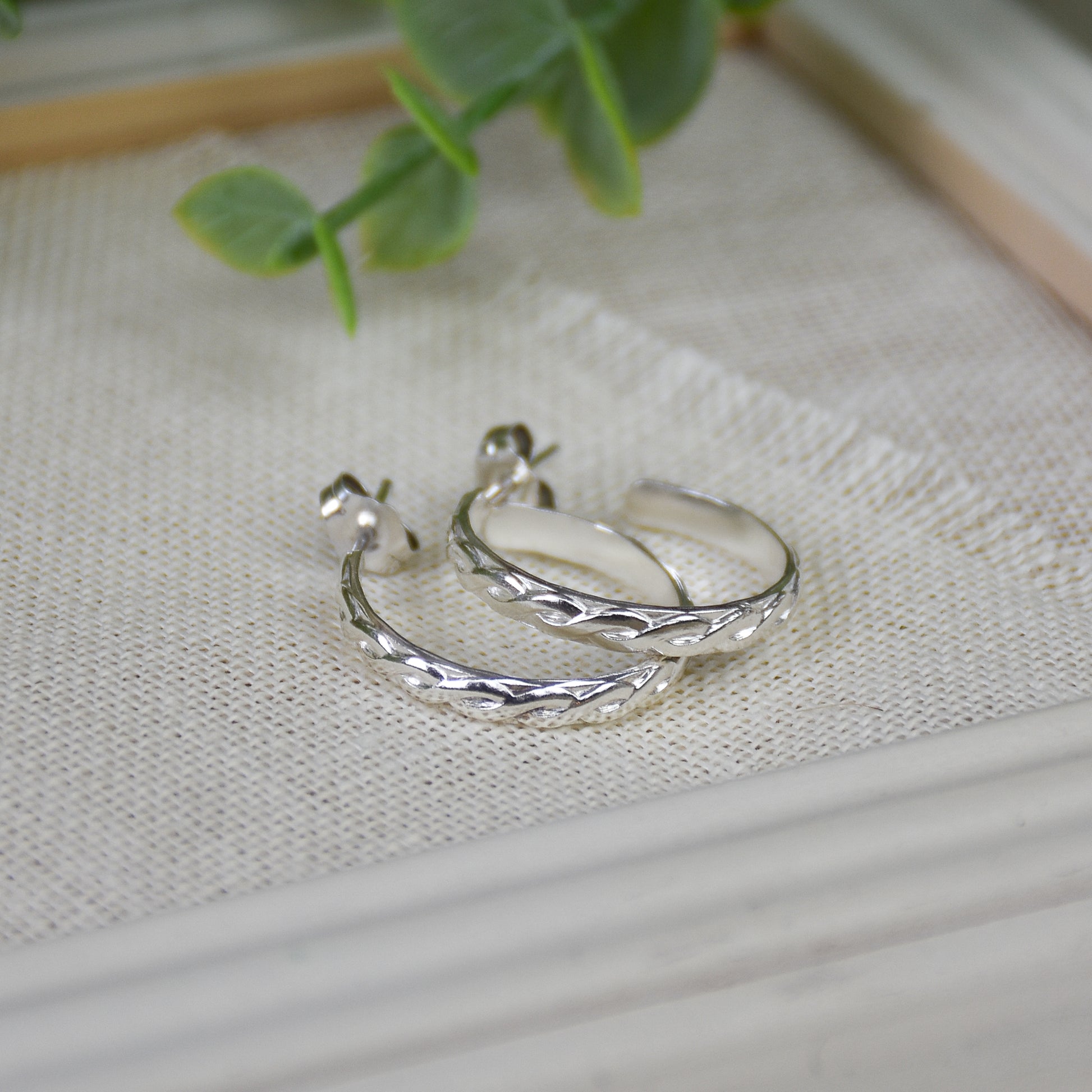 These sterling silver hoop earrings feature a unique braided twist design and secure post closure. Custom sizing options make them a perfect fit for any wearer. Enjoy the sleek and elegant look of these versatile earrings.
