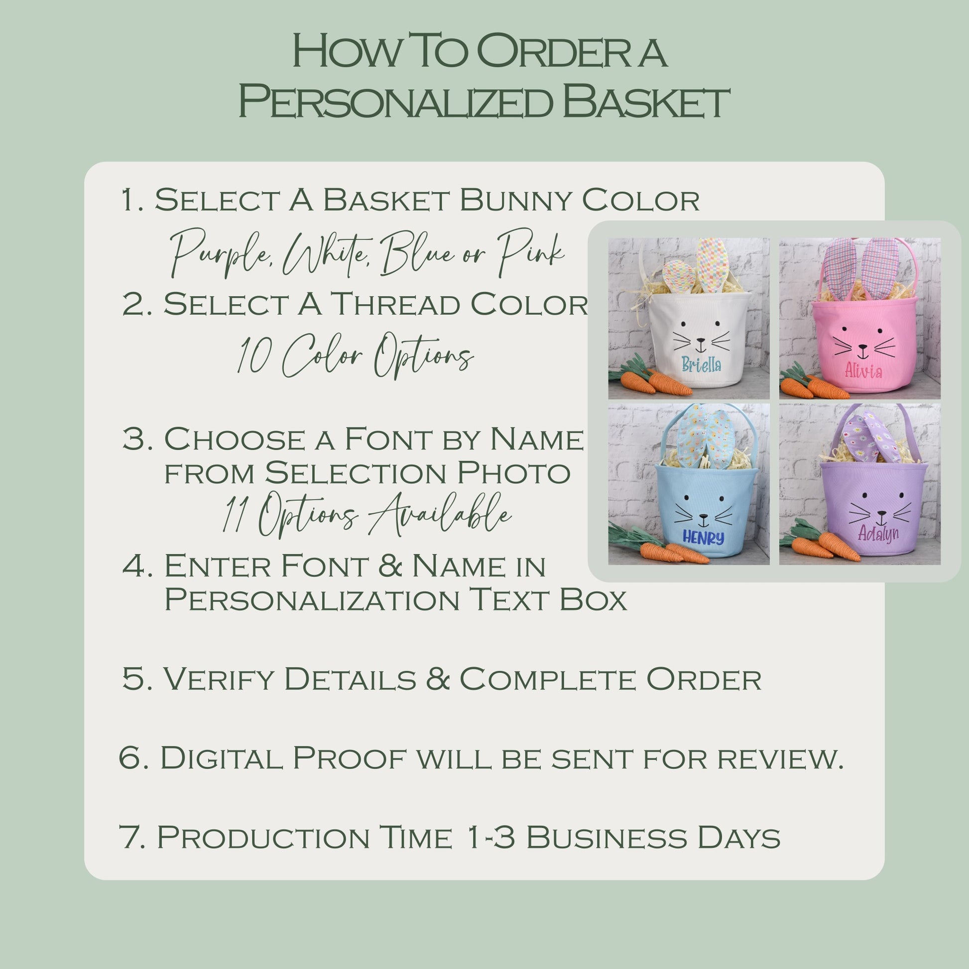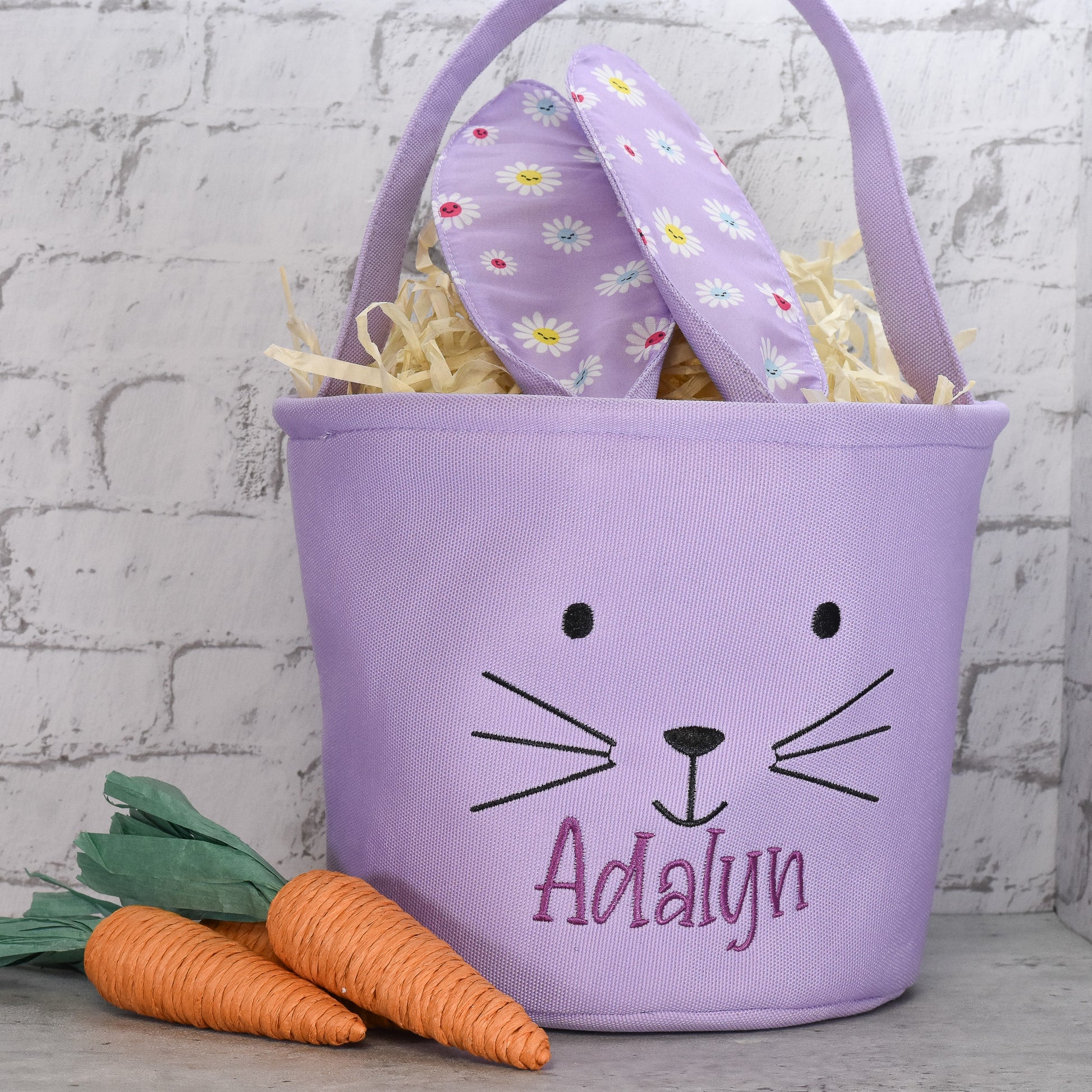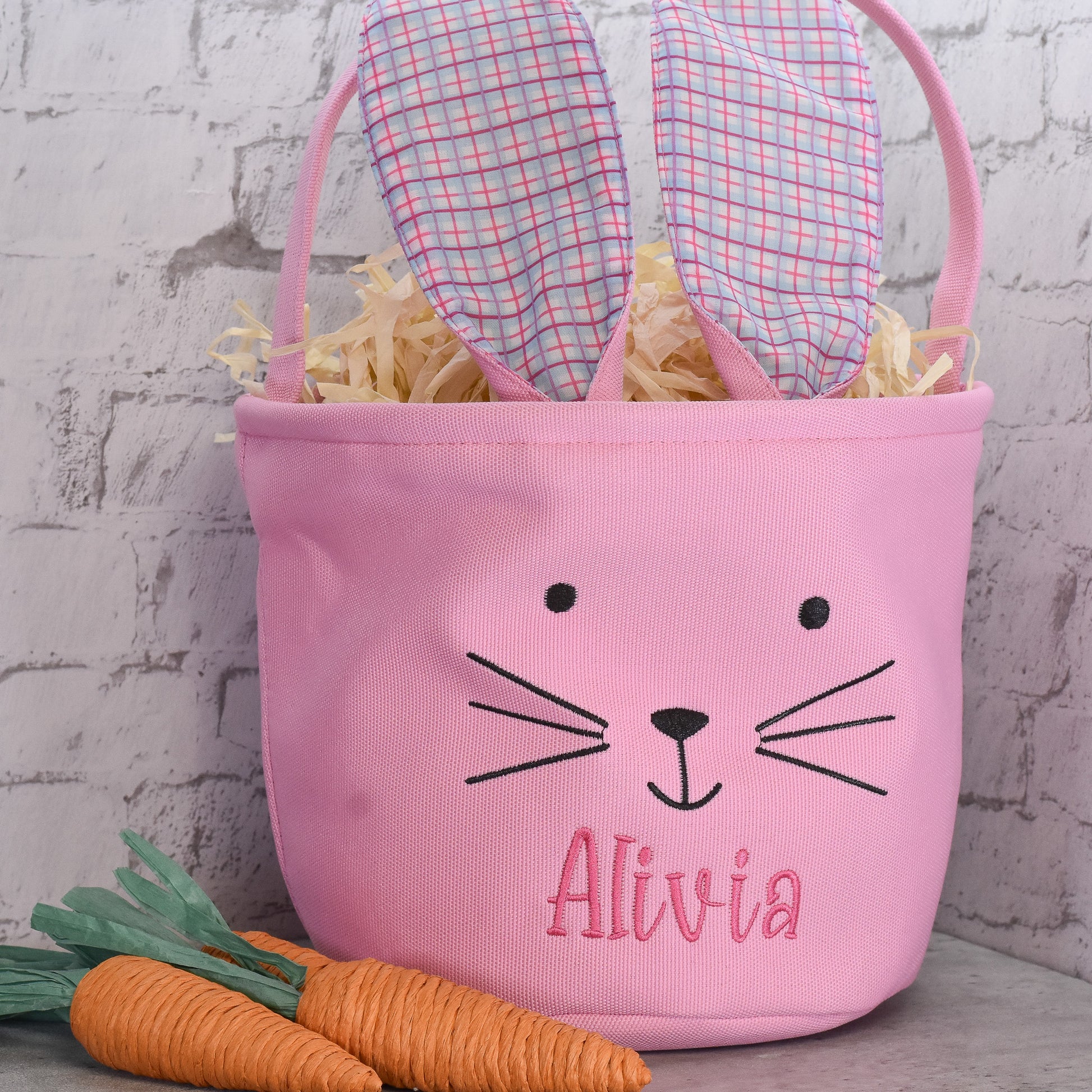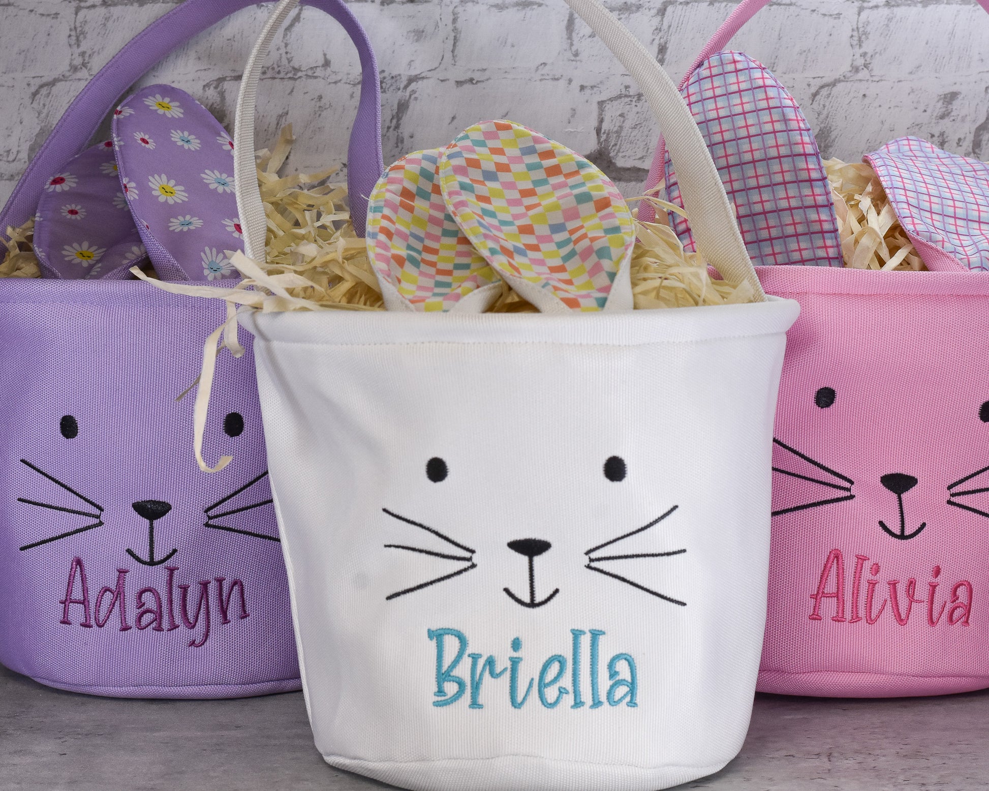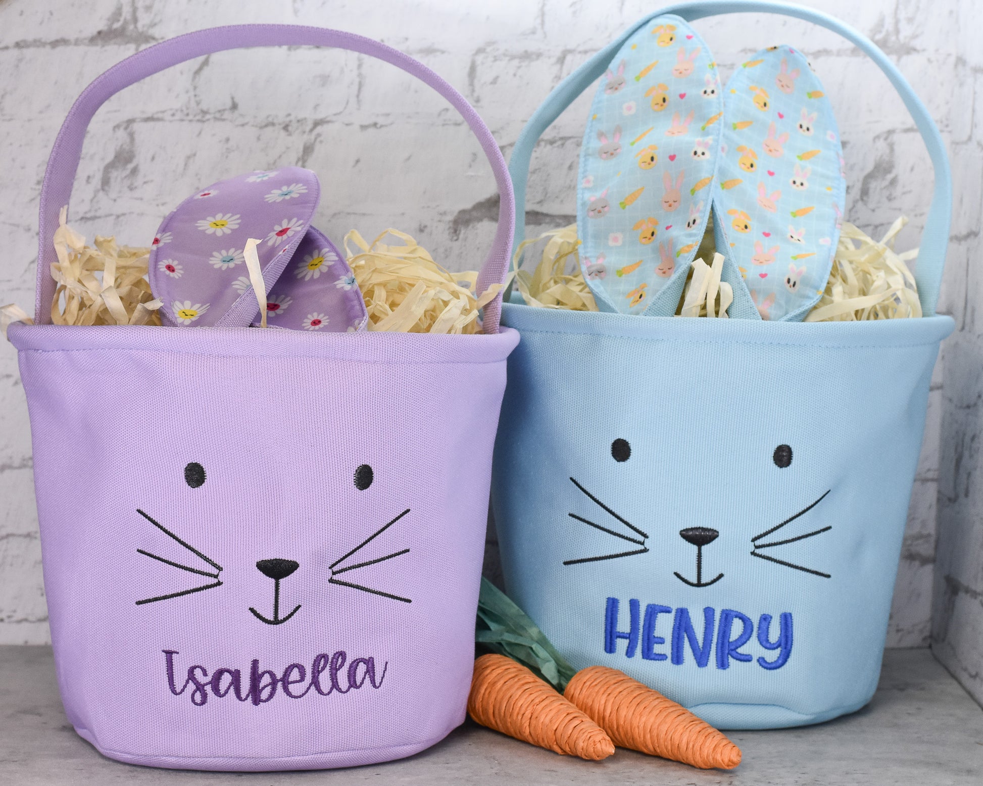 Make this Easter extra special with a cute, personalized Easter basket! Customize this kid's Easter basket with an embroidered name in coordinating thread color. The canvas basket comes in 4 color choices, each with a unique inner lining and ear color. These baskets make perfect Easter Gifts for your favorite boy or girl whether it be for an egg hunt or morning Easter Bunny presents. It's also a great gift from a grandmother to grandchild or a baby's first Easter which can be used year after year. Use this Bunny Ear Canvas Easter Basket to store your treats during & after the 'egg-citing' festivities!
