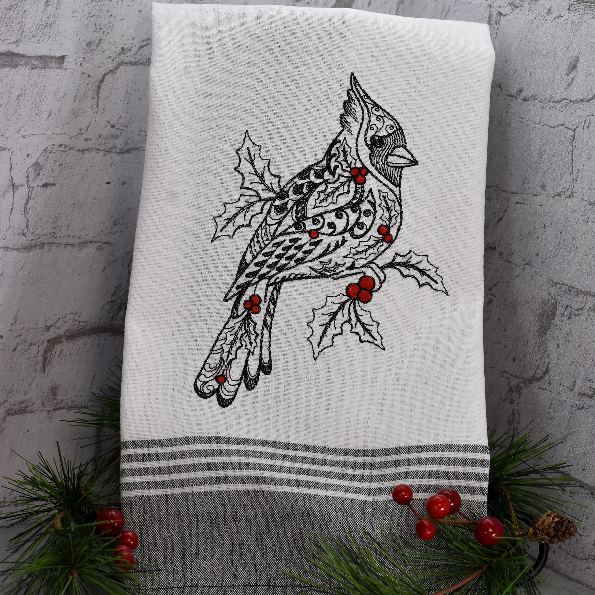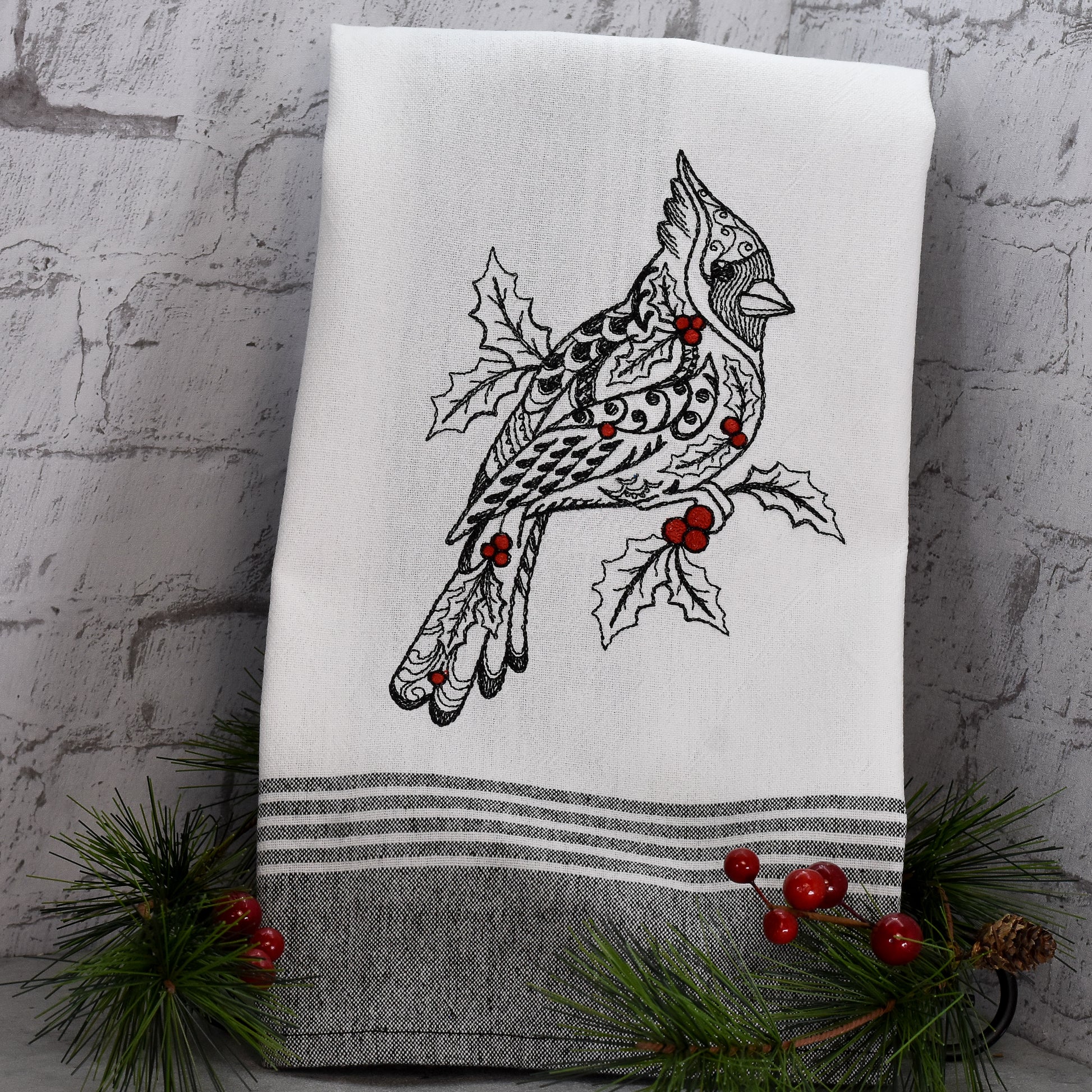 Celebrate the holiday season with our Cardinal Holiday Tea Towel. Made from soft cotton and featuring a redwork embroidery design of a cardinal, it adds a touch of farmhouse charm to your décor. The black and grey striped pattern adds a modern twist to this traditional holiday piece.