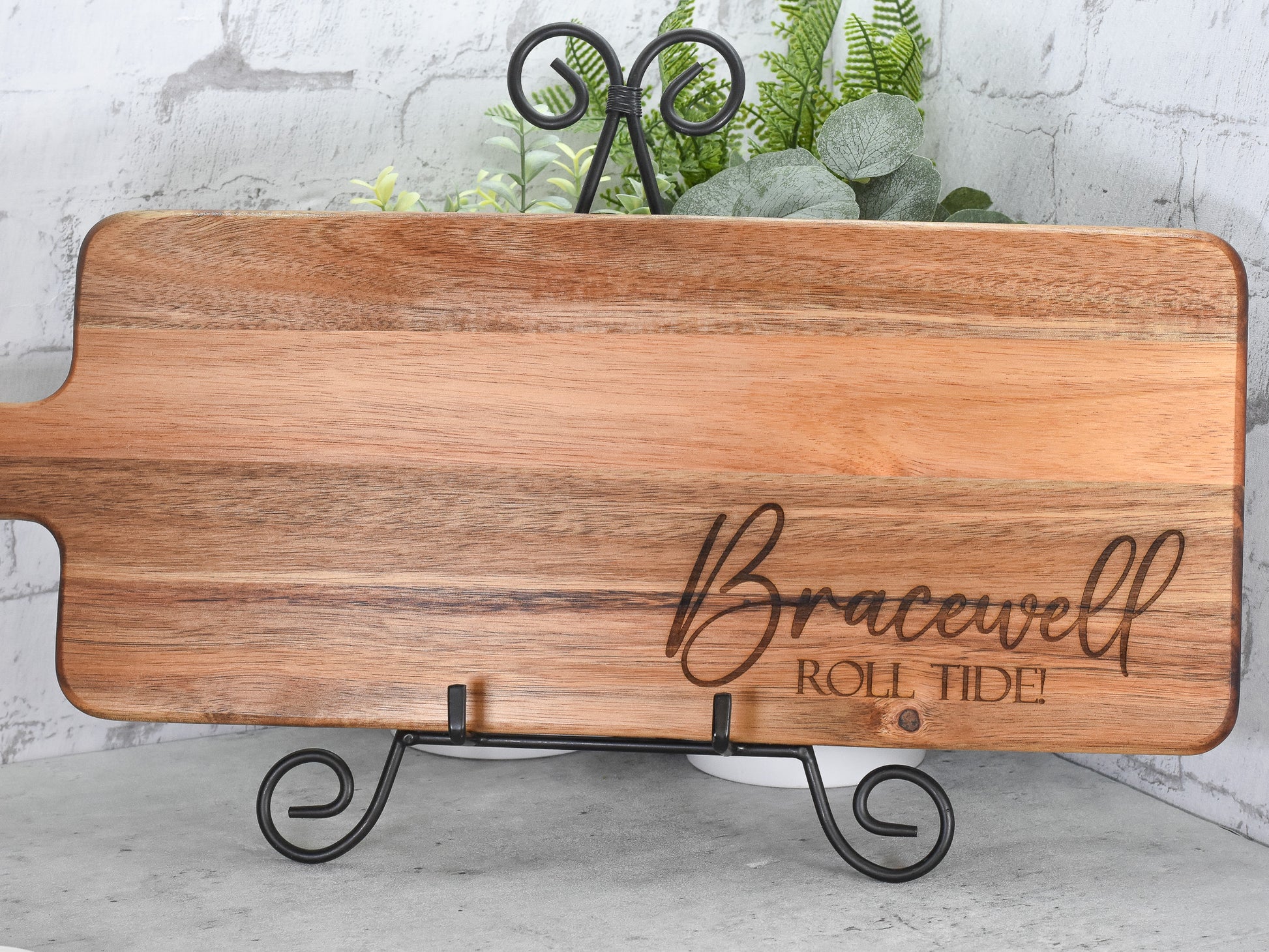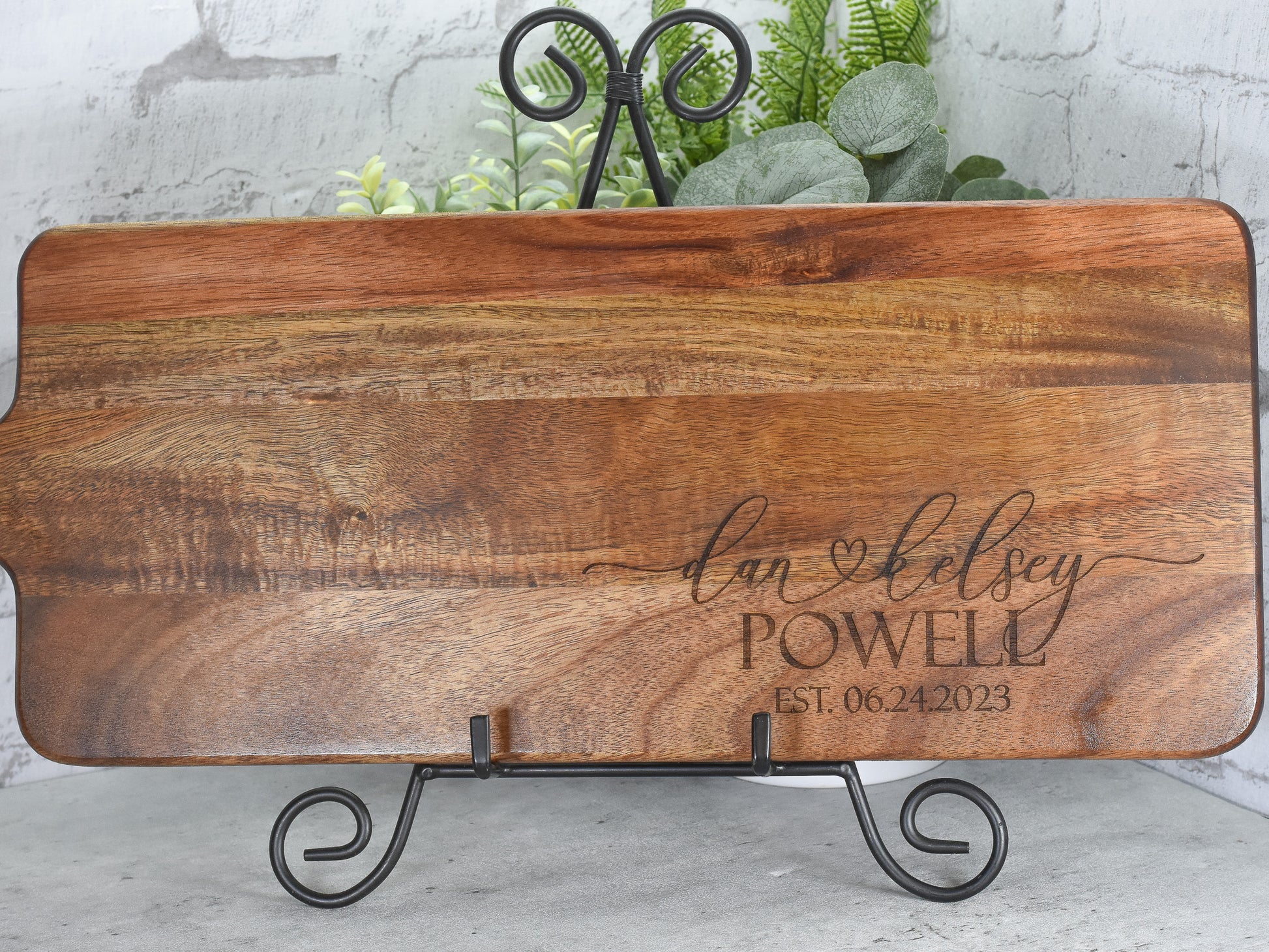 This beautiful charcuterie board is a must have for entertaining. Crafted from acacia wood with a custom design, this rectangular paddle board is perfect for displaying your meats & cheeses. Personalize it with a monogram and make it even more special. Laser engraved design and then sealed with oil. The perfect gift for weddings, engagements, and home warmings.