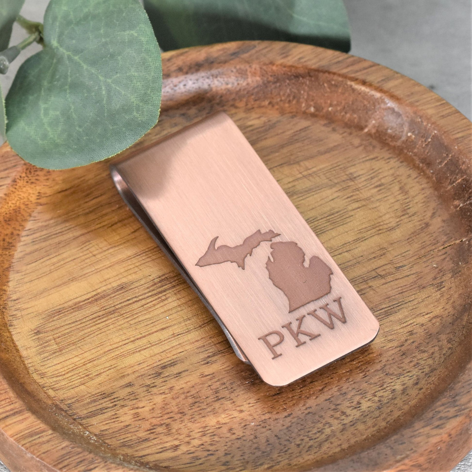 This stylish copper money clip is customized with an engraved design of the state of Michigan and can be personalized with an individual’s initials or monogram for a unique and personal touch. Made from durable metal, this money clip is the perfect way to keep all your bills, cards, and money organized.