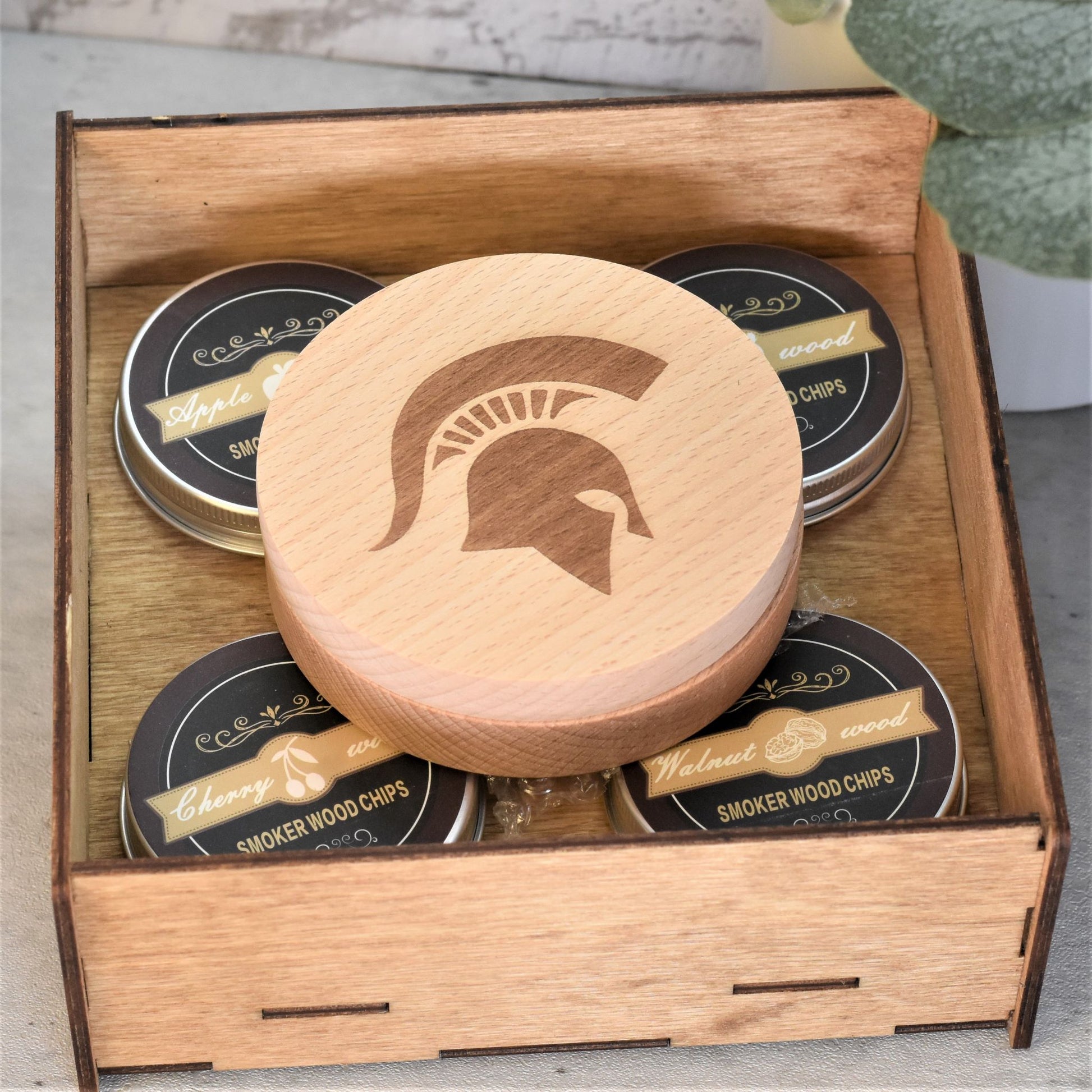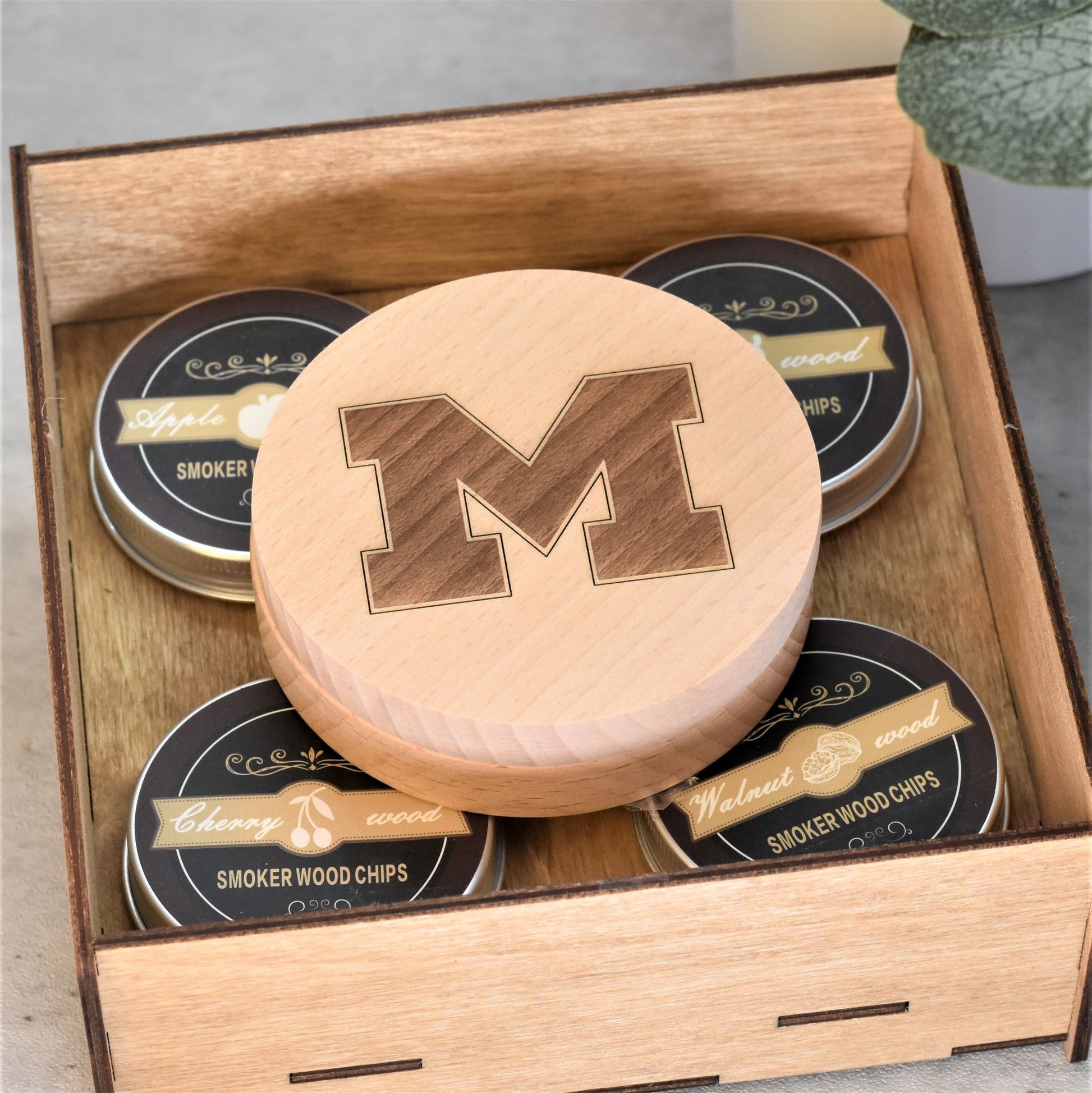 Custom Laser Engraving Service on Smoking Kit for Cocktails, Cheese or Ice Cream. Choose from monogram sample designs or submit your own custom design or photo. Laser engraving service includes personalization on Beech wood glass topper, 4 flavors of wood chips, ash basket & brush and choice of storage box. Glass not included in this listing.