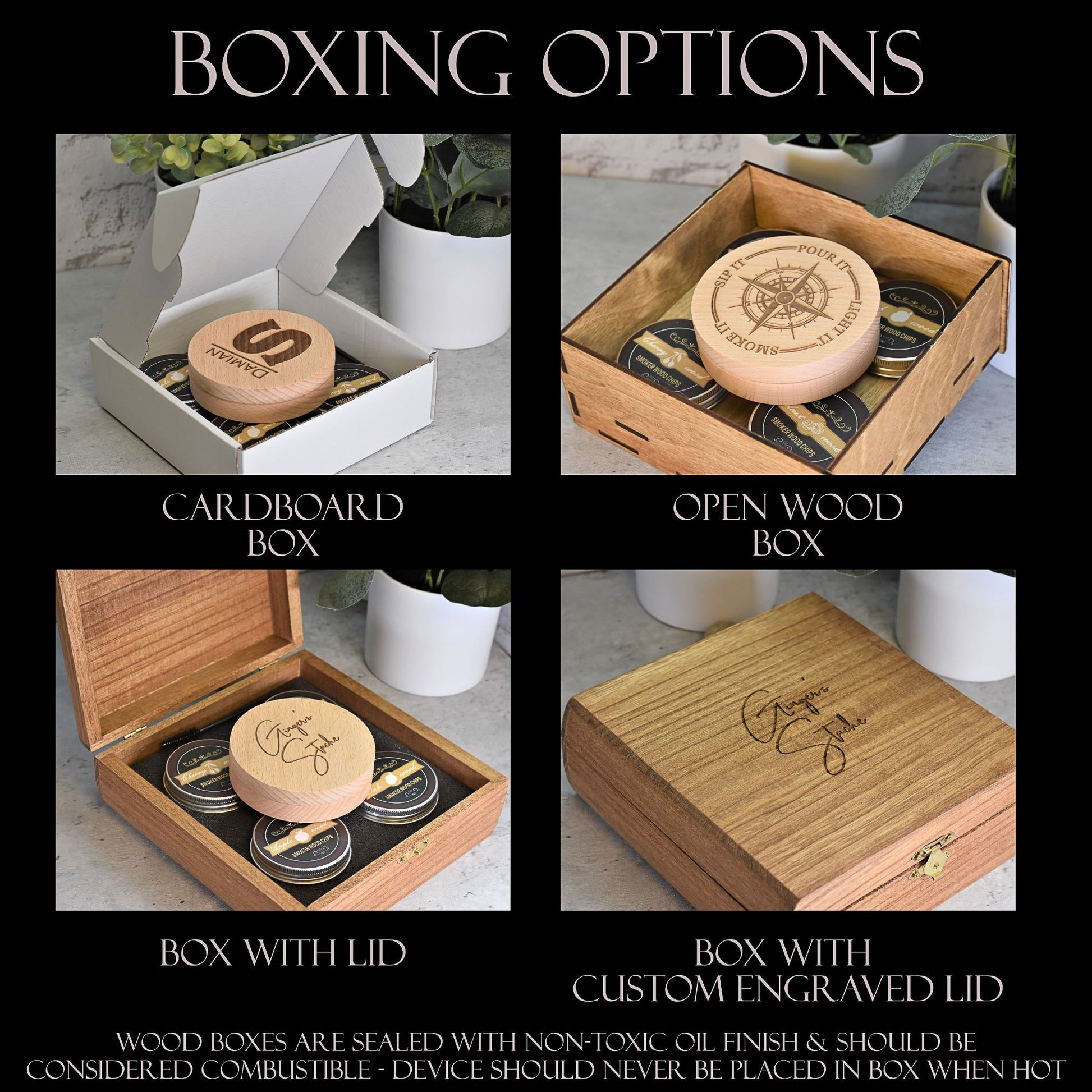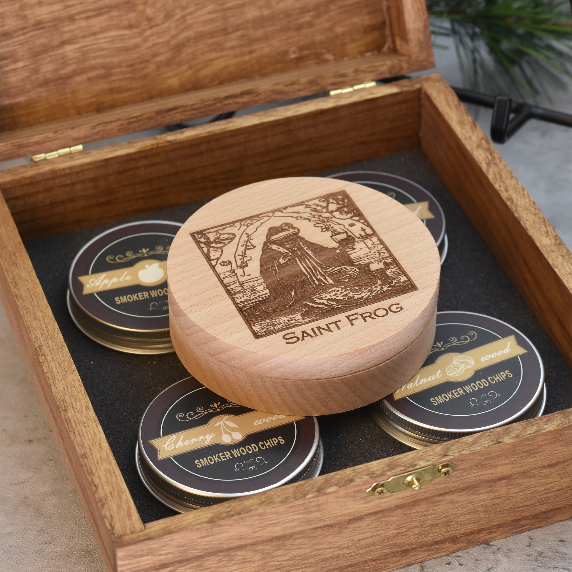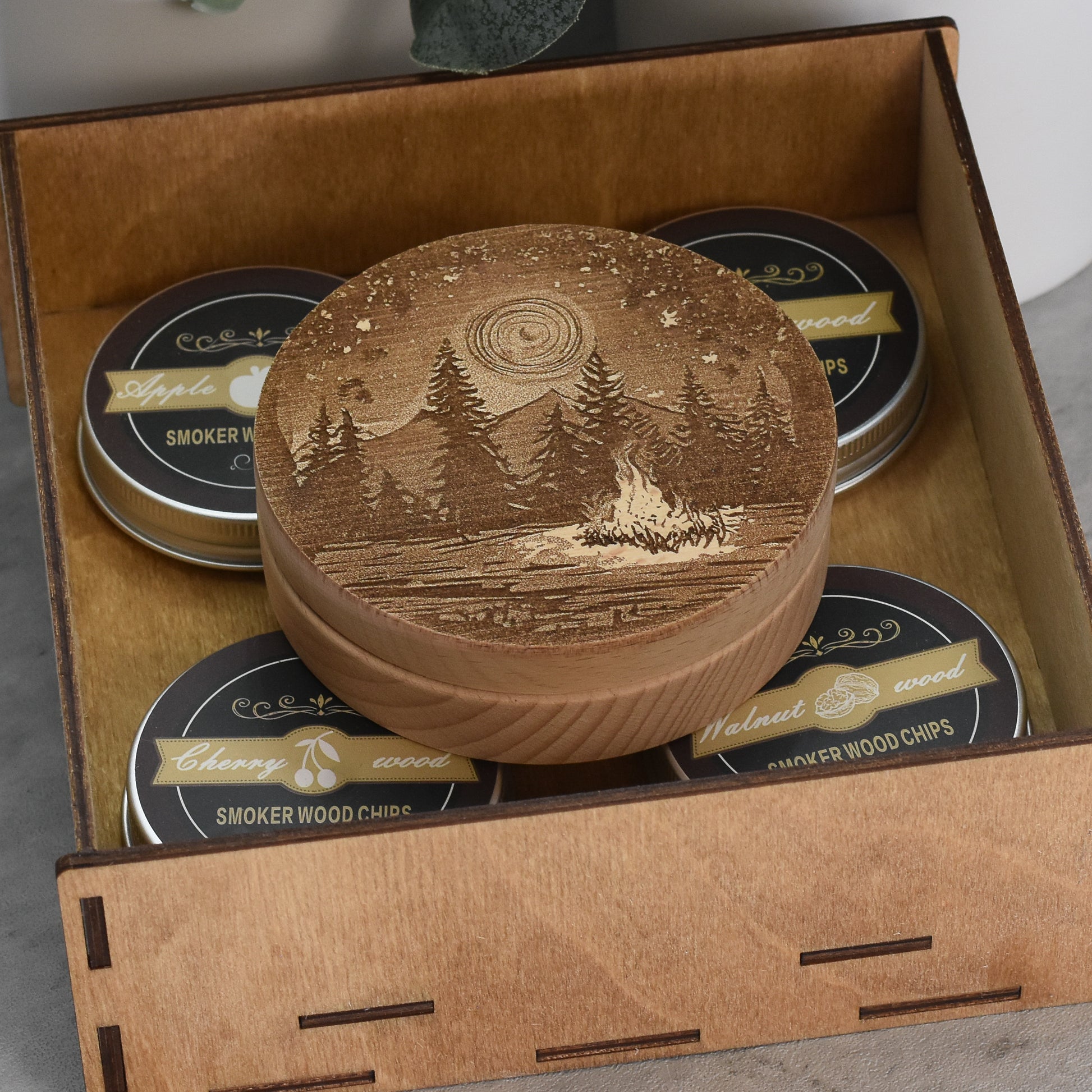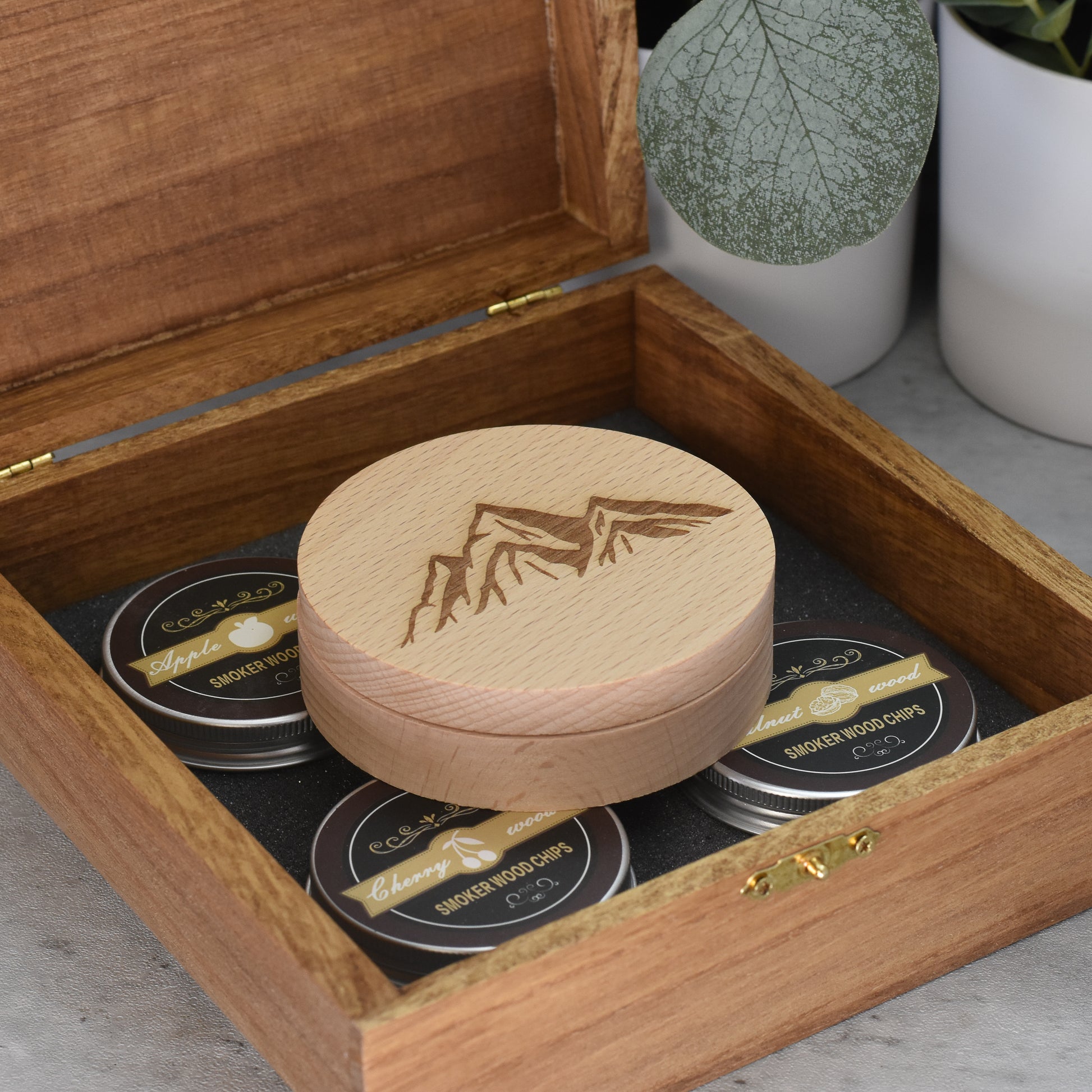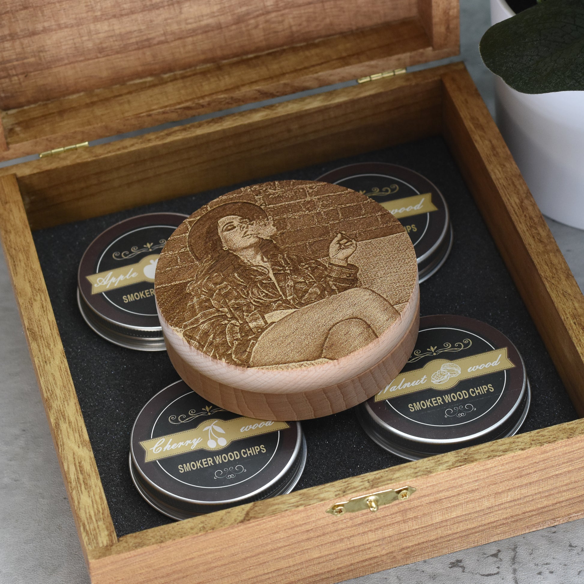 Custom Laser Engraving Service on Smoking Kit for Cocktails, Cheese or Ice Cream. Choose from monogram sample designs or submit your own custom design or photo. Laser engraving service includes personalization on Beech wood glass topper, 4 flavors of wood chips, ash basket & brush and choice of storage box. Glass not included in this listing.