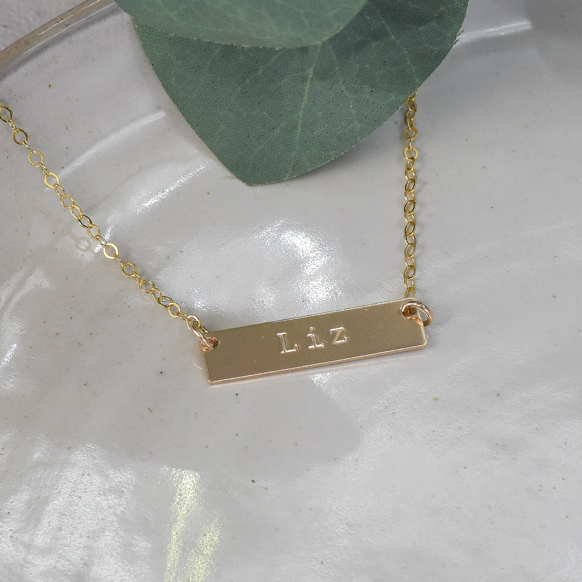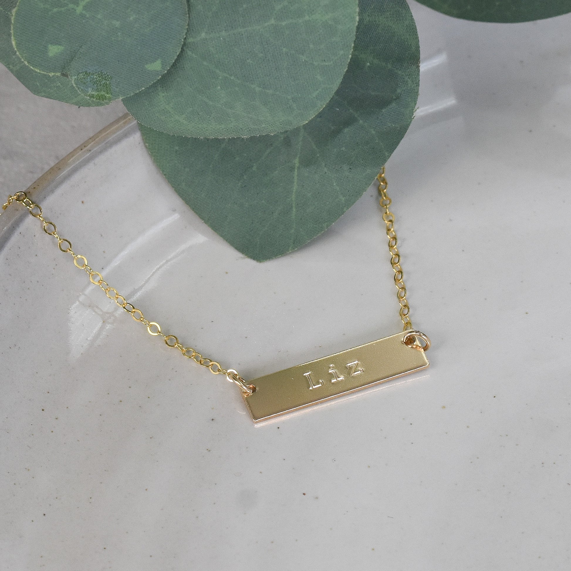 This Gold Bar Name Necklace is sure to make a statement. With an adjustable length chain and hand cut and design, it is crafted from durable 14/20 gold-filled material. Each piece is stamped with a unique name or word, making this necklace truly special.