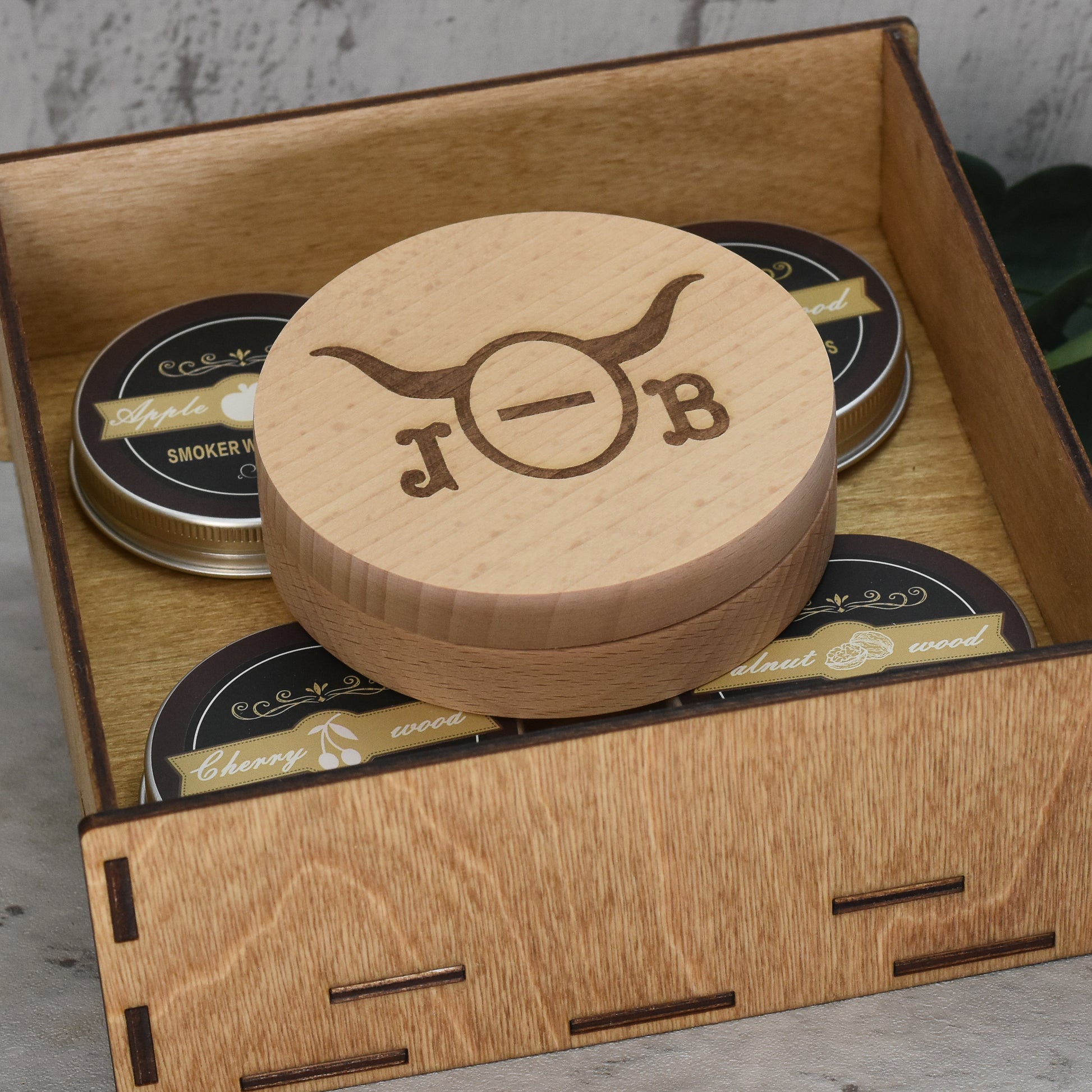 Custom Laser Engraving Service on Smoking Kit for Cocktails, Cheese or Ice Cream. Choose from monogram sample designs or submit your own custom design or photo. Laser engraving service includes personalization on Beech wood glass topper, 4 flavors of wood chips, ash basket & brush and choice of storage box. Glass not included in this listing.