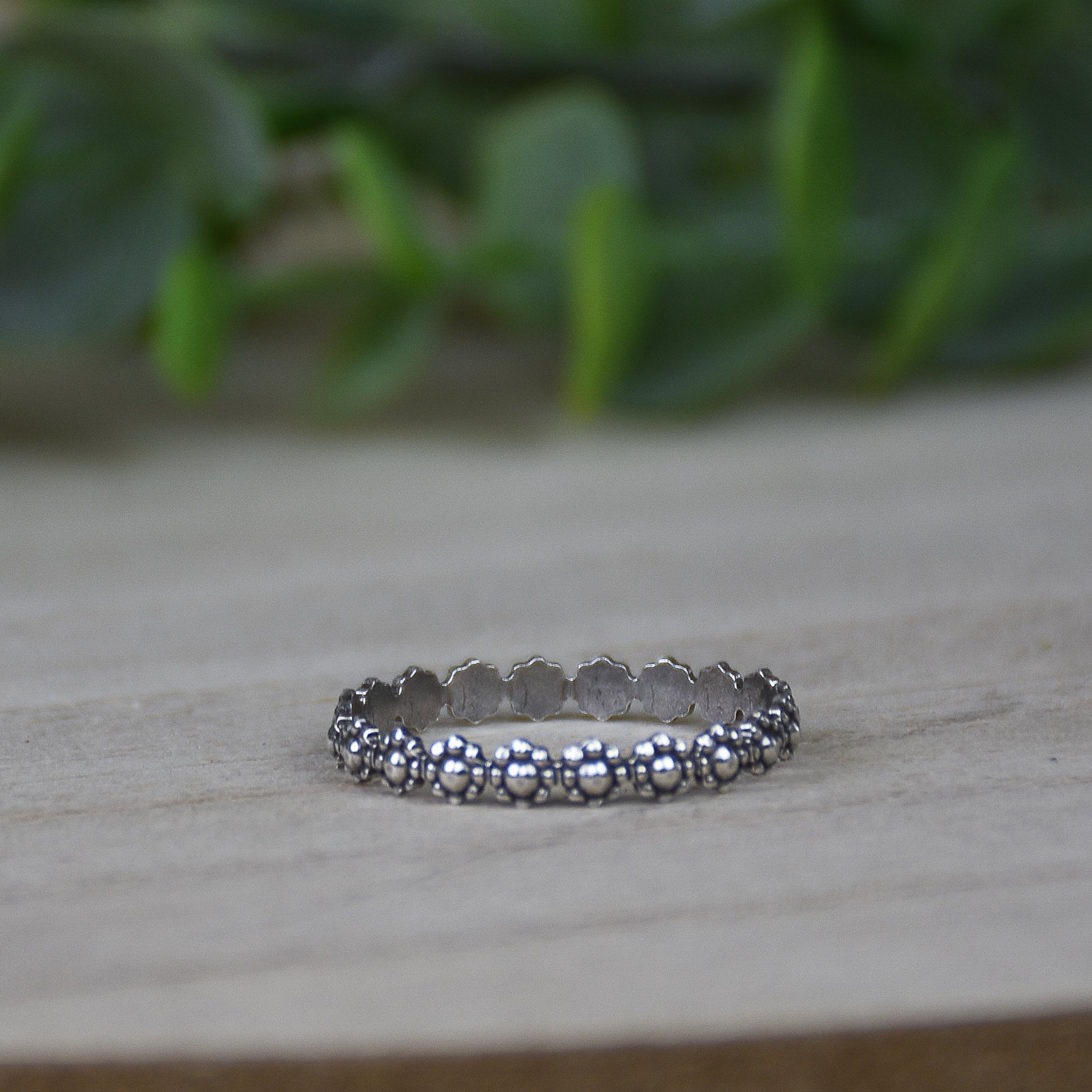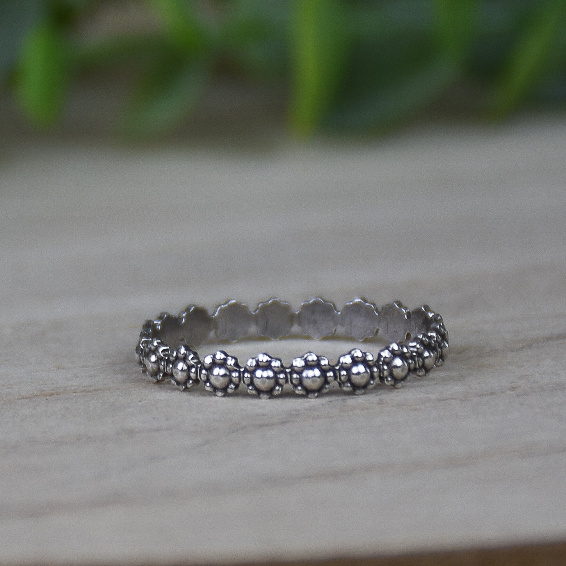 This unique and stylish Bali daisy design sterling silver ring is perfect for stacking or wearing on its own. Handmade and custom sized, it features a beautiful oxidized texture. Elevate your style with this one-of-a-kind piece.