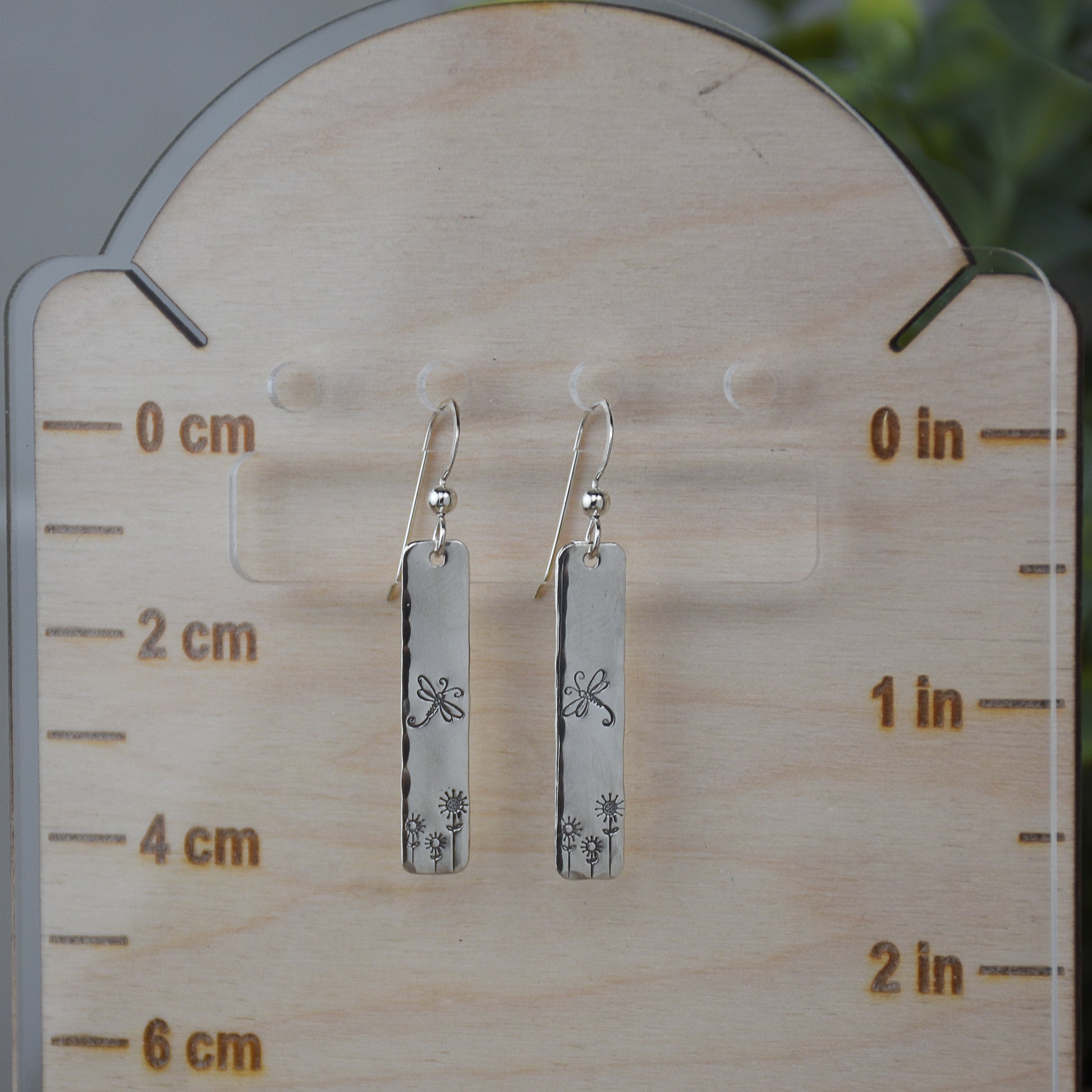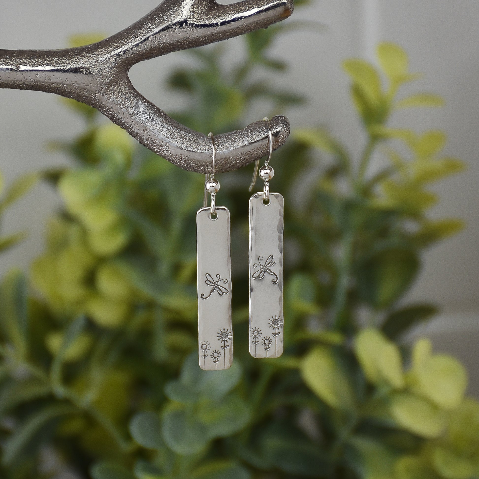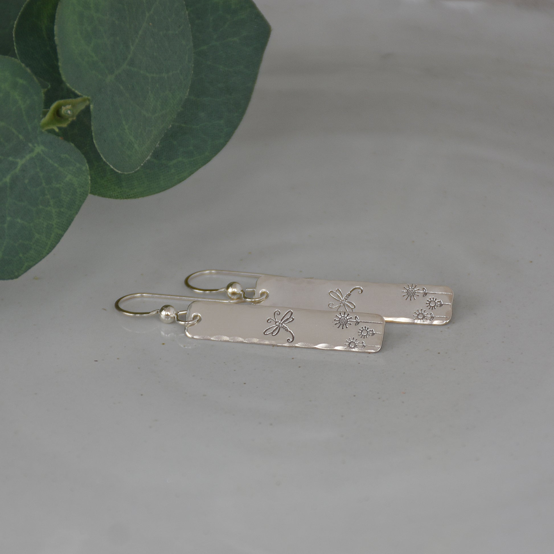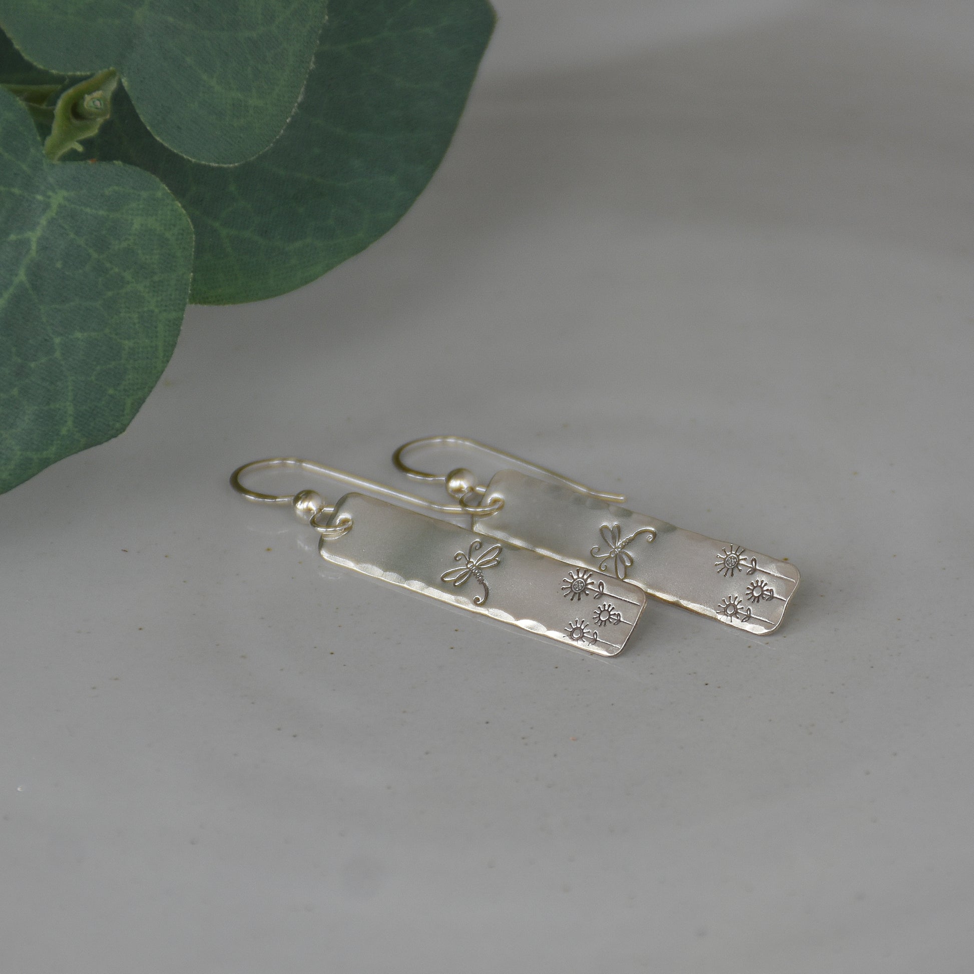 Dragonfly Garden Earrings - Sterling Silver Stamped Rectangle