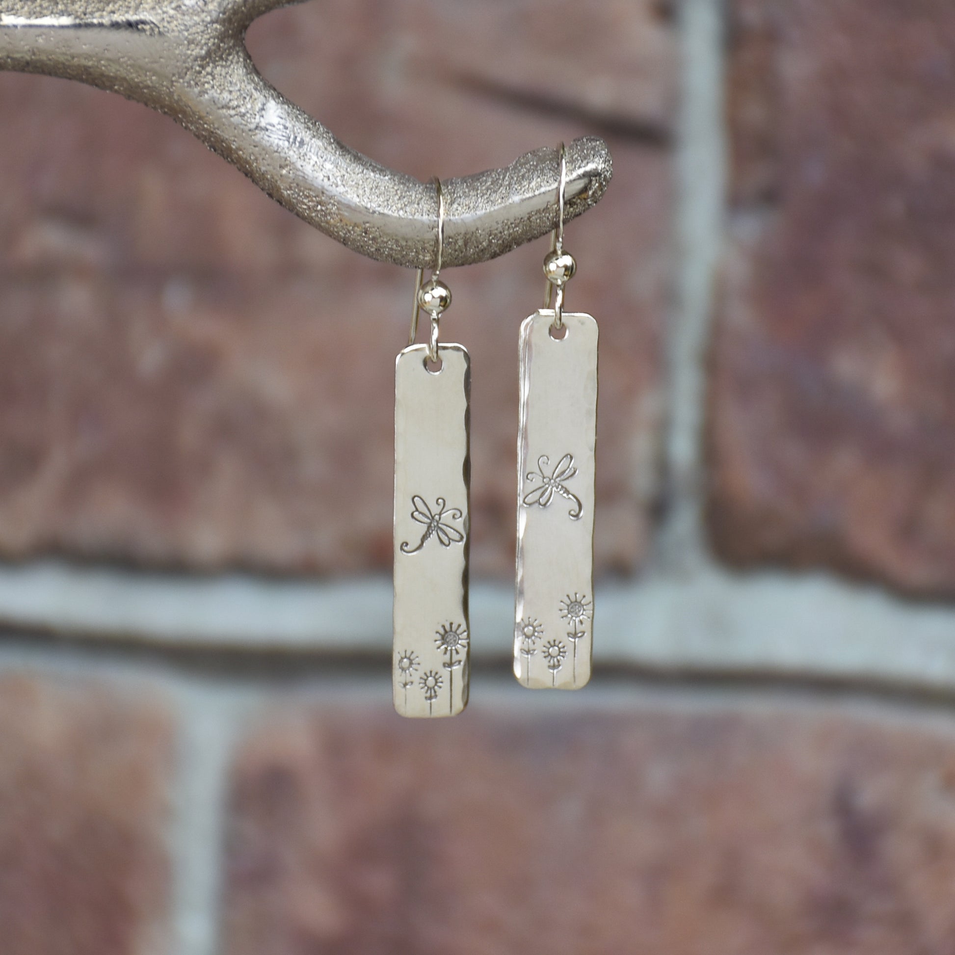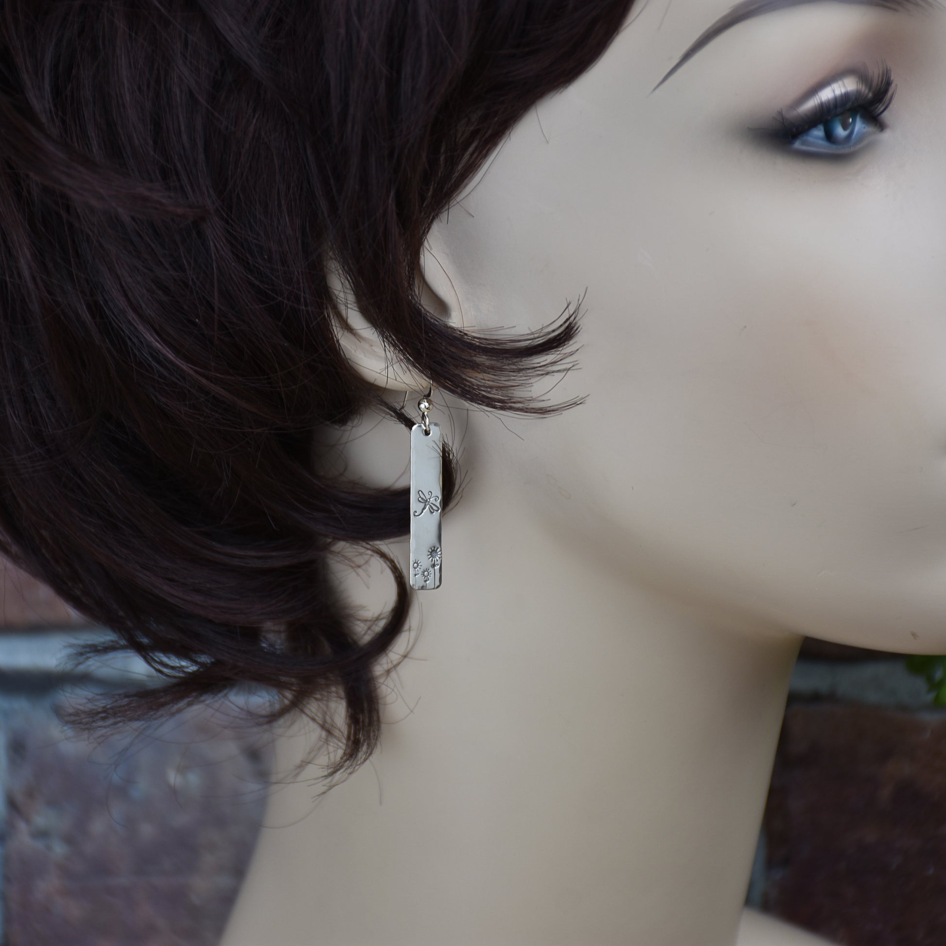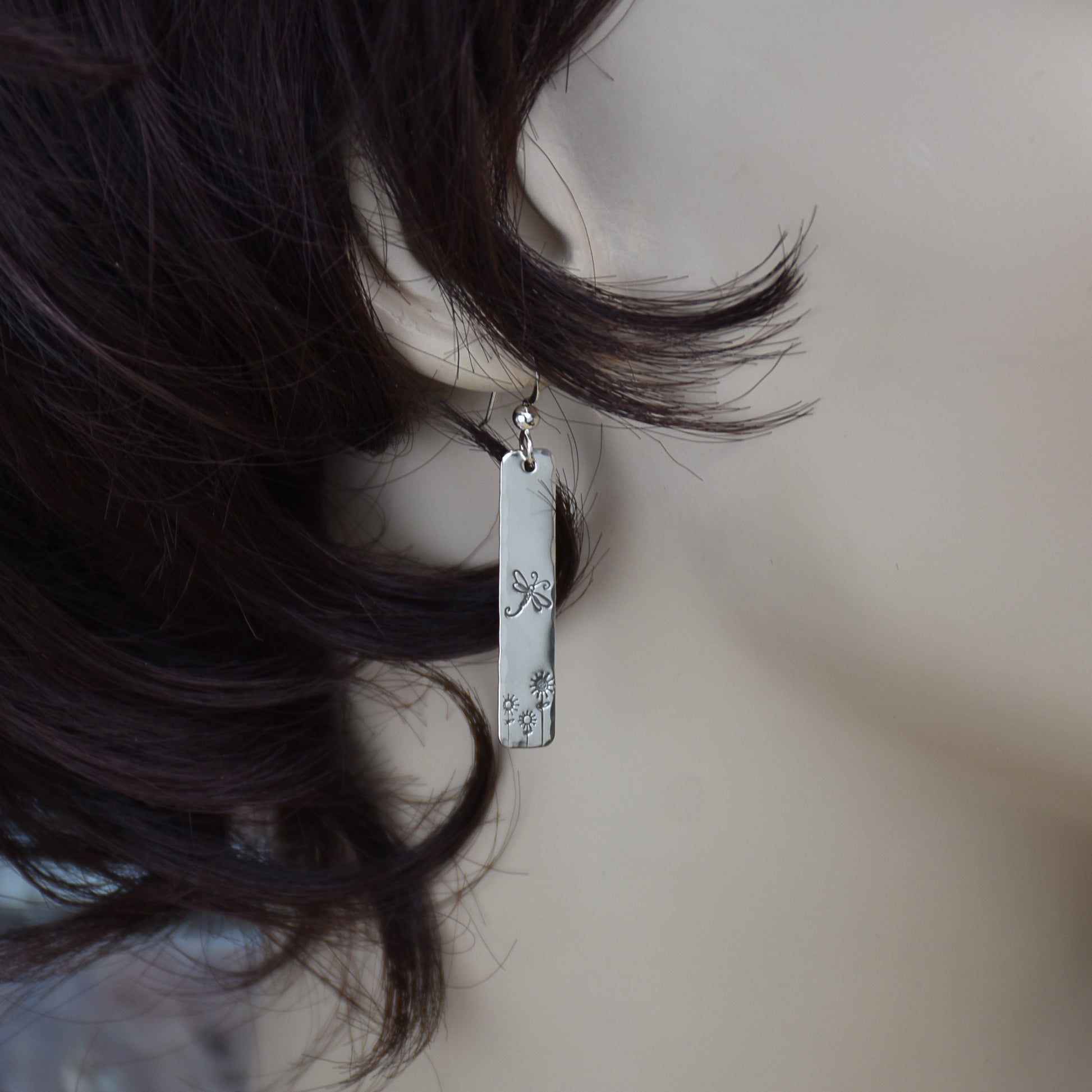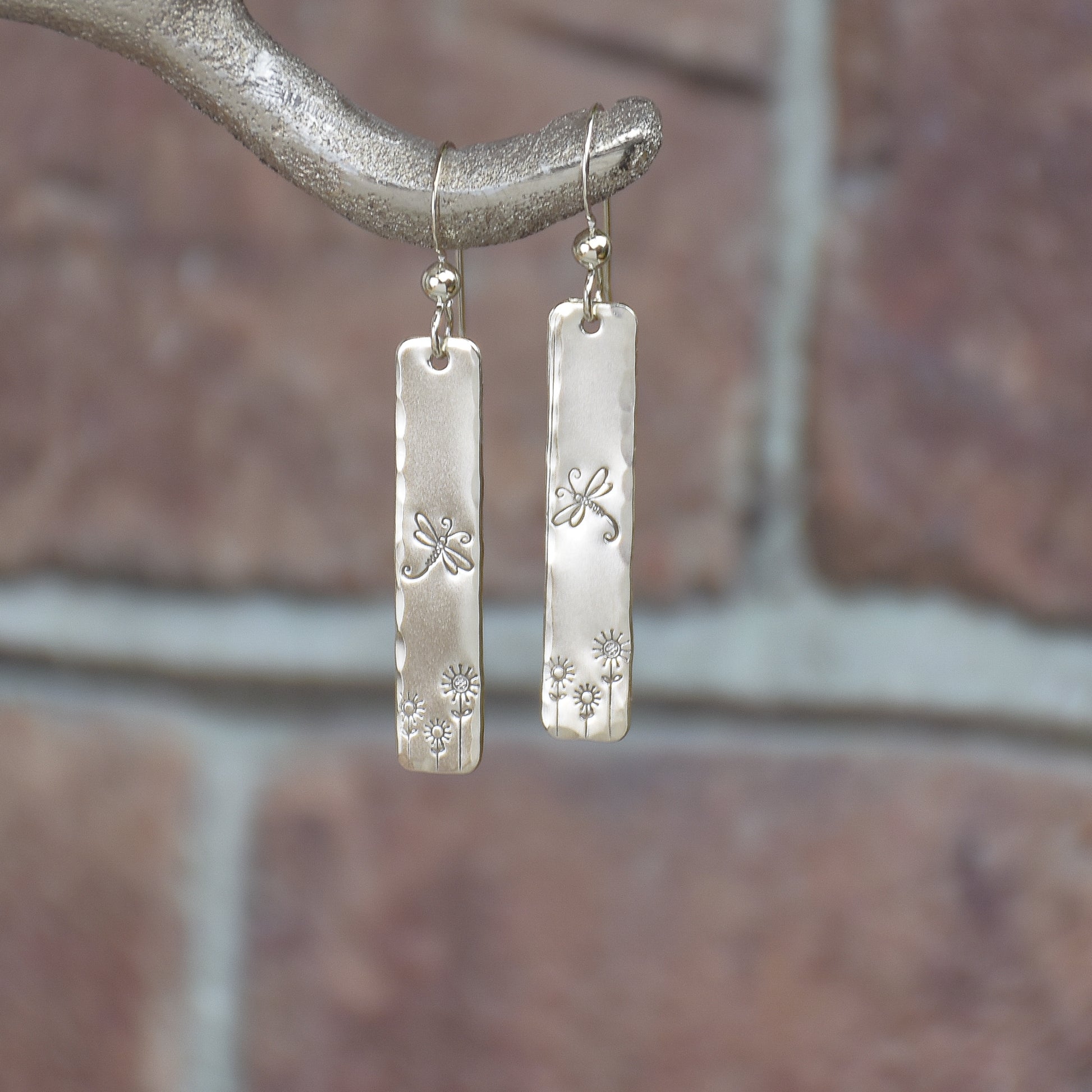 Dragonfly Garden Earrings - Sterling Silver Stamped Rectangle
