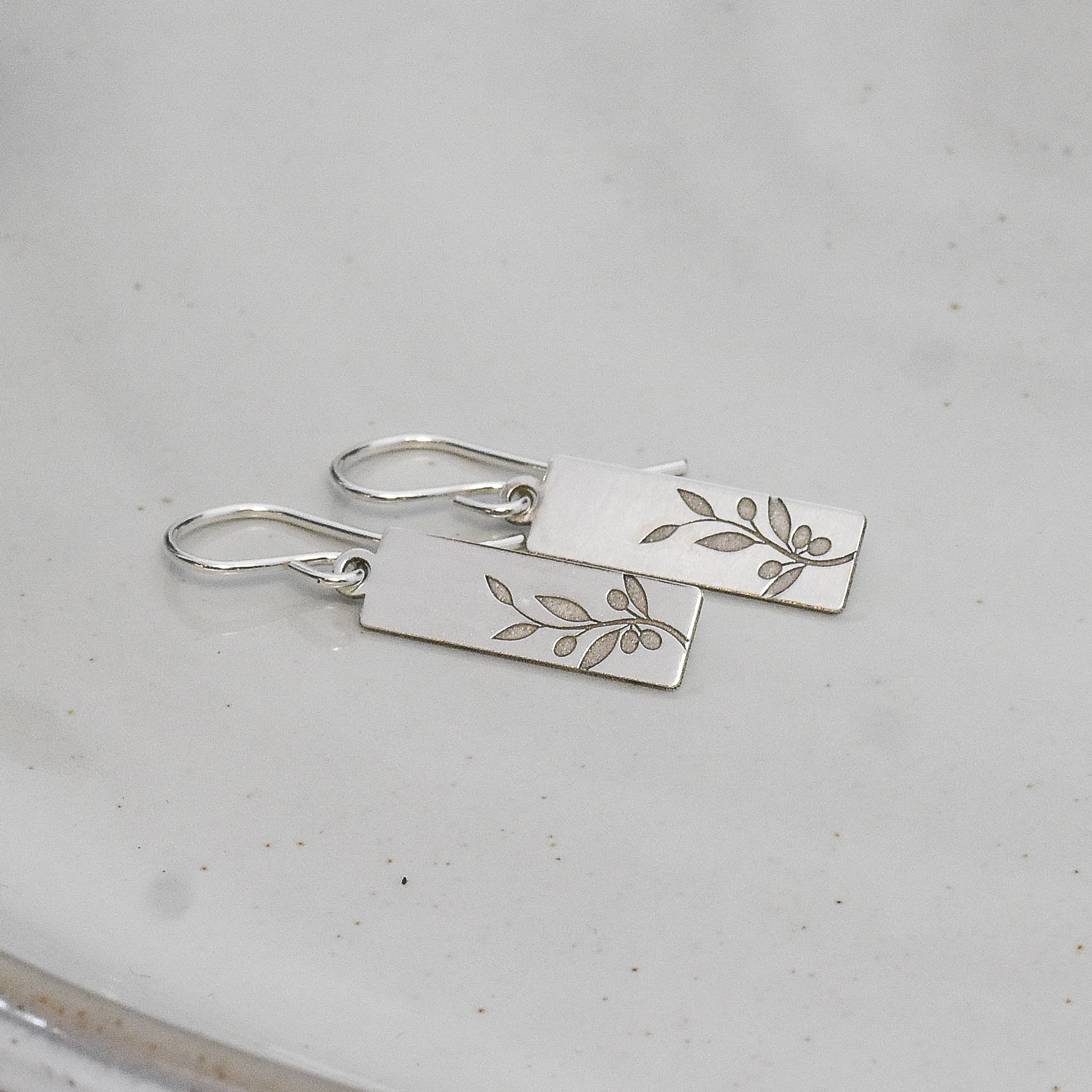 These artisanal Olive Branch Earrings are crafted with sterling silver to create a petite, minimalist design. Detailed with unique botanical engravings, the earrings are designed and cut in-house and can be customized with your choice of ear wire and size. Perfect for dainty jewelry enthusiasts.