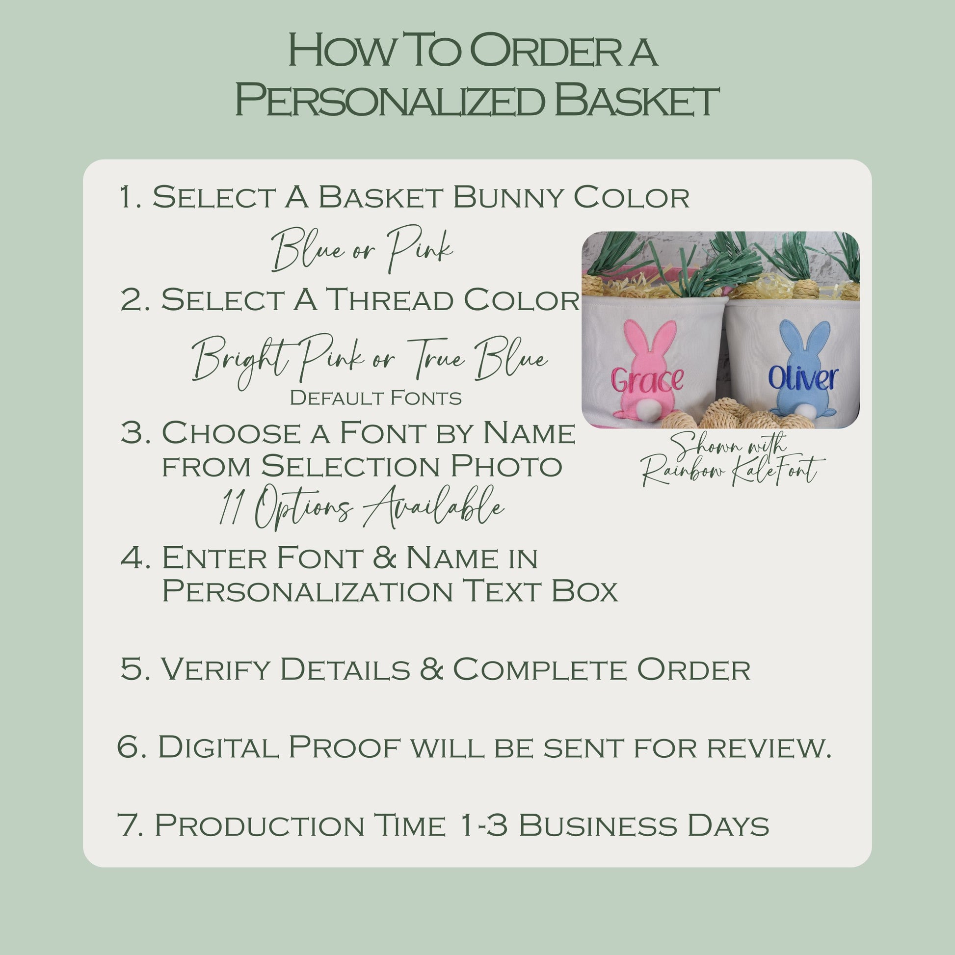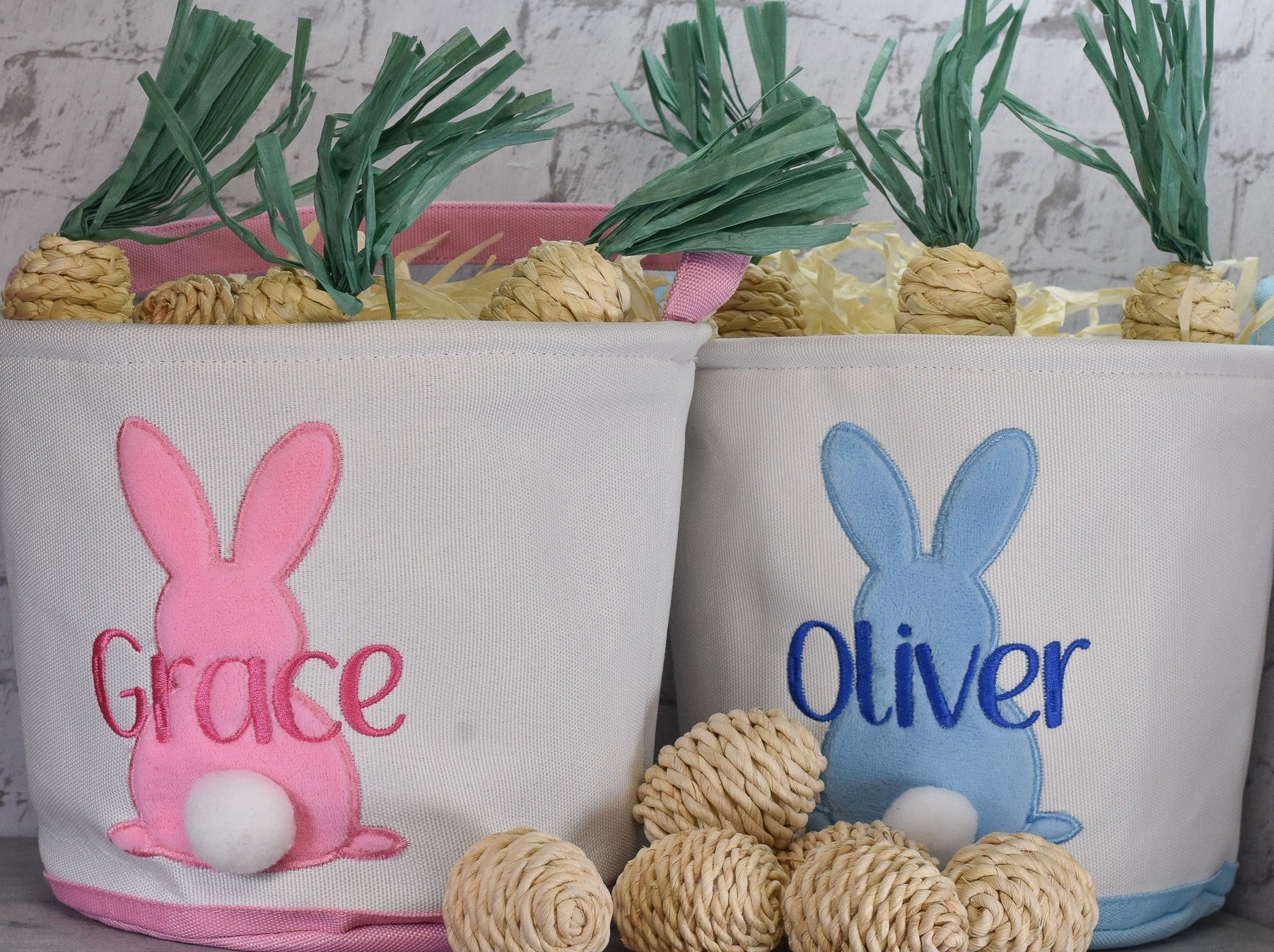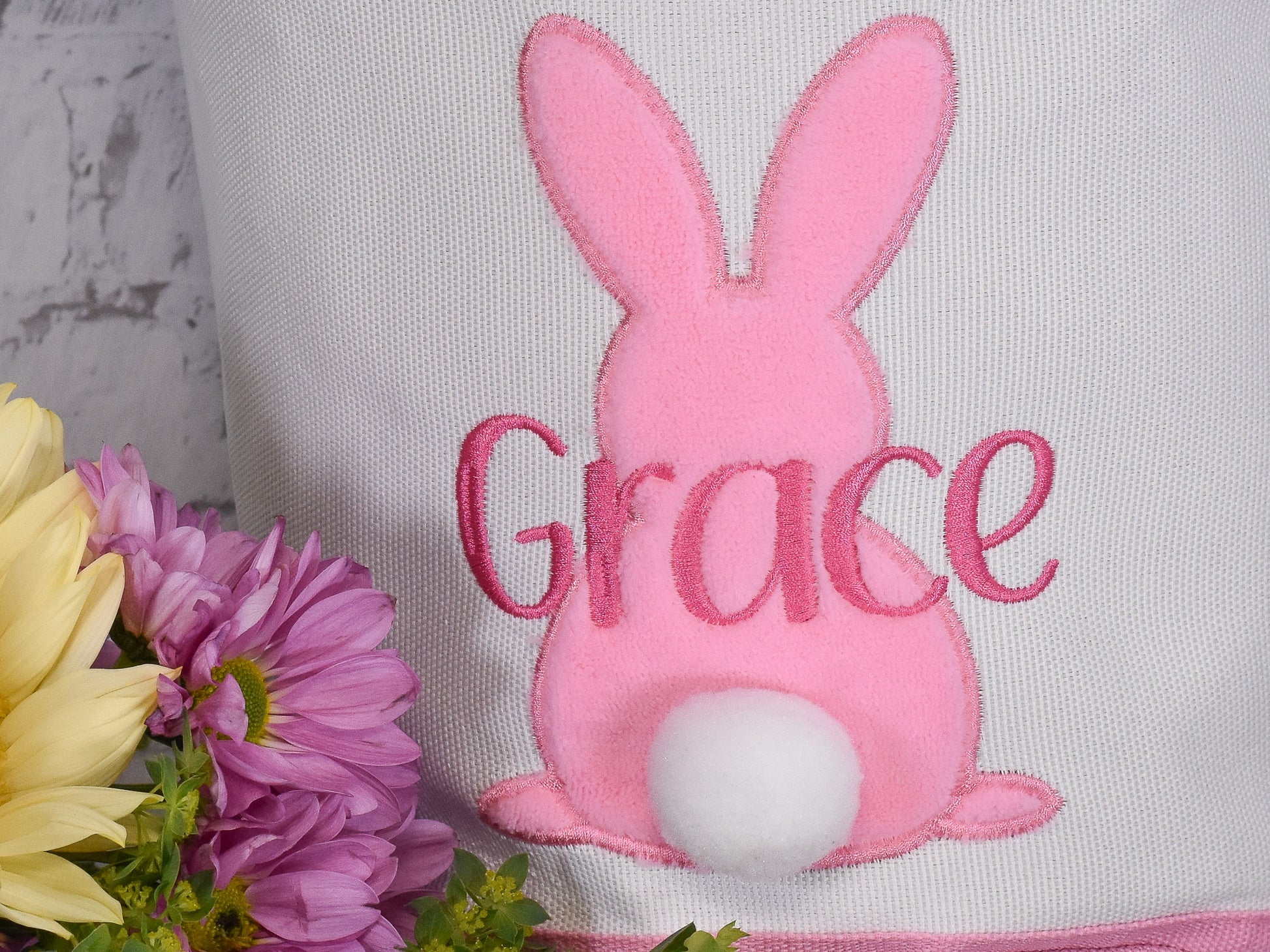 Show off your child's unique style with our Embroidered Easter Basket. This personalized canvas basket features a fuzzy bunny and tail, available in pink or blue, making it the perfect addition to your Easter egg hunt or gift basket. Customize with an embroidered name for a truly special touch.