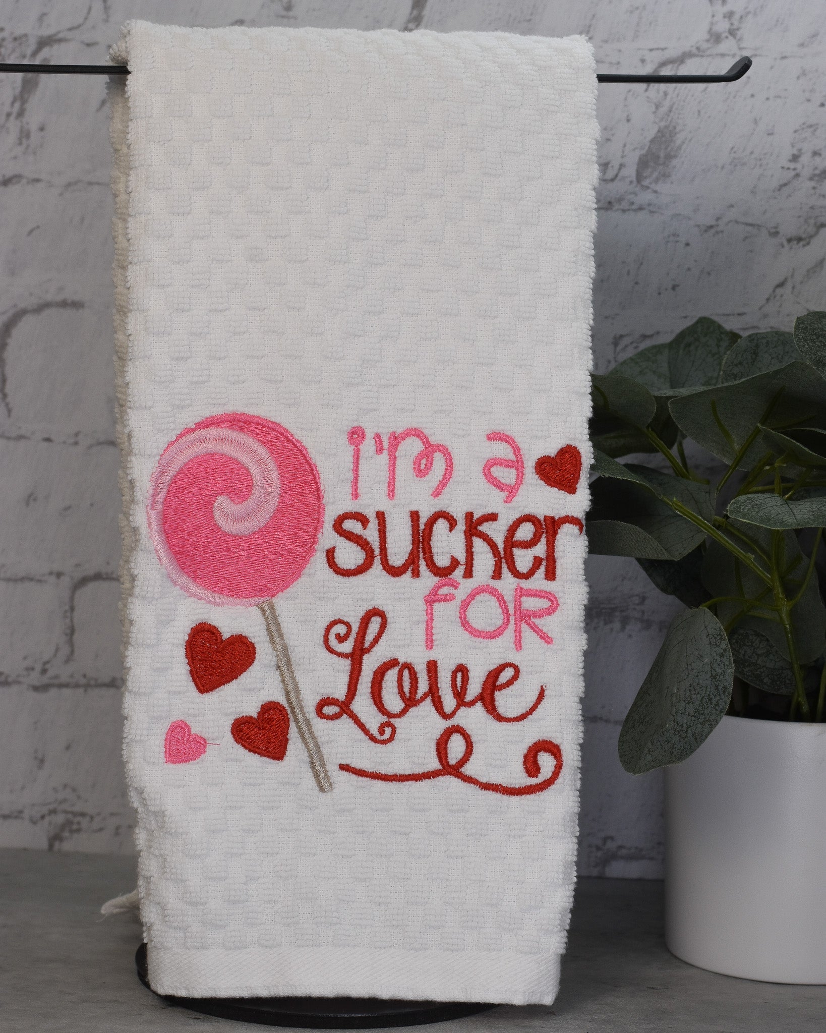 Add a touch of love to your kitchen or powder room with our Valentine's Day Hand Towel. Featuring a playful sucker for love design, this cotton towel is available in a variety of colors. Personalize it for a special touch. Expertly embroidered for a lasting finish.