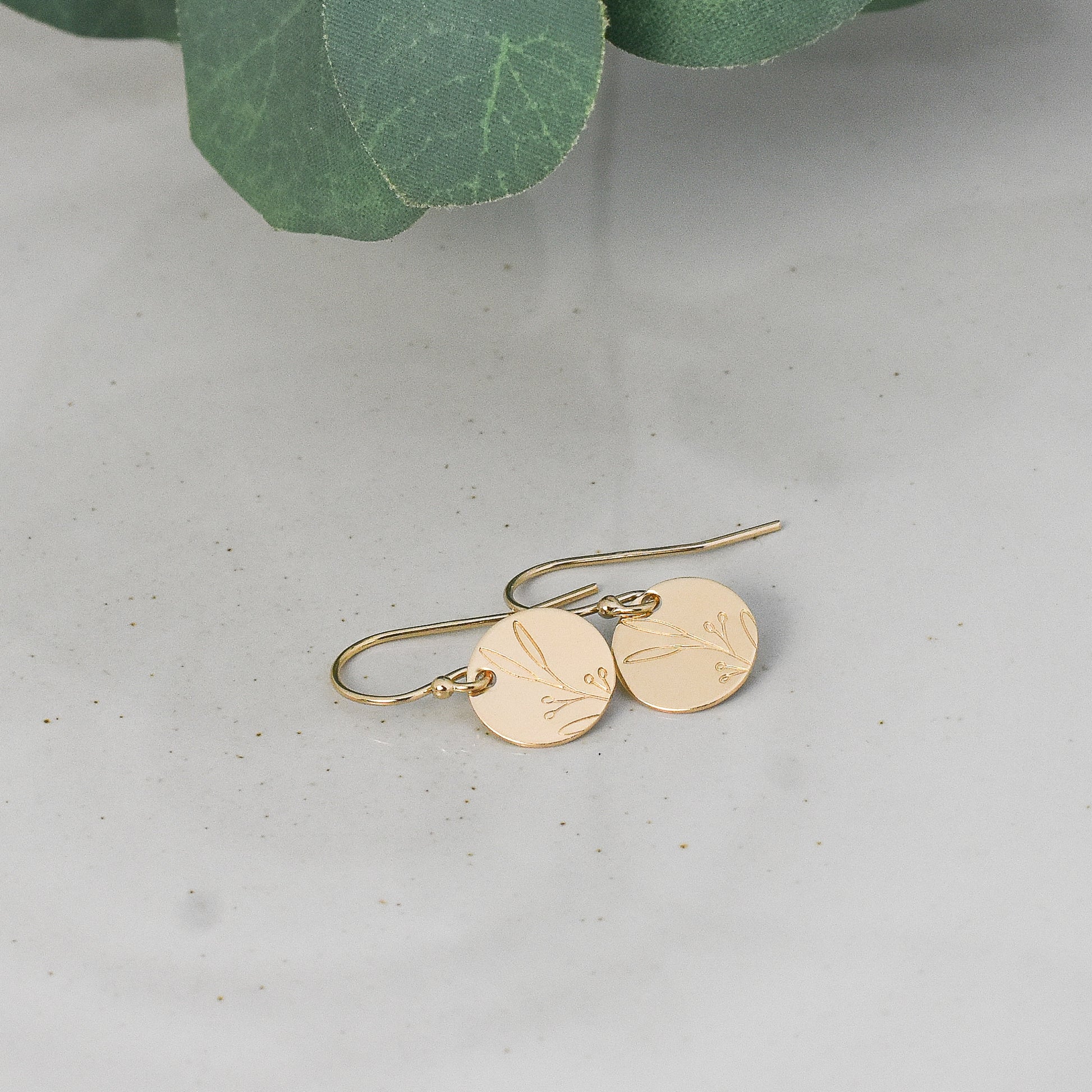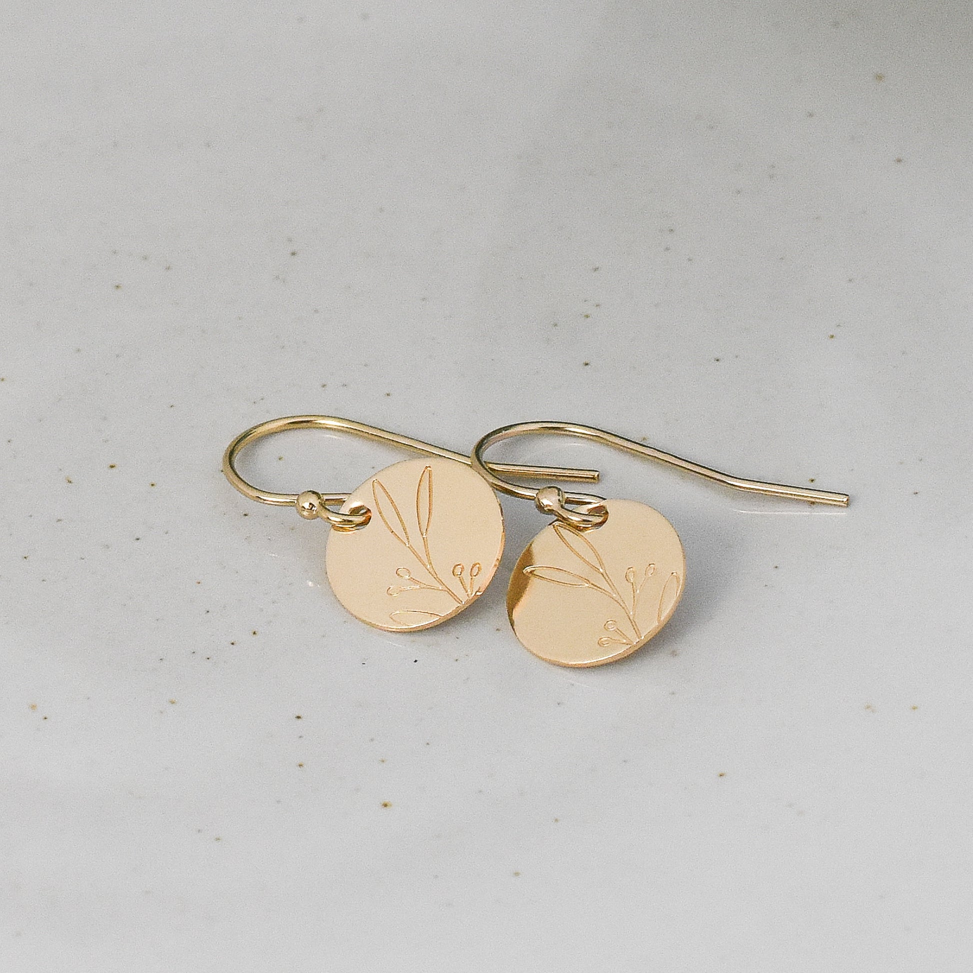 Add a graceful touch to your everyday look with these tiny, botanical-inspired earrings. Hand-crafted with your choice of gold-filled or sterling silver, they feature custom stamping for a unique look. Petite and lightweight, they are perfect for daily wear and sure to be a timeless addition to your wardrobe. Choice of french hook or lever back ear wires.
