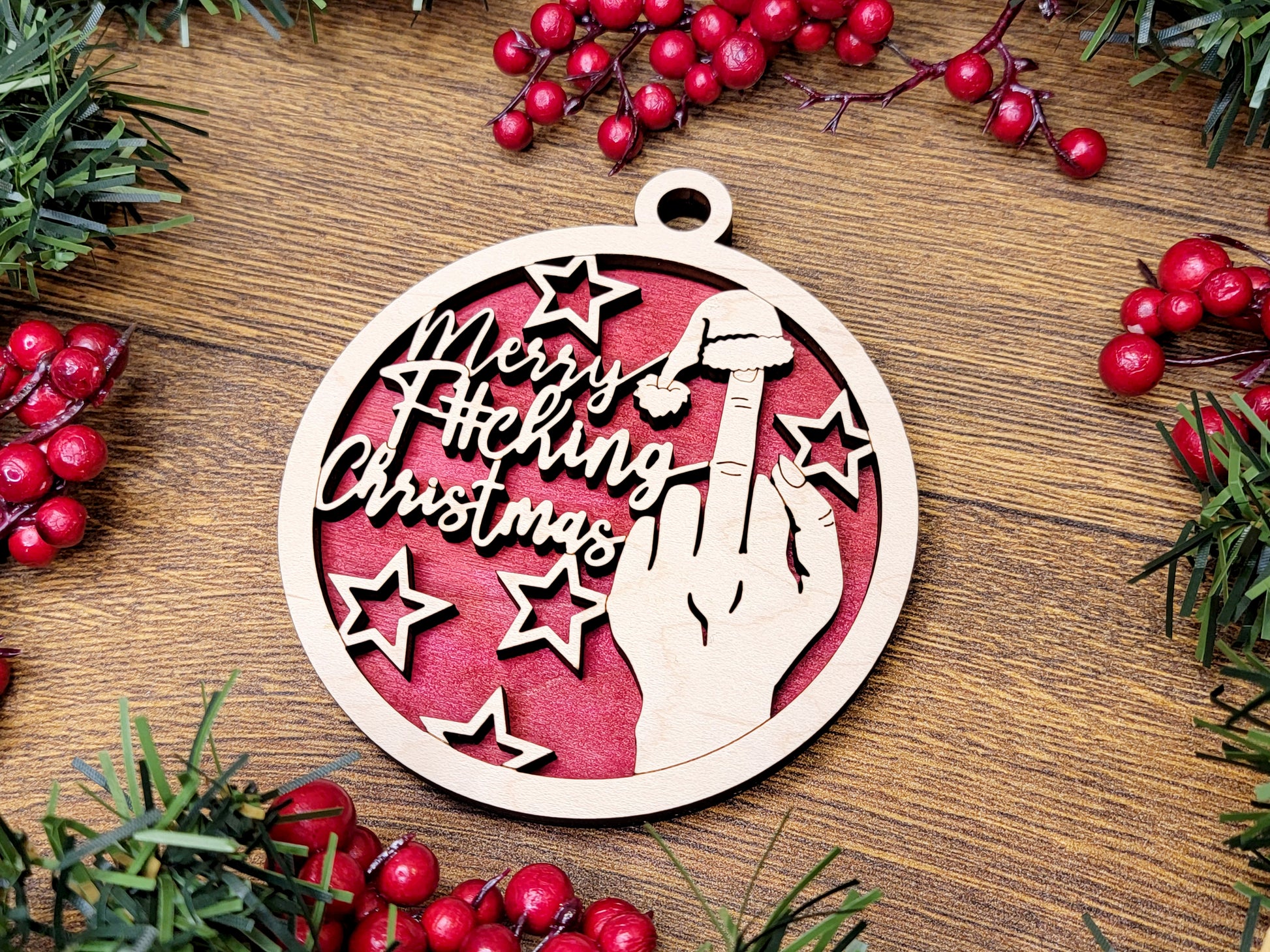 Celebrate the holidays with irreverent humor using this bold Merry F-ing Christmas ornament. Crafted from eco-friendly materials, this statement piece features a cheeky middle finger design that brings playful attitude to your tree. Customize your ornament with a color backplate that matches your décor or personal style. Perfect for those who appreciate witty, unconventional holiday spirit. A conversation-starting decoration that combines sustainability with sass.