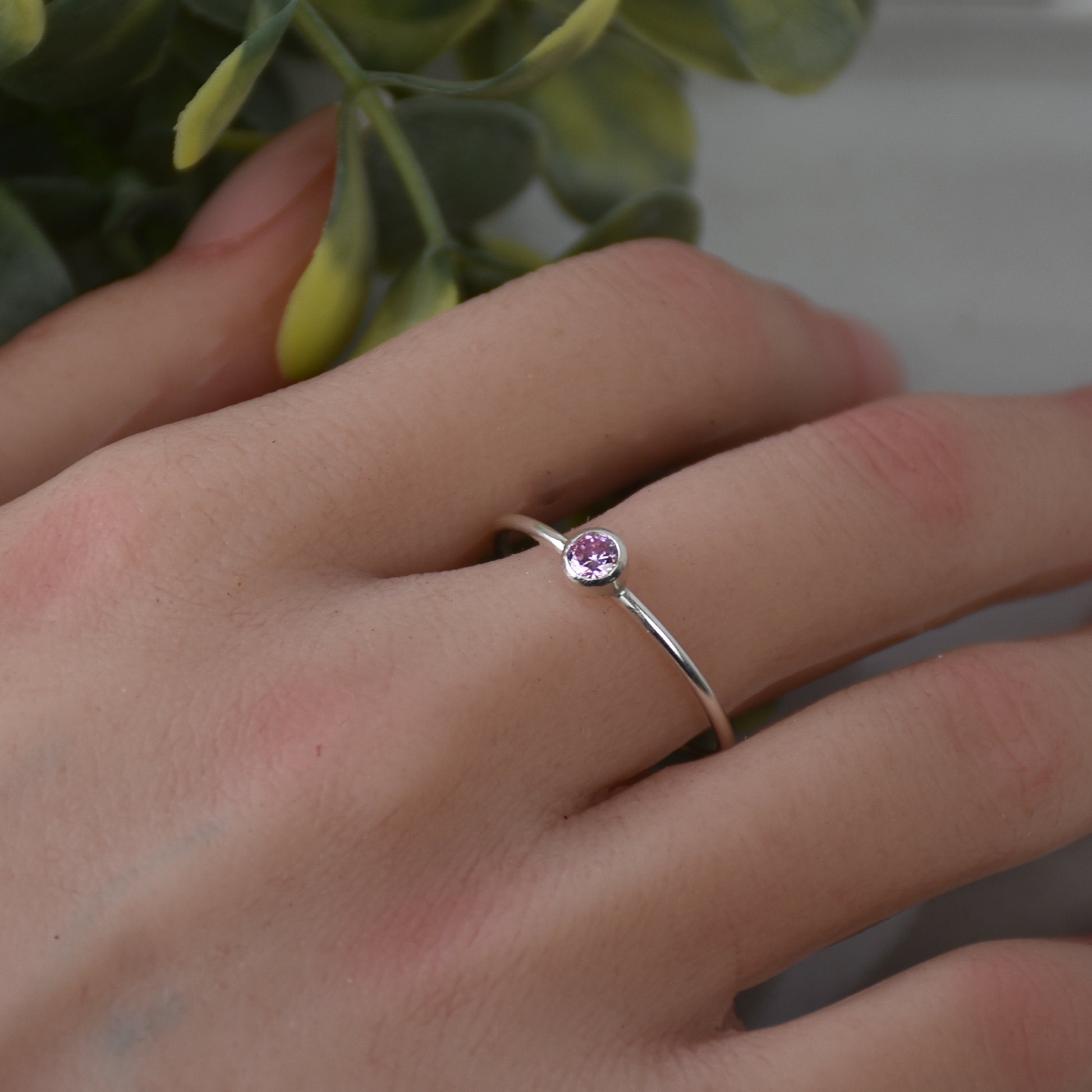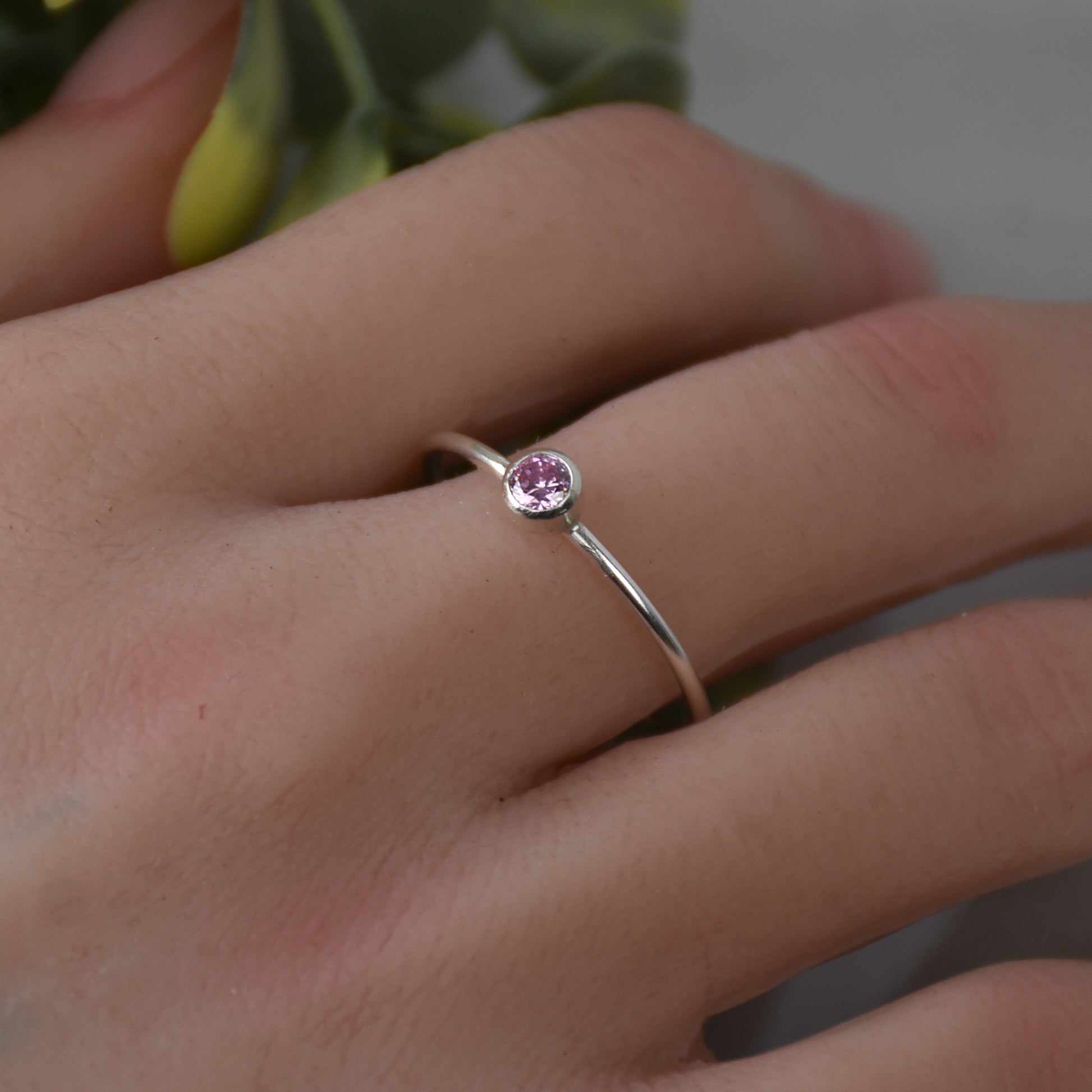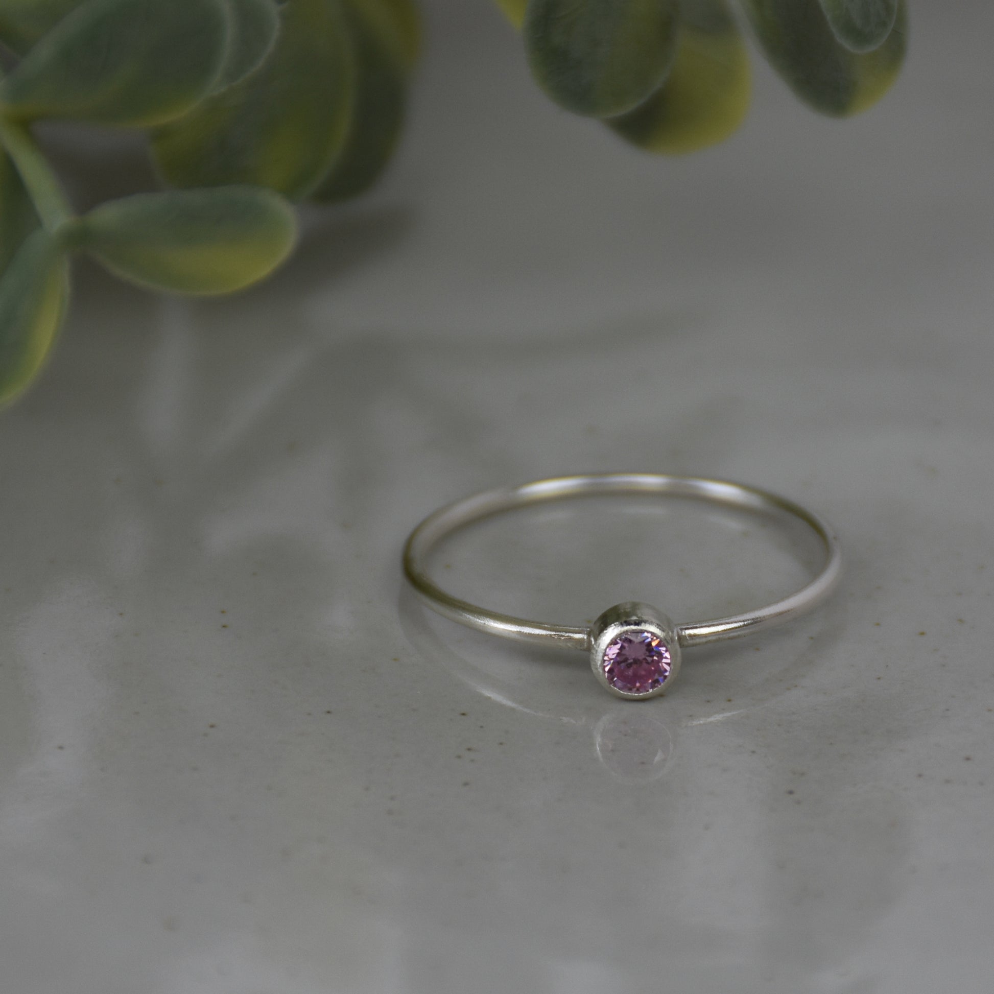 This October birthstone stacking ring features a sparkling pink cubic zirconia stone, bezel set in high-quality sterling silver. its custom sizing allows for the perfect fit, making it an ideal gift for those born in October. Upgrade your birthday jewelry collection with this elegant and timeless piece.