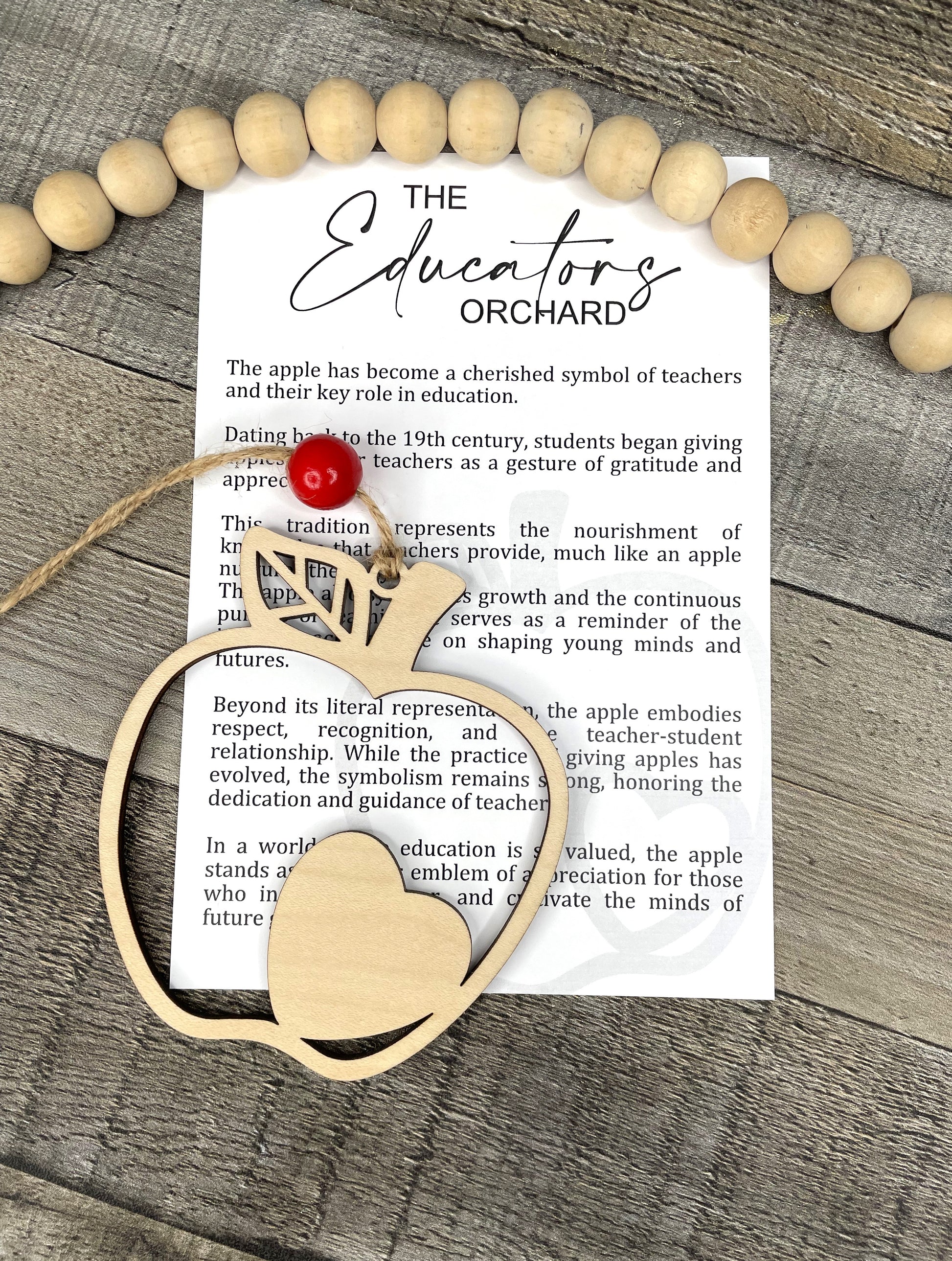 This Apple Ornament or Charm is a beautifully crafted piece made from laser cut maple wood. With its intricate design and durable material, it can be used as an elegant ornament or a meaningful charm. Each charm comes with a card containing the story of The Educators' Orchard making it a perfect gift for anyone seeking inspiration and guidance.