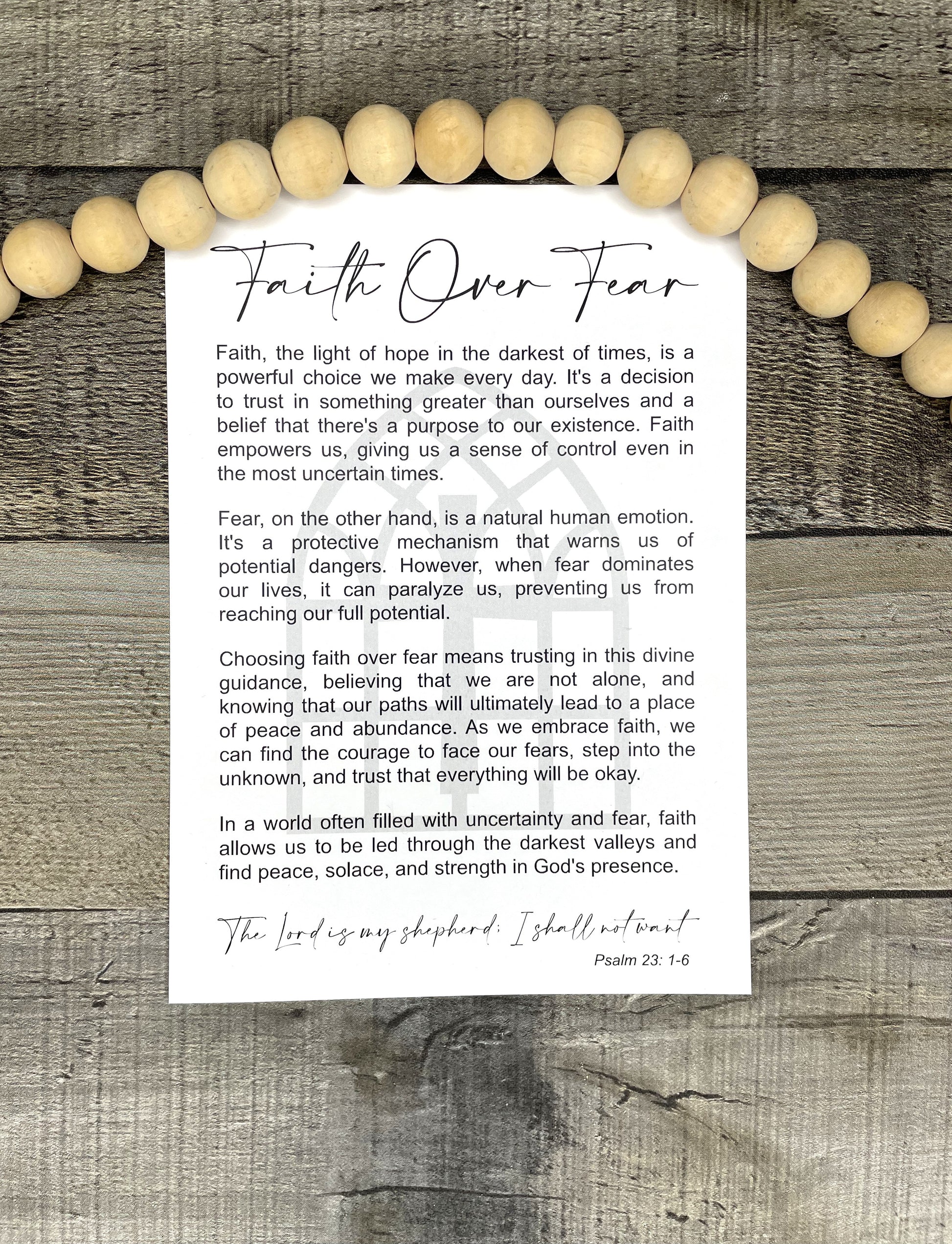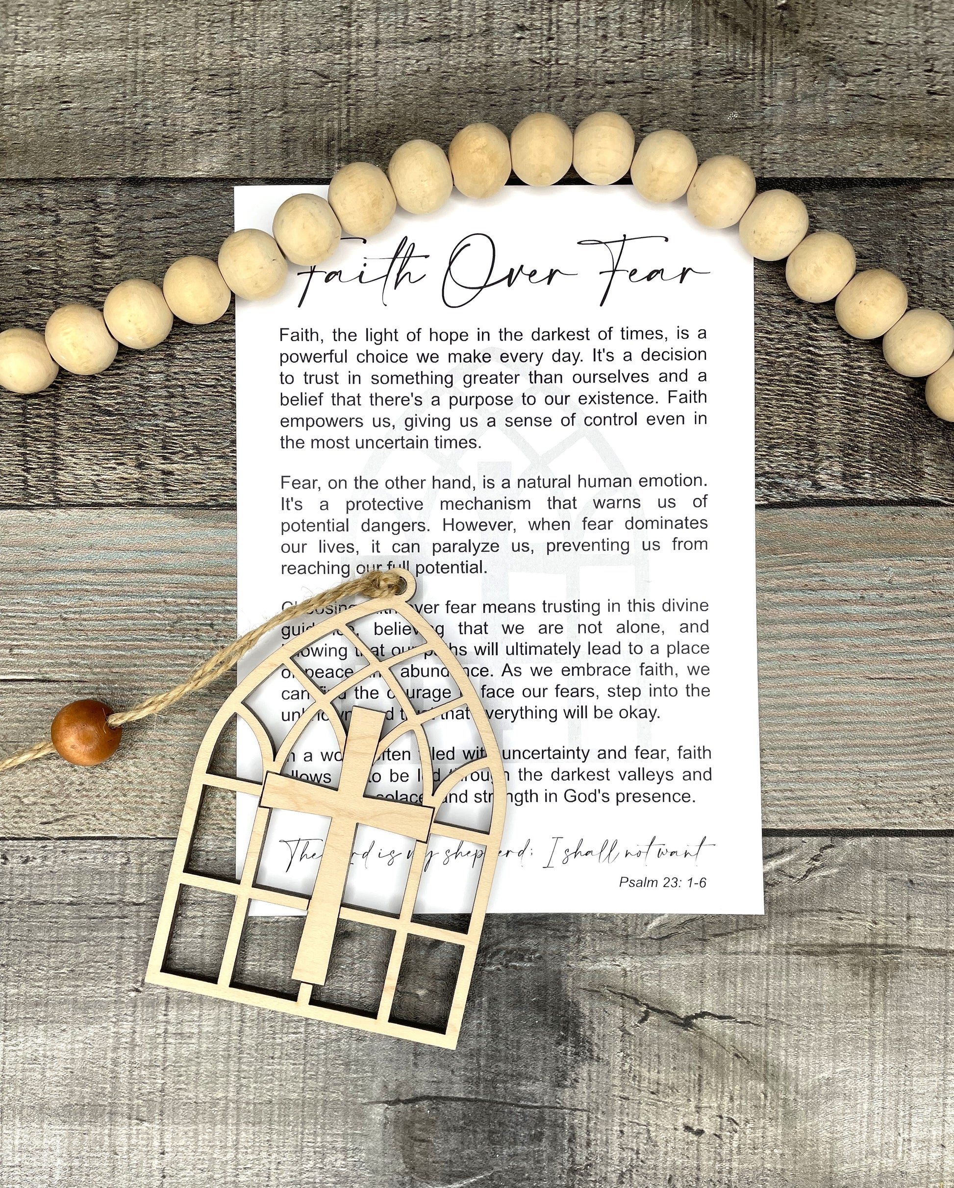 This Cathedral Window Ornament or Charm is a beautifully crafted piece made from laser cut maple wood. With its intricate design and durable material, it can be used as an elegant ornament or a meaningful charm. Each charm comes with a card containing the story of Faith Over Fear making it a perfect gift for anyone seeking inspiration and guidance.