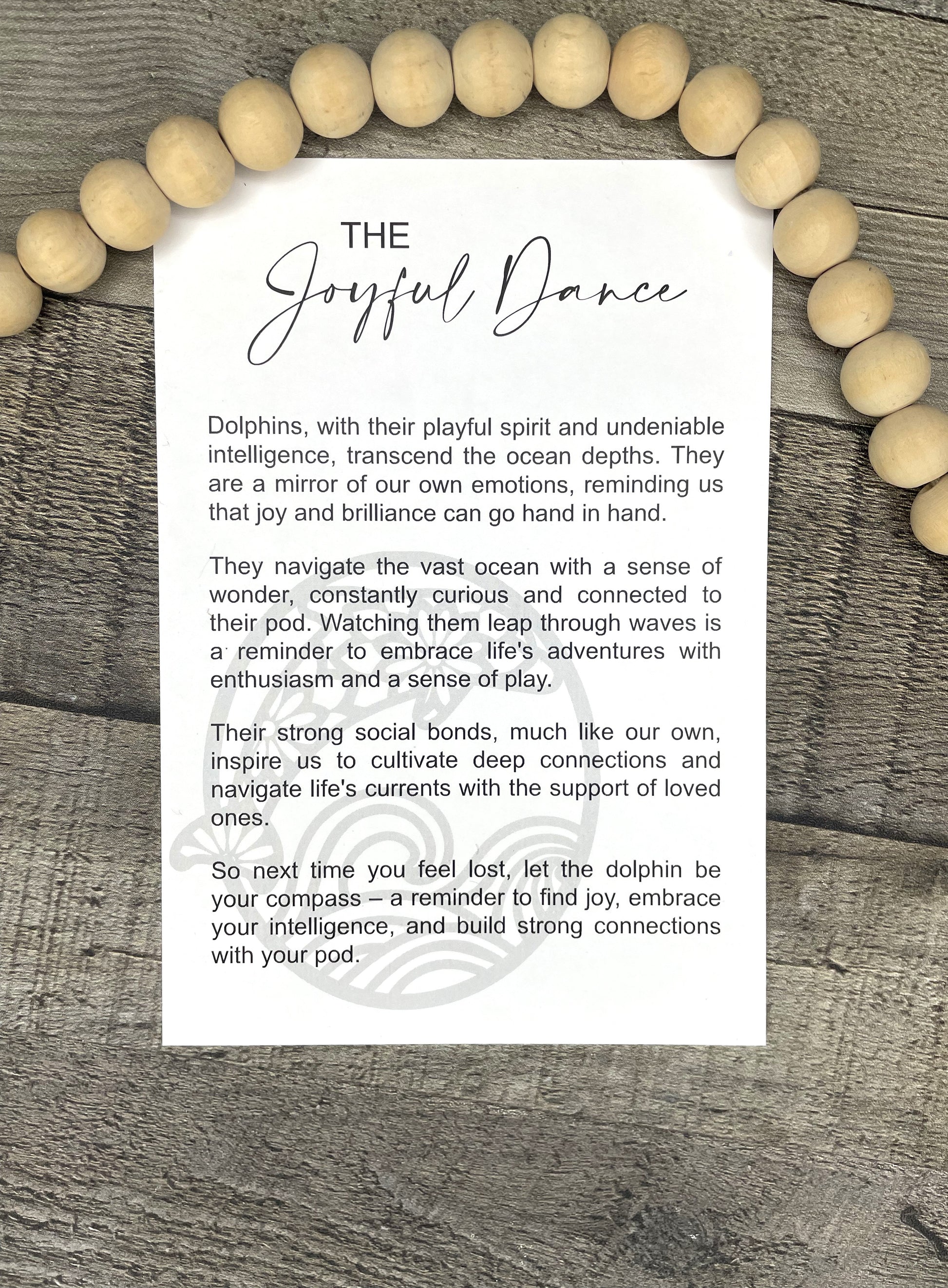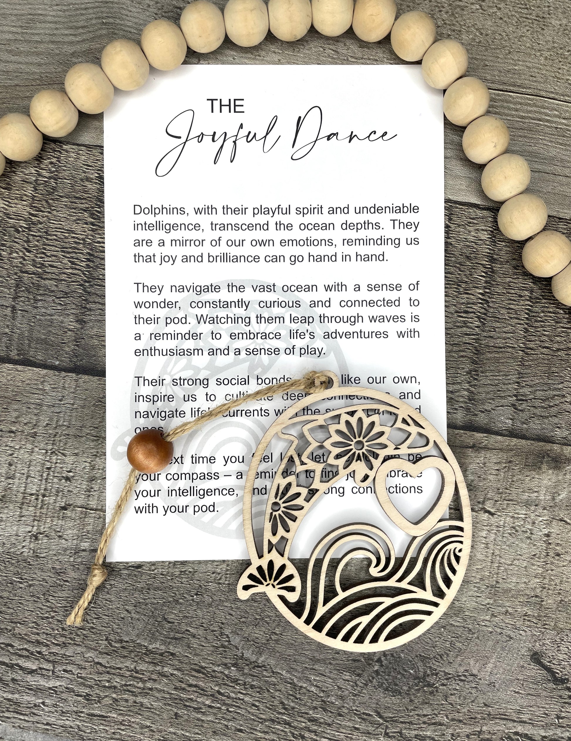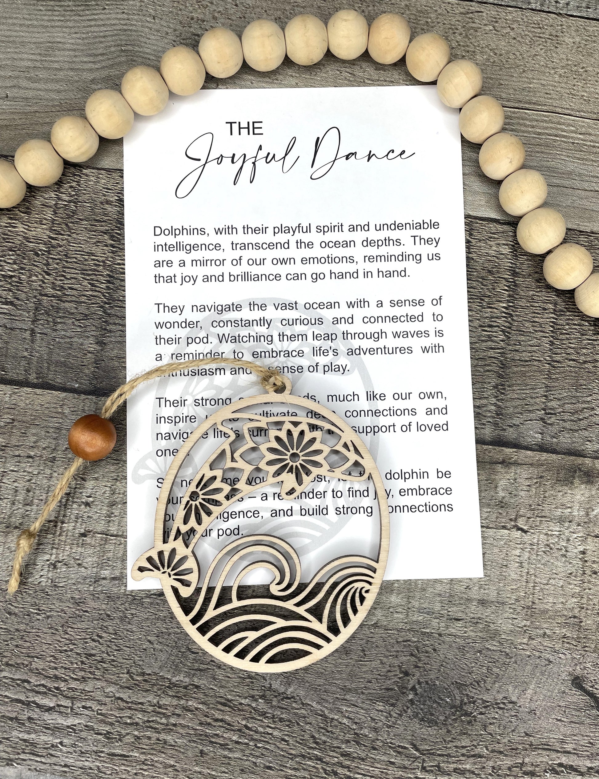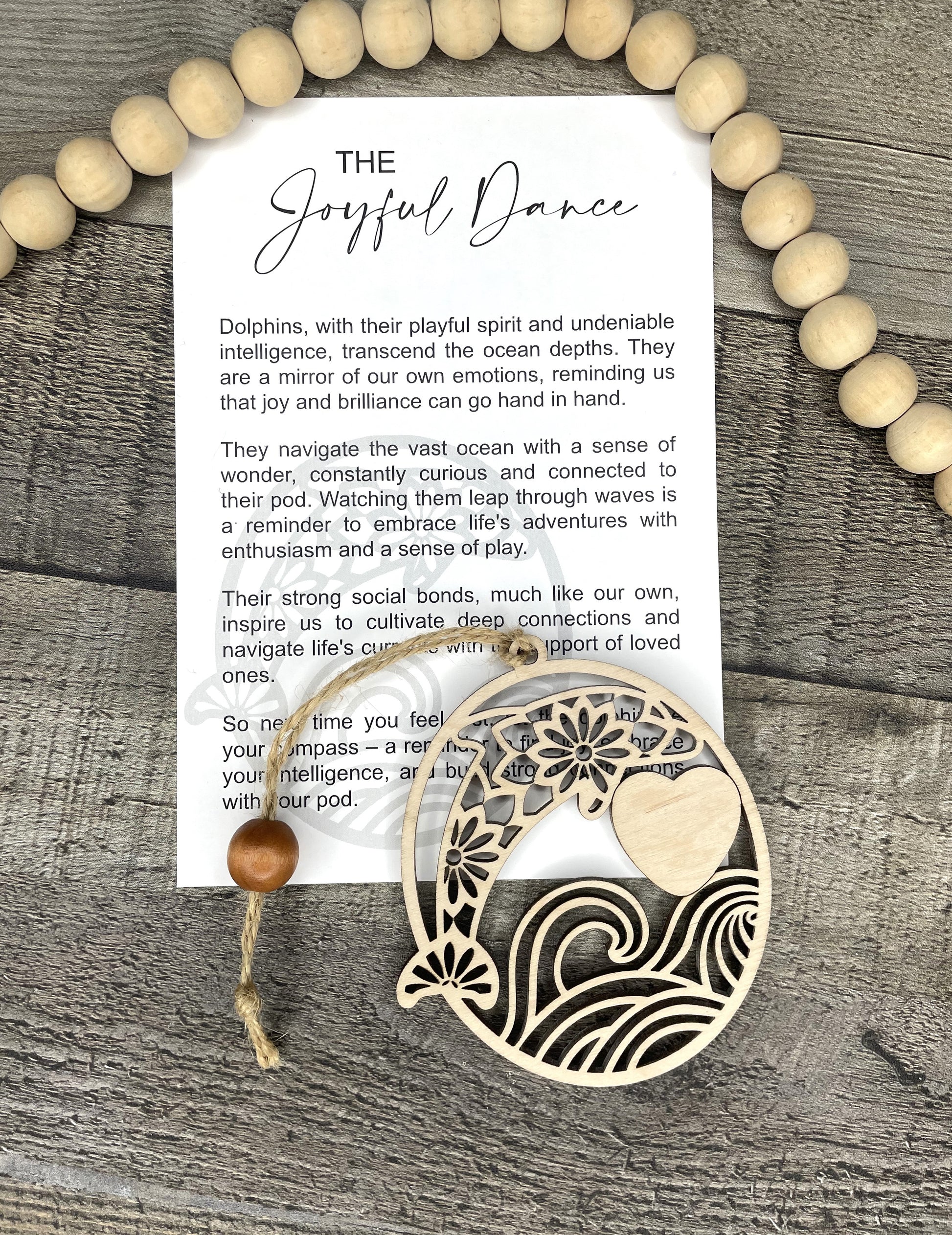 This Dolphin Ornament or Charm is a beautifully crafted piece made from laser cut maple wood. With its intricate design and durable material, it can be used as an elegant ornament or a meaningful charm. Each charm comes with a card containing the story of The Joyful Dance making it a perfect gift for anyone seeking inspiration and guidance.