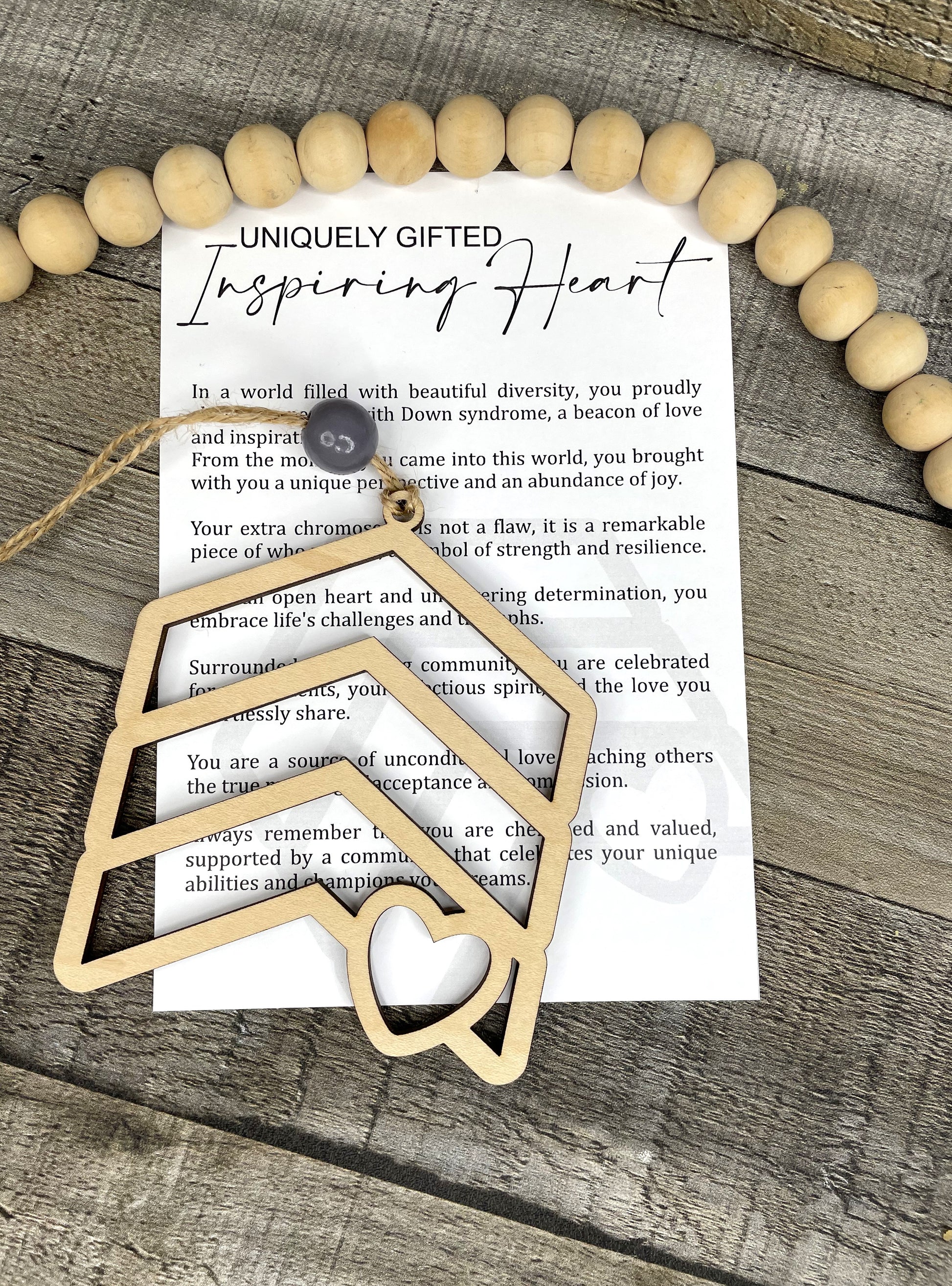 This Down Syndrome Ornament or Charm is a beautifully crafted piece made from laser cut maple wood. With its intricate design and durable material, it can be used as an elegant ornament or a meaningful charm. Each charm comes with a card containing the story of the Uniquely Gifted Inspiring Heart making it a perfect gift for anyone seeking inspiration and guidance.