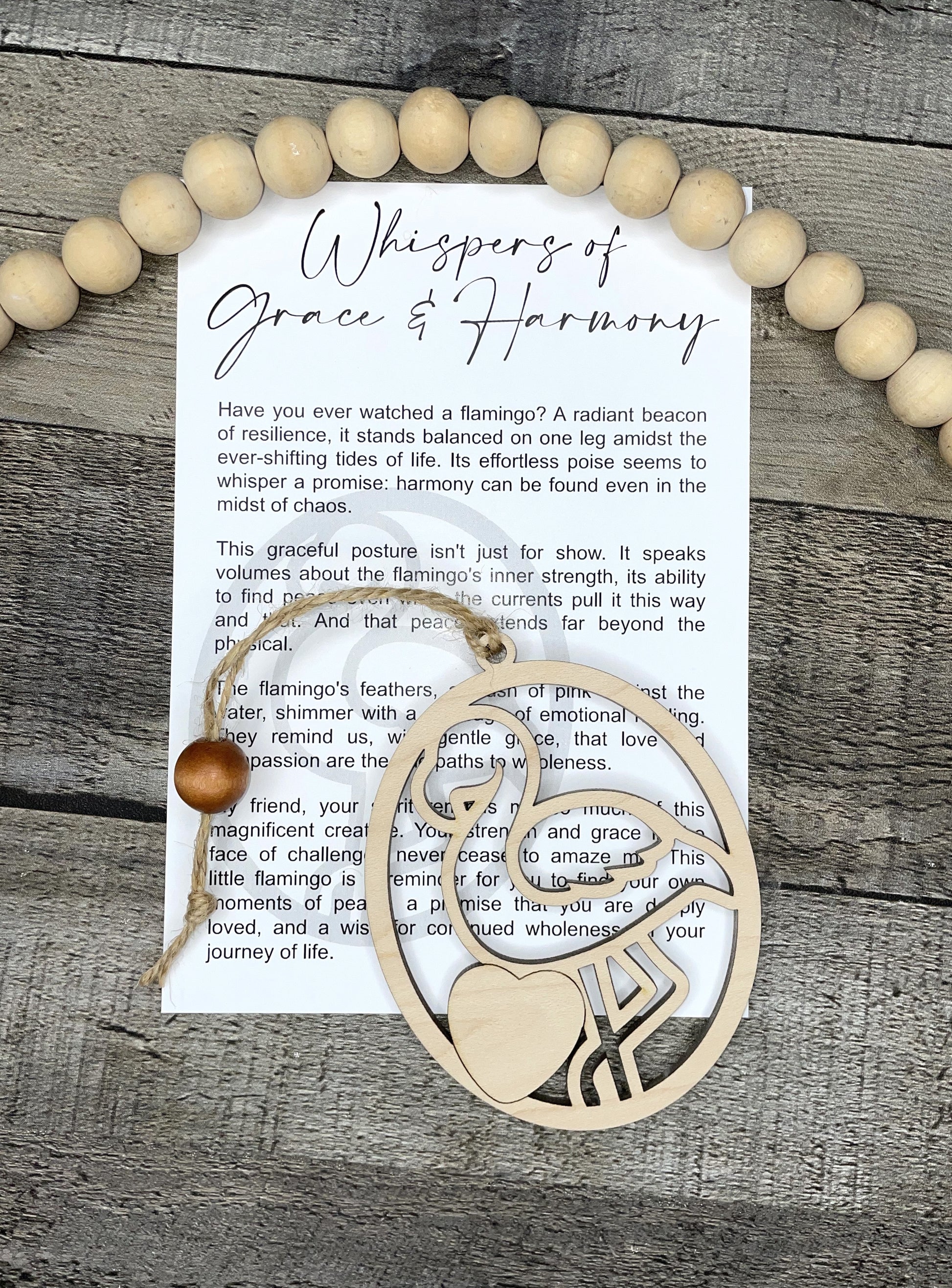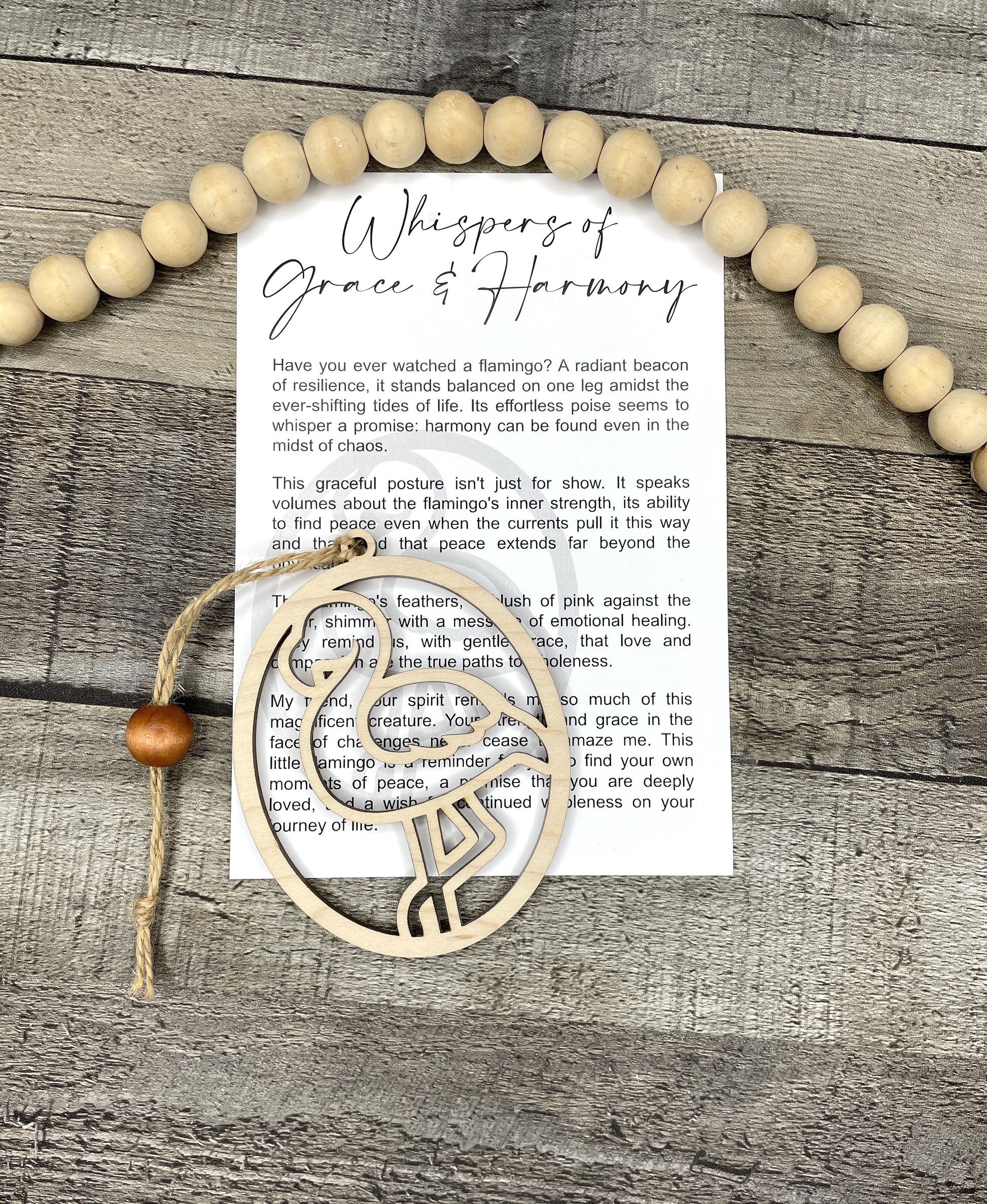 This Flamingo Ornament or Charm is a beautifully crafted piece made from laser cut maple wood. With its intricate design and durable material, it can be used as an elegant ornament or a meaningful charm. Each charm comes with a card containing the story of Whispers of Grace & Harmony making it a perfect gift for anyone seeking inspiration and guidance.