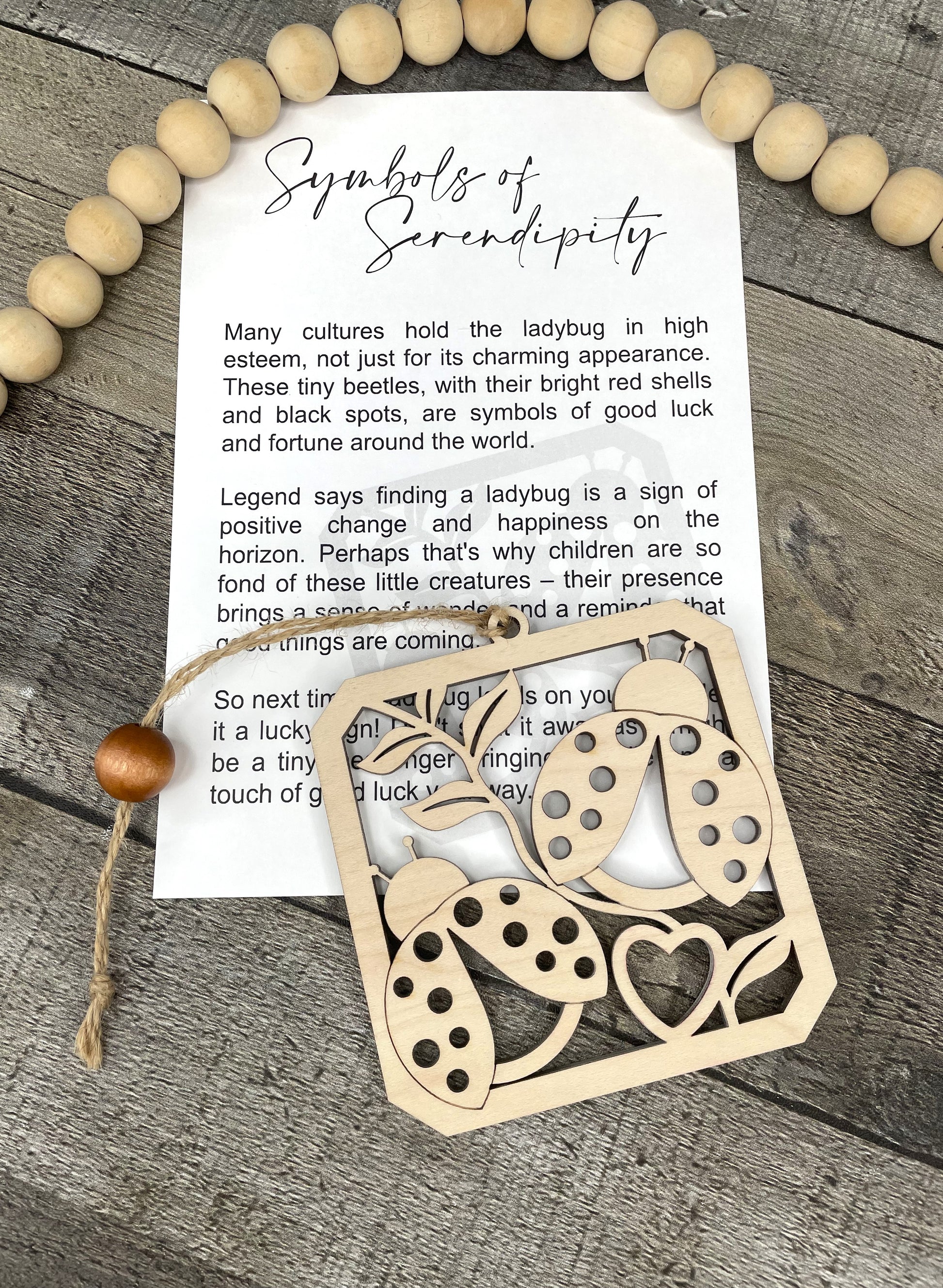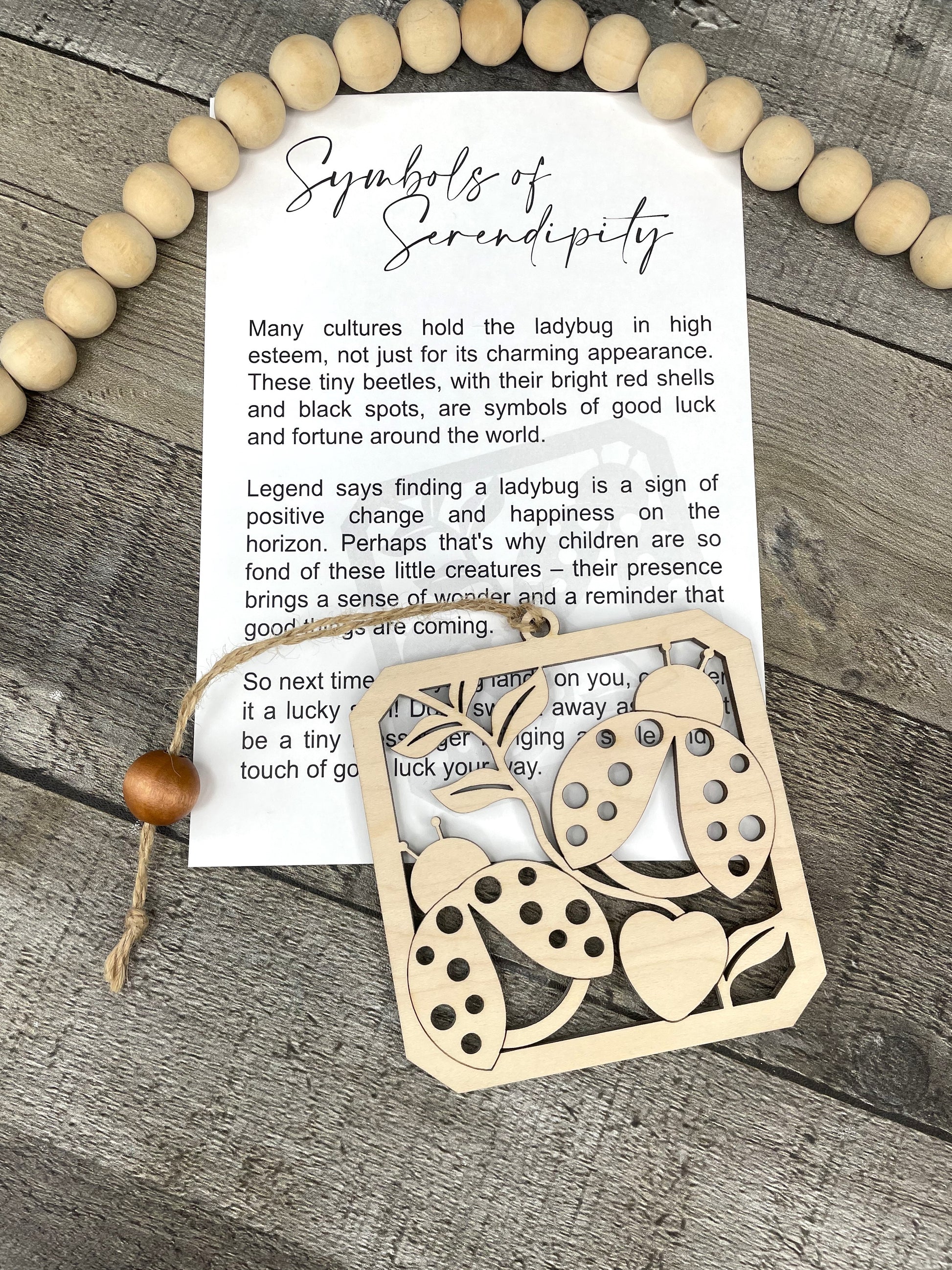 This Ladybug Ornament or Charm is a beautifully crafted piece made from laser cut maple wood. With its intricate design and durable material, it can be used as an elegant ornament or a meaningful charm. Each charm comes with a card containing the story of Symbols of Serendipity making it a perfect gift for anyone seeking inspiration and guidance.