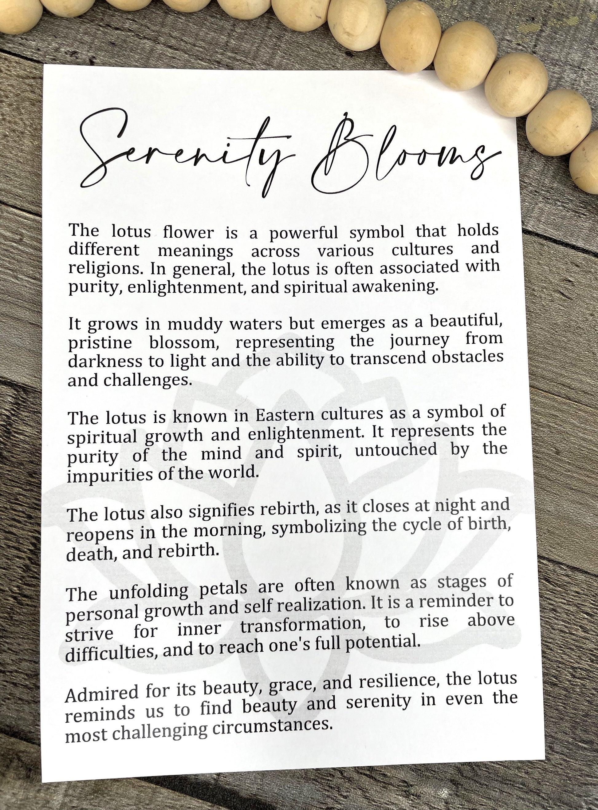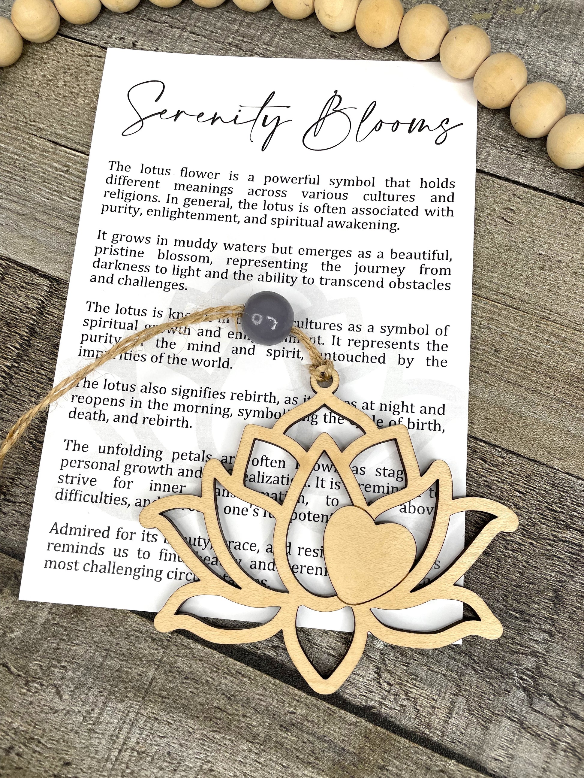 This Lotus Flower Ornament or Charm is a beautifully crafted piece made from laser cut maple wood. With its intricate design and durable material, it can be used as an elegant ornament or a meaningful charm. Each charm comes with a card containing the story of Serenity Blooms making it a perfect gift for anyone seeking inspiration and guidance.
