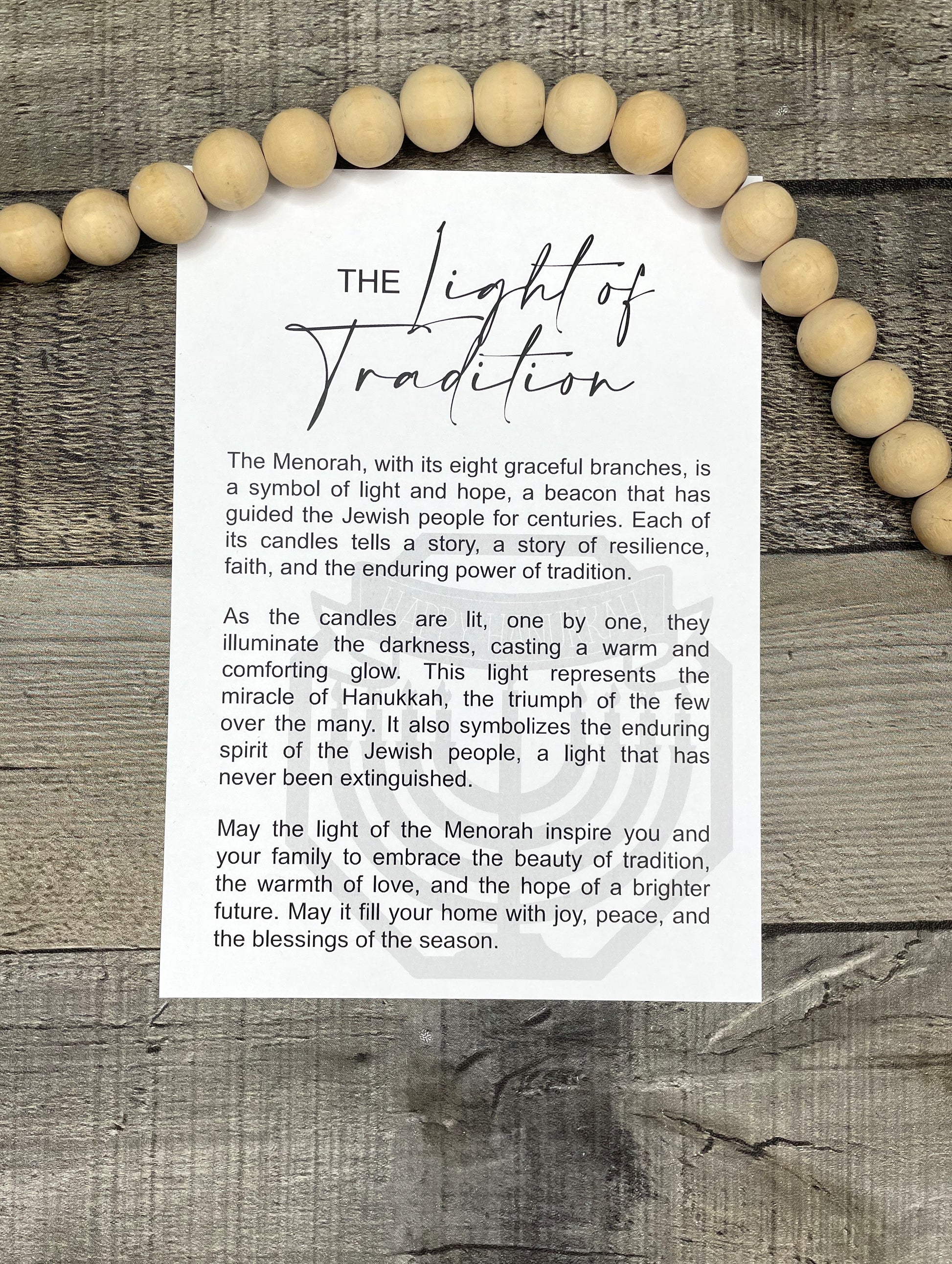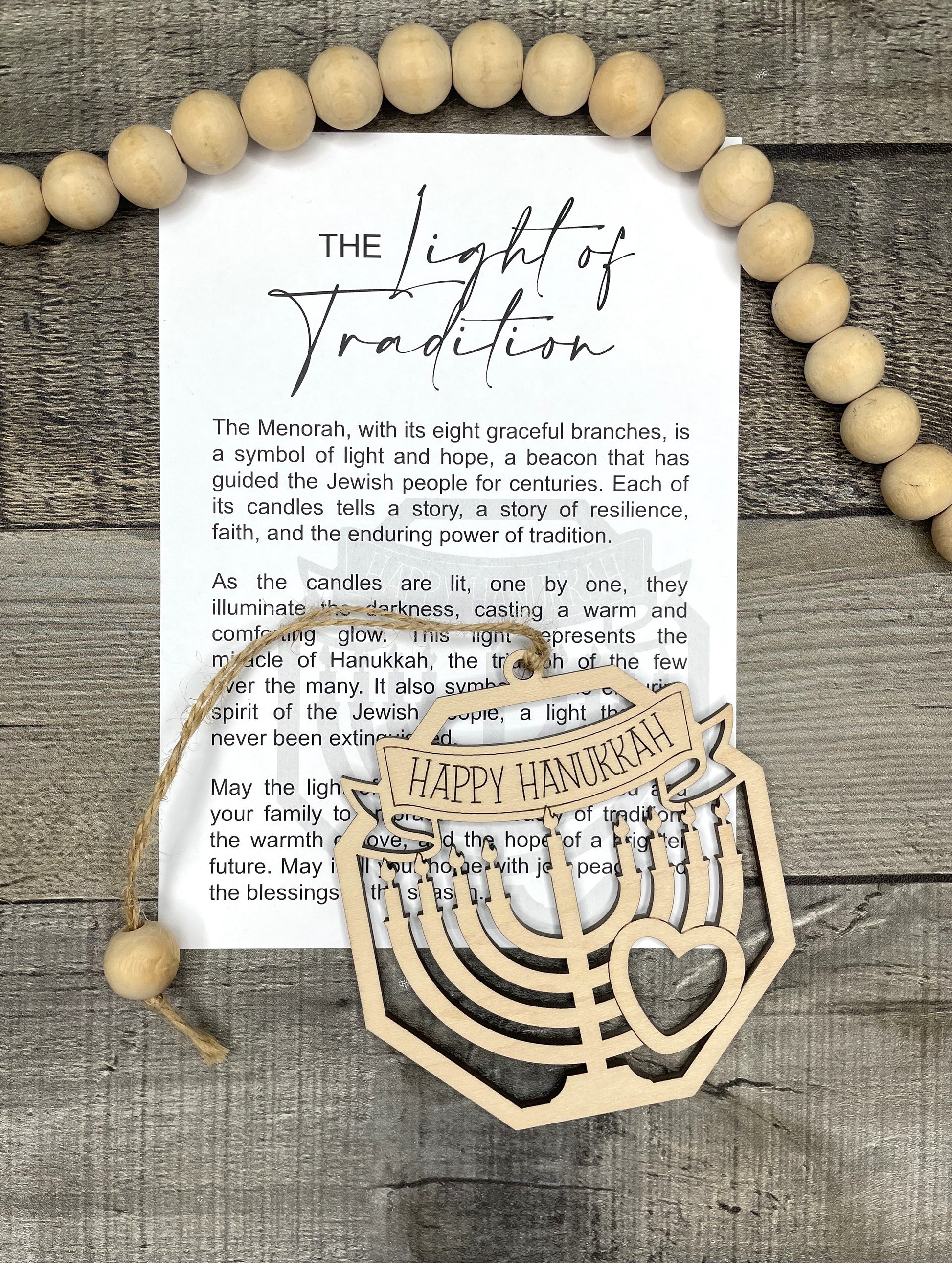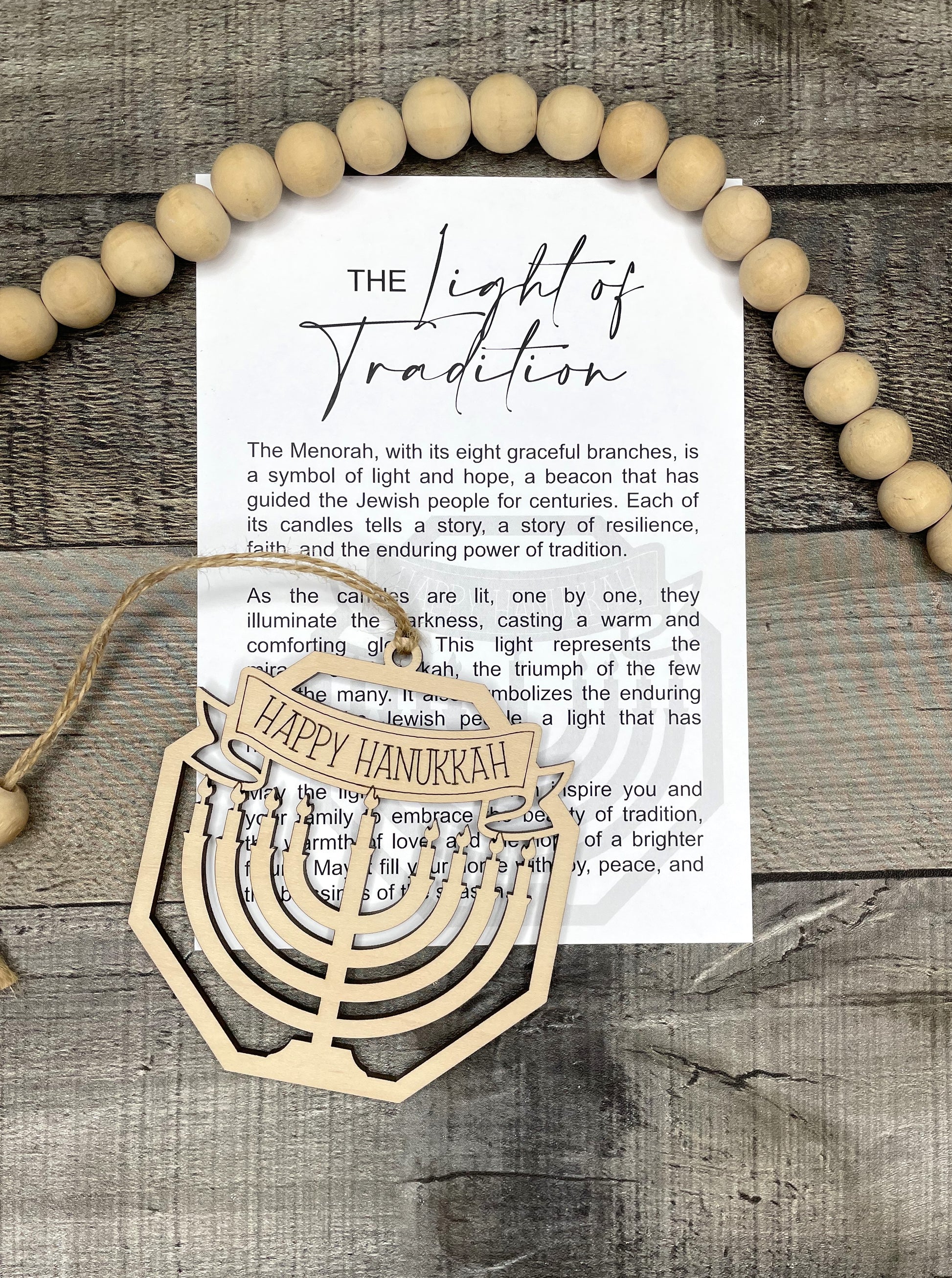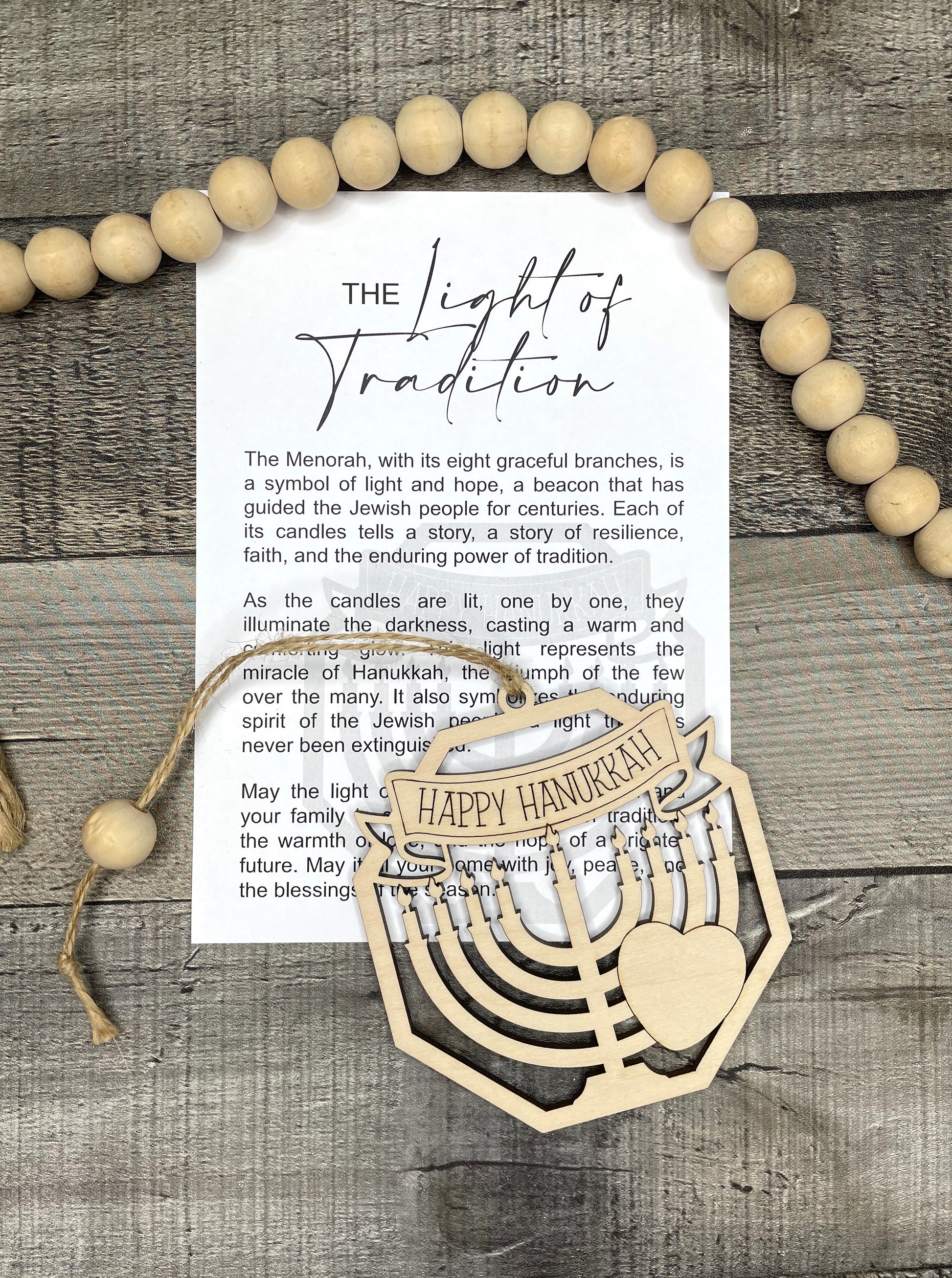 This Menorah Ornament or Charm is a beautifully crafted piece made from laser cut maple wood. With its intricate design and durable material, it can be used as an elegant ornament or a meaningful charm. Each charm comes with a card containing the story of the The Light of Tradition making it a perfect gift for anyone seeking inspiration and guidance.