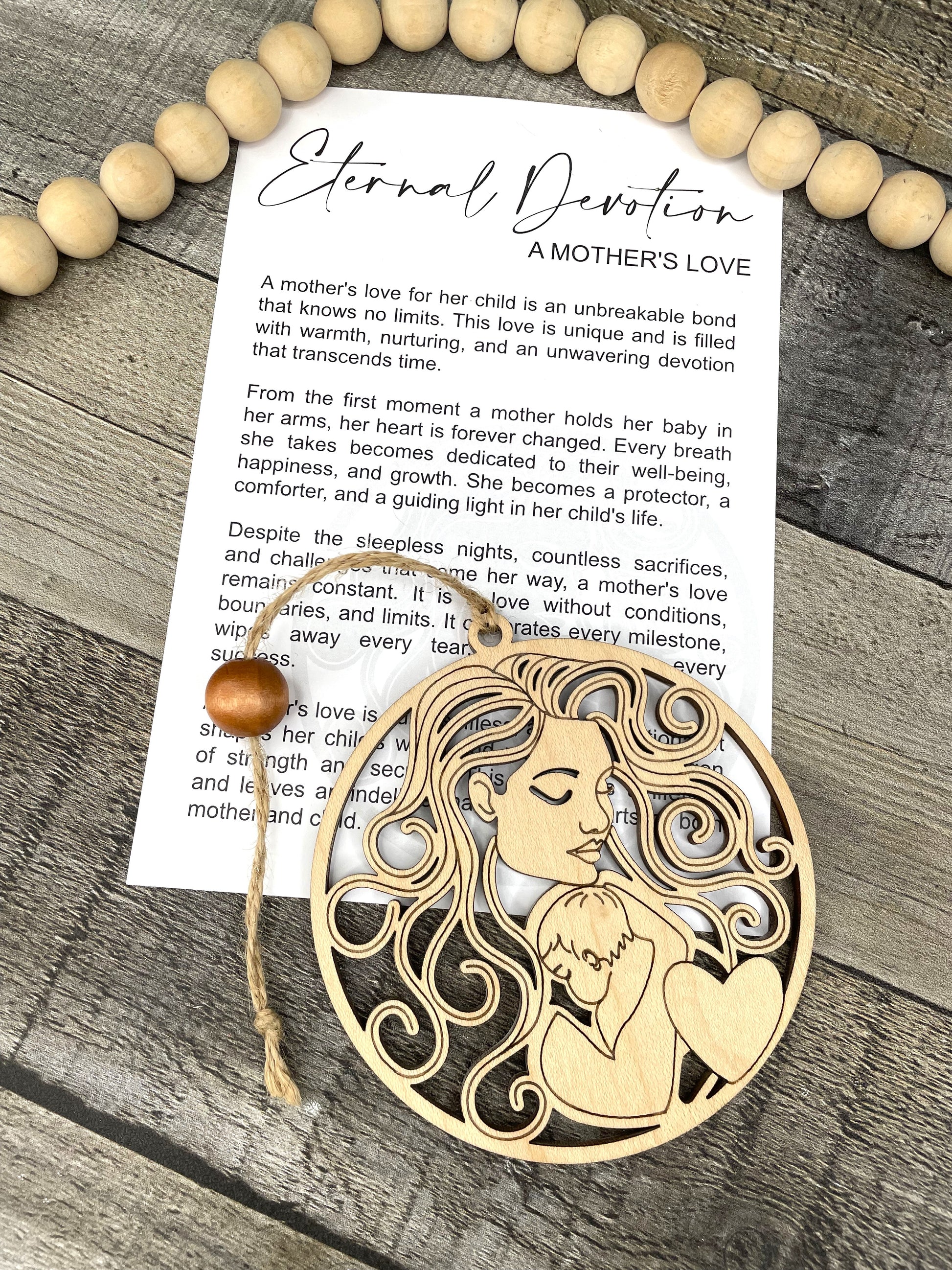 New Mom Charm or Ornament is a beautifully crafted piece made from laser cut maple wood. With its intricate design and durable material, it can be used as an elegant ornament or a meaningful charm. Each charm comes with a card containing the story of Eternal Devotion of Mother's Love making it a perfect gift for anyone seeking inspiration and guidance.