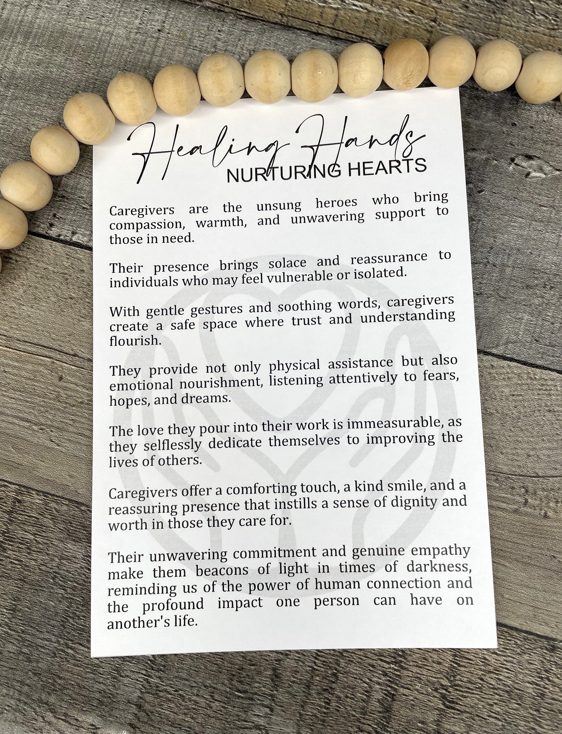 This Caregiver Ornament or Charm is a beautifully crafted piece made from laser cut maple wood. With its intricate design and durable material, it can be used as an elegant ornament or a meaningful charm. Each charm comes with a card containing the story of Healing Hands Nurturing Hearts making it a perfect gift for anyone seeking inspiration and guidance.