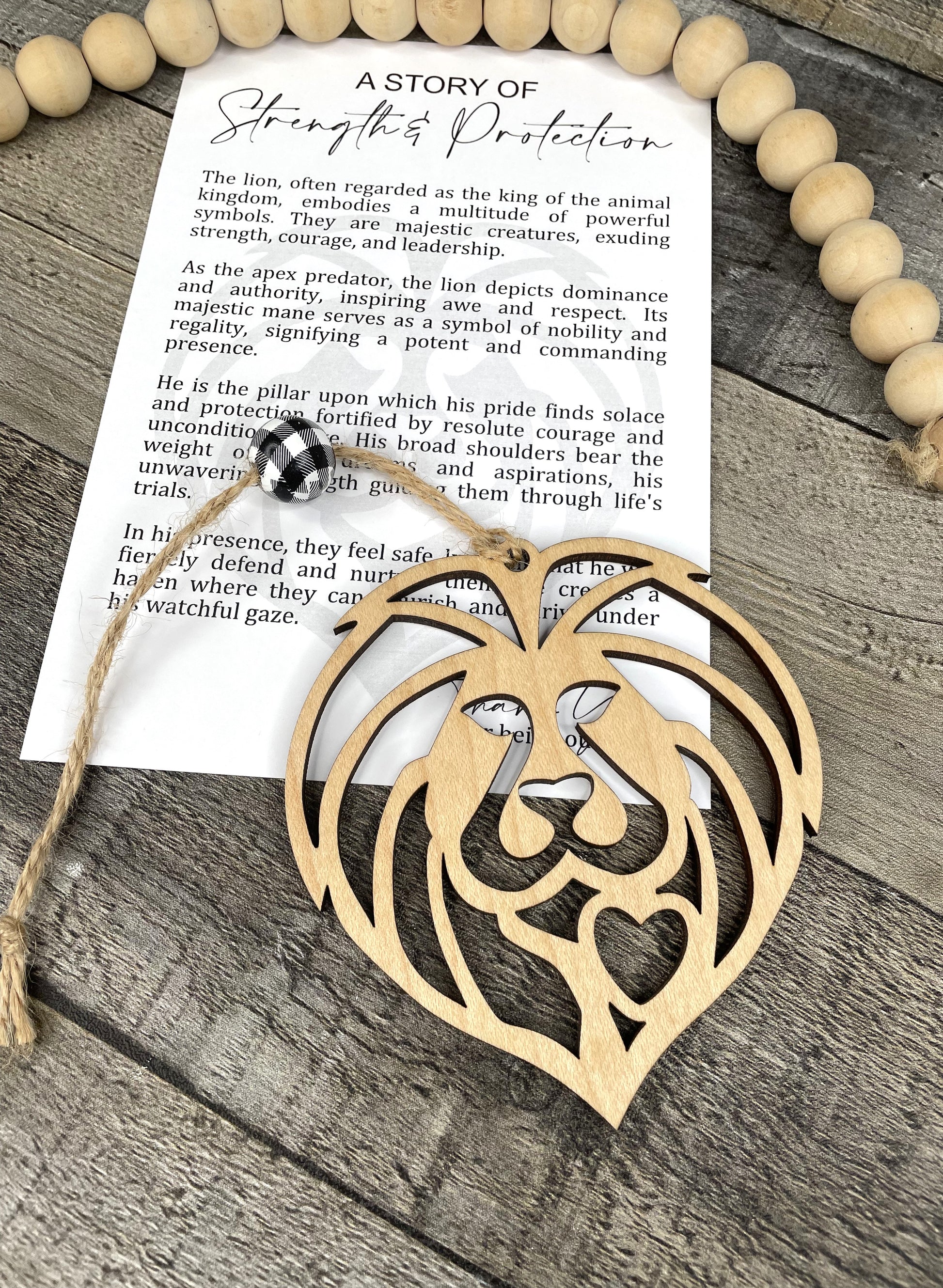This Lion Ornament or Charm is a beautifully crafted piece made from laser cut maple wood. With its intricate design and durable material, it can be used as an elegant ornament or a meaningful charm. Each charm comes with a card containing the story of Strength and Protection making it a perfect gift for anyone seeking inspiration and guidance.