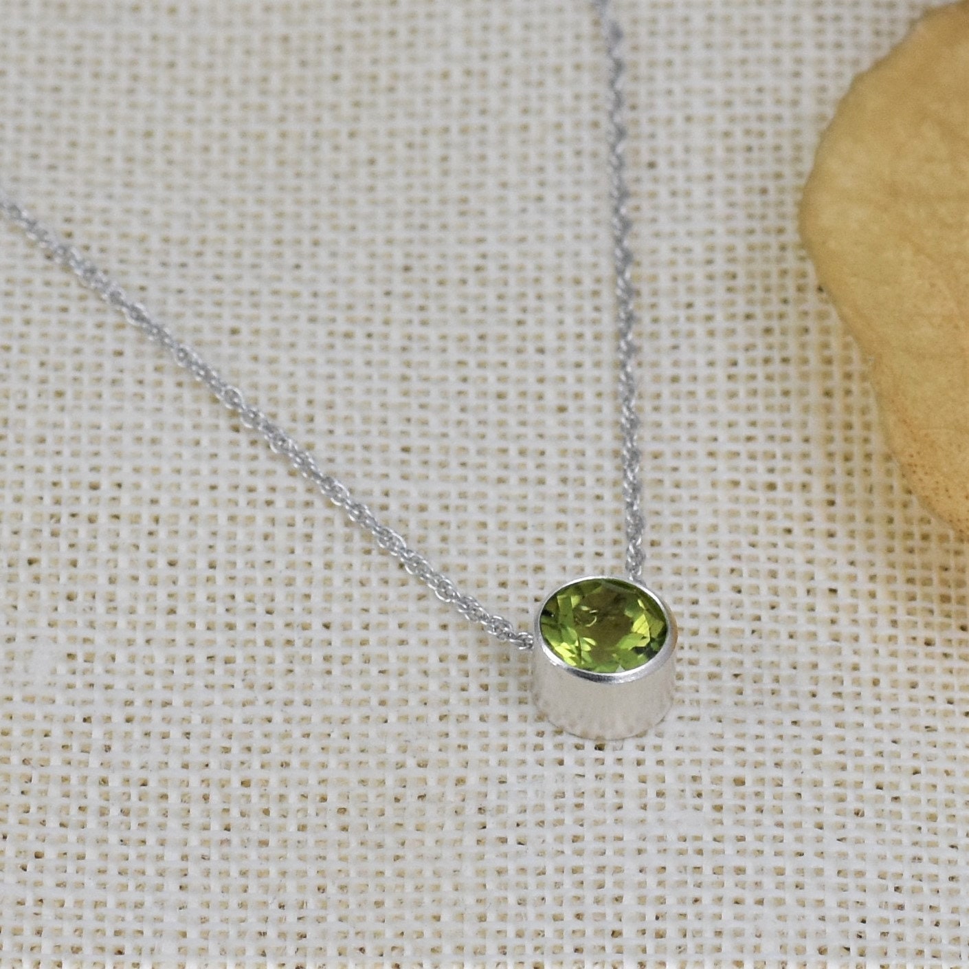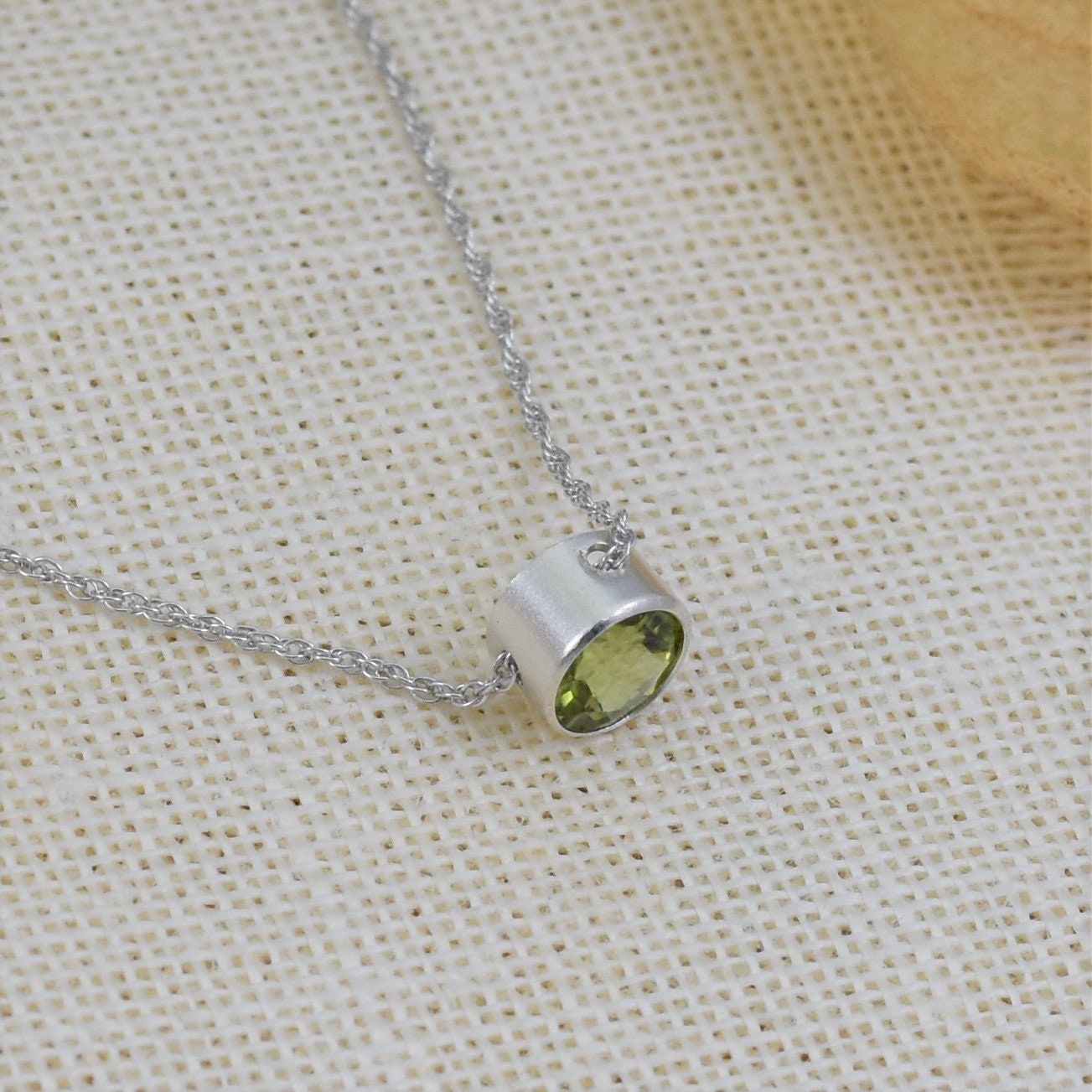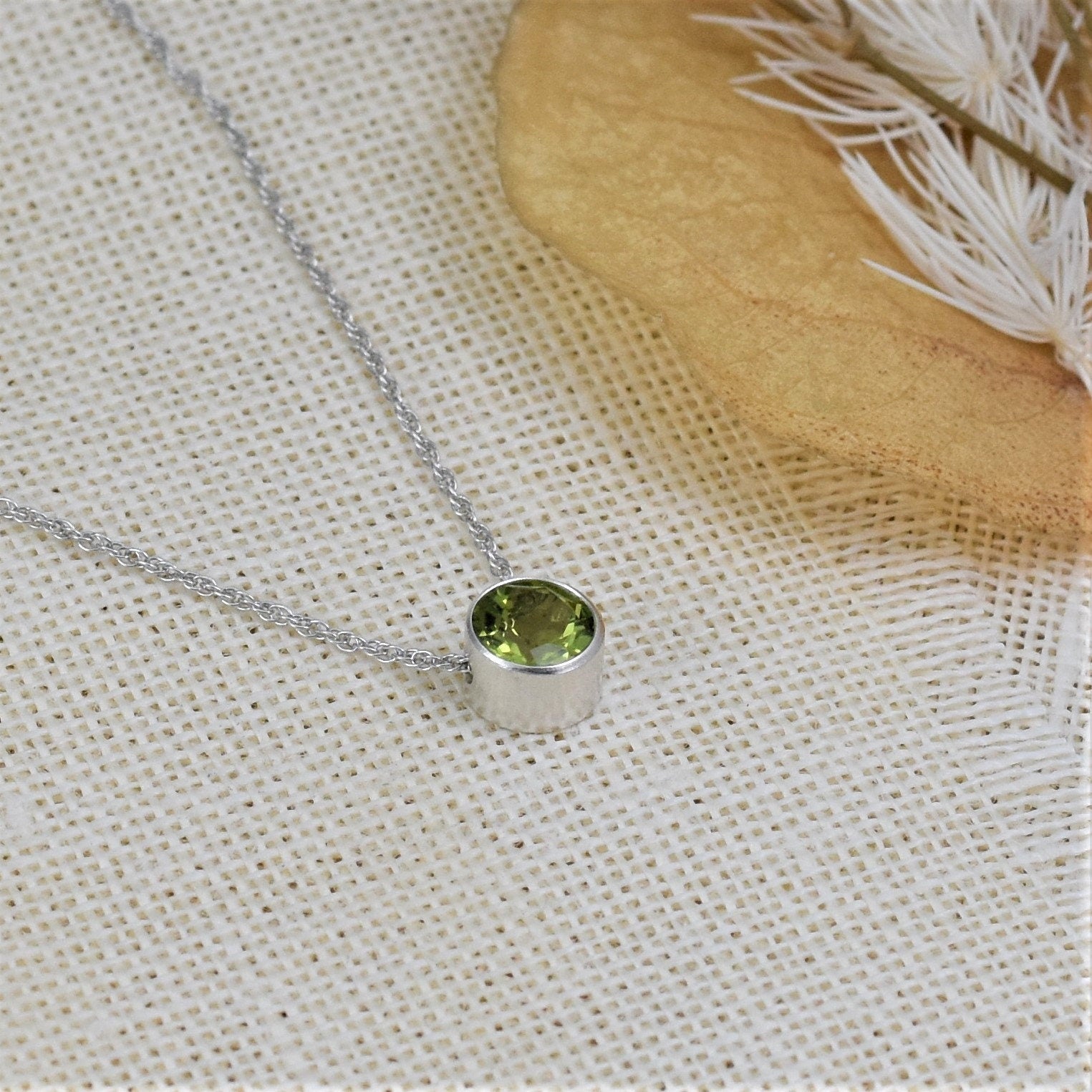 This minimalist Peridot birthstone necklace is the perfect gift for any August birthday or for anyone who loves dainty and elegant jewelry. Made with stunning sterling silver, this necklace is a keepsake that can be worn every day. The highlight of this necklace is the gorgeous lab-created or genuine Peridot gemstone, handcrafted in a beautiful bezel setting. The bright green color of the Peridot is a symbol of prosperity and happiness, making this necklace a thoughtful present for any loved one. The necklace comes with a .925 sterling silver rope chain that can be customized to the perfect length for the recipient. It comes packaged in a simple but elegant Kraft cotton filled box, complete with a ribbon bow for a perfect presentation. Plus, a polishing cloth is included with all orders, ensuring that the necklace stays shiny and beautiful for a long time. This necklace is not only a great gift for a birthday but also for Christmas or Mother's Day. It's the perfect way to show love and appreciation for a special woman in your life, whether it's your Mom, Grandma, or Daughter. Please note that each necklace is handmade to order, so please check the storefront for production times. This allows us to create a truly unique and personalized piece for you or your loved one. With its timeless design and meaningful gemstone, this Peridot birthstone necklace is a gift that will be cherished for years to come.