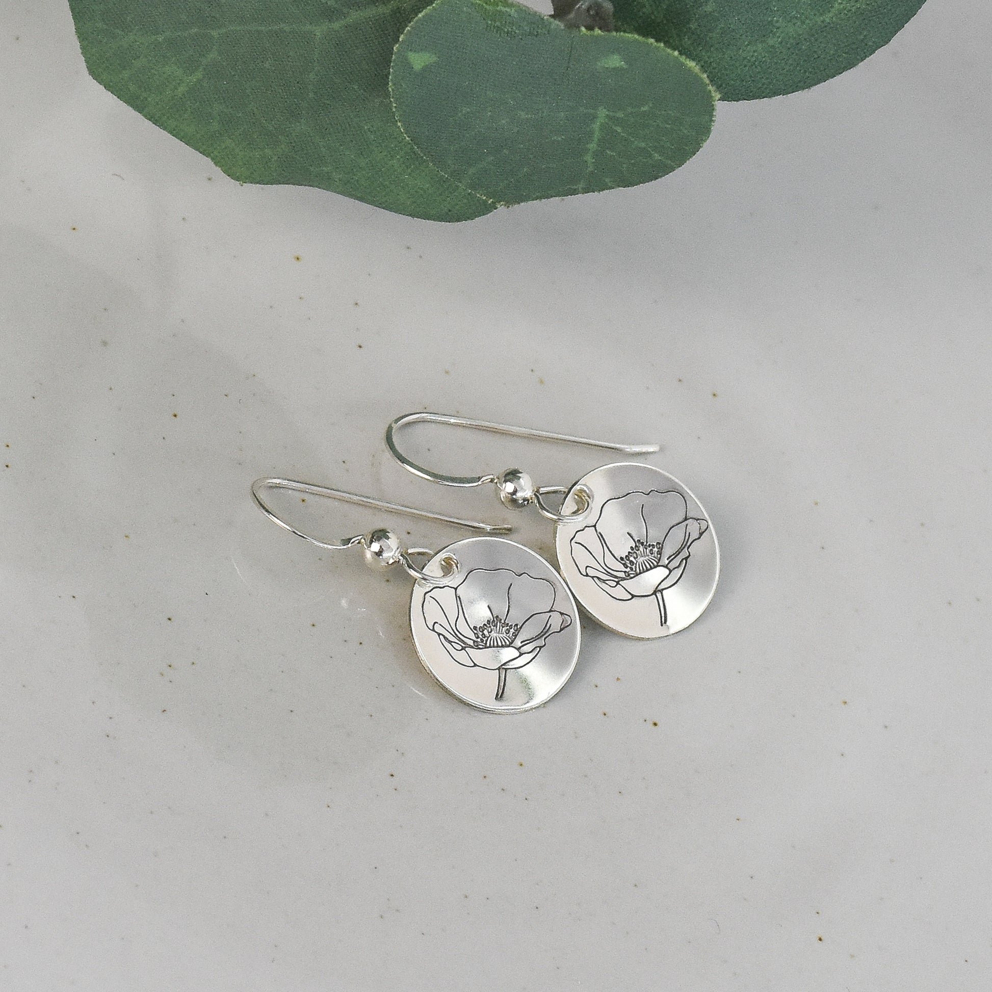 This large bloom poppy flower design earrings are handmade from sterling silver sheet metal. Stamped with punch and hammer, these petite minimalist earrings feature a stylish botanical theme. Choose between ear wire options for a perfect fit.