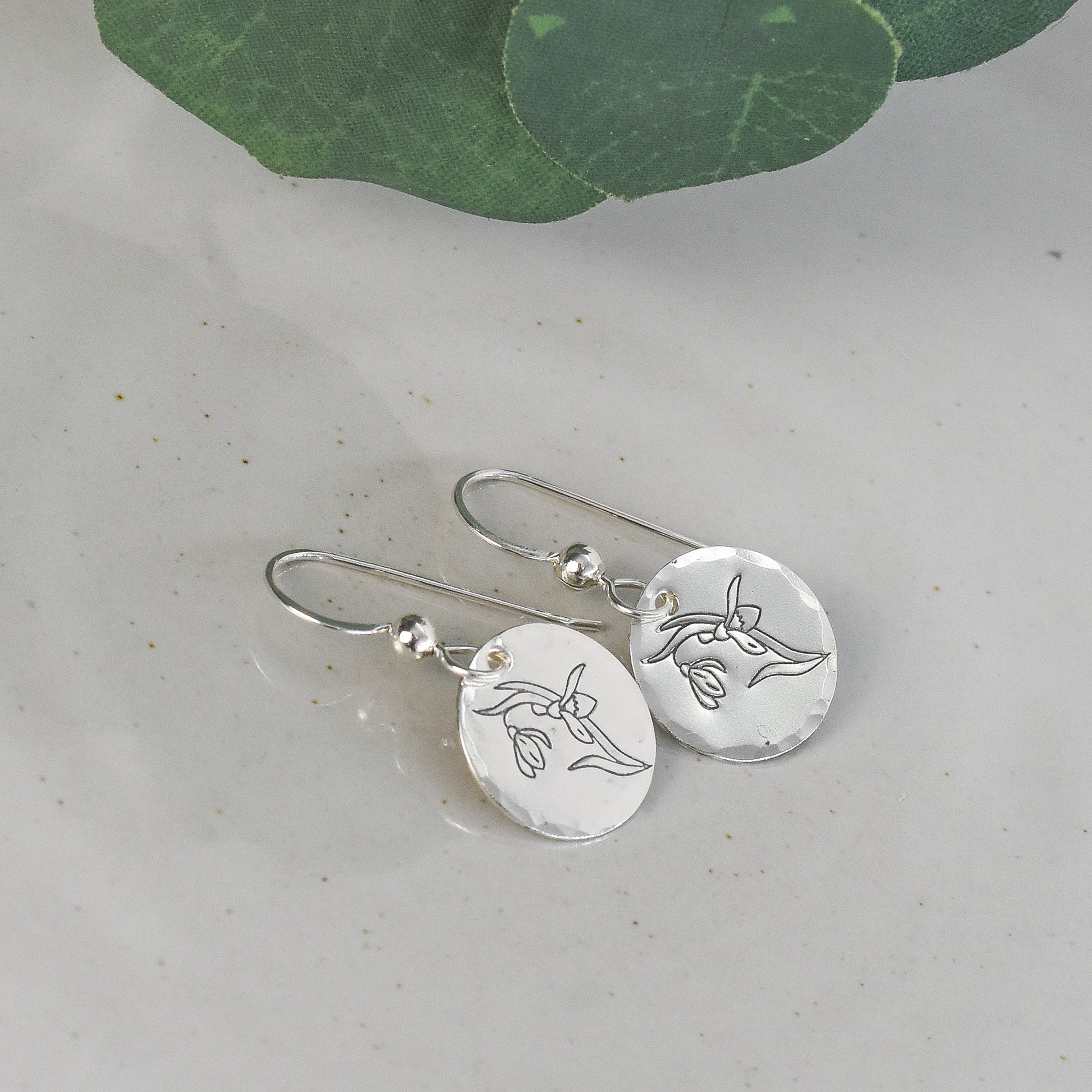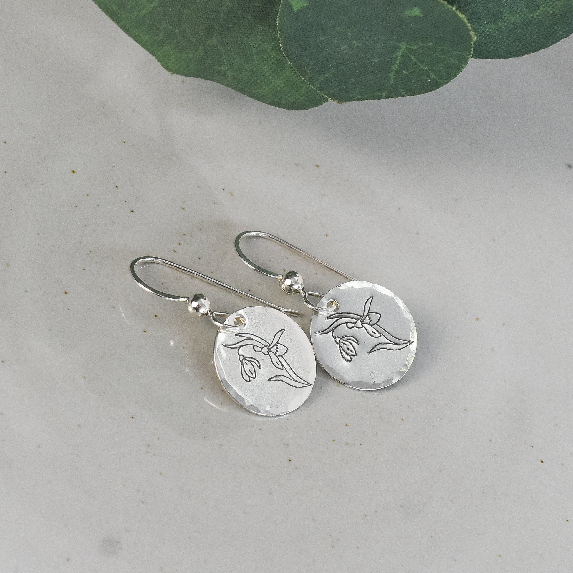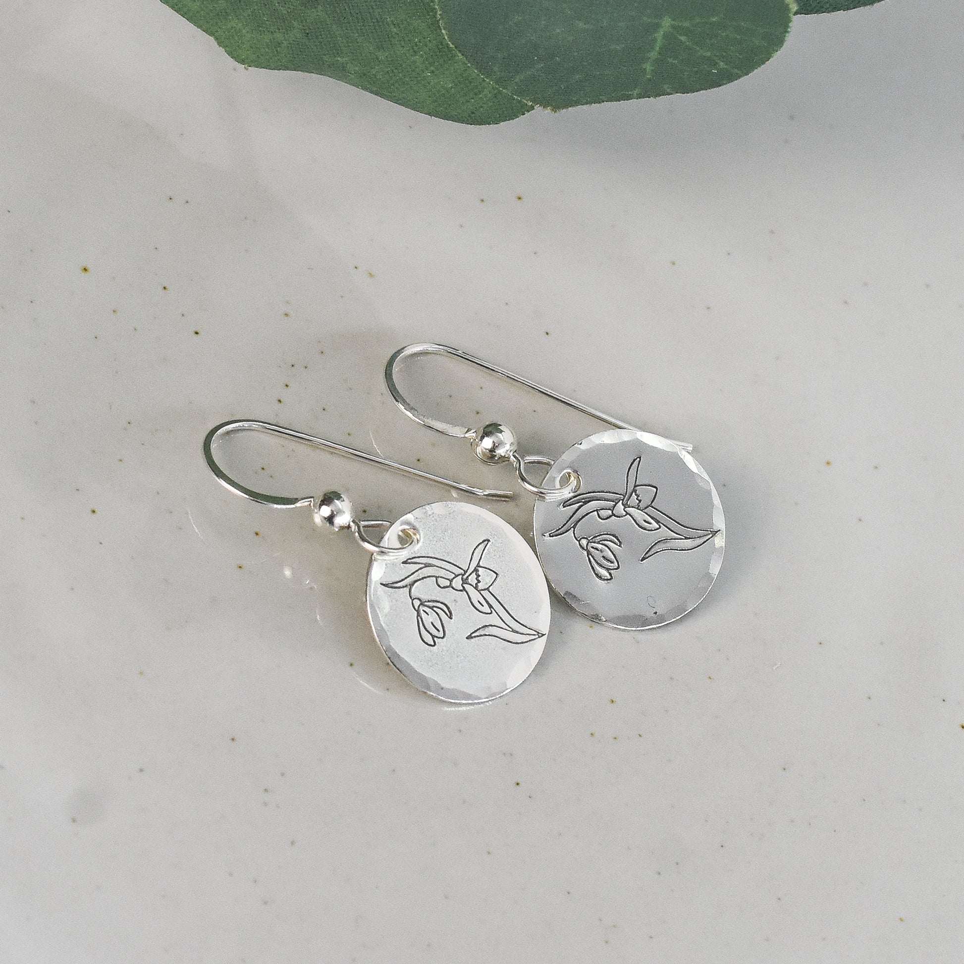 This snowdrop flower design earrings for January birth month are handmade from sterling silver sheet metal. Stamped with punch and hammer, these petite minimalist earrings feature a stylish botanical theme. Choose between ear wire options for a perfect fit.