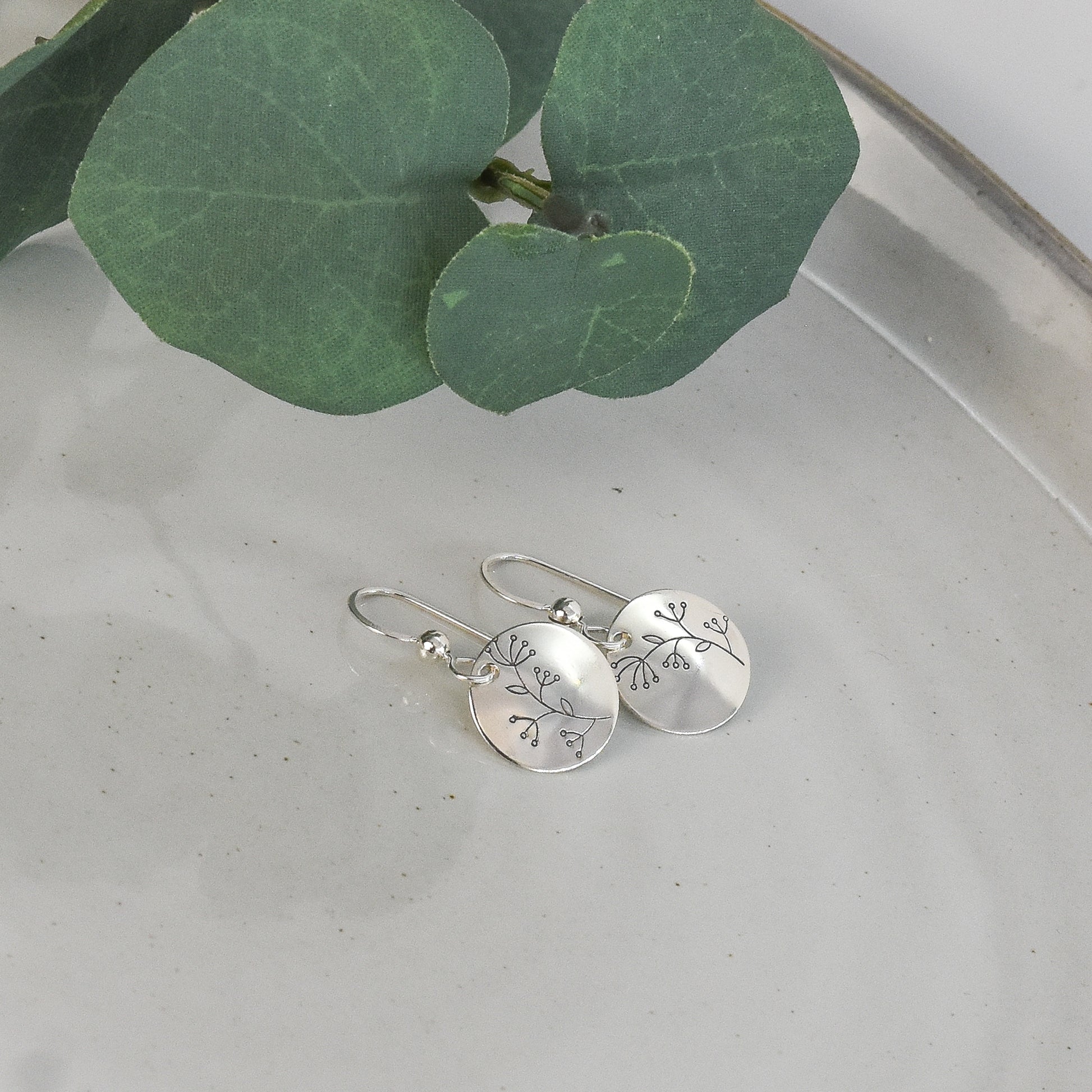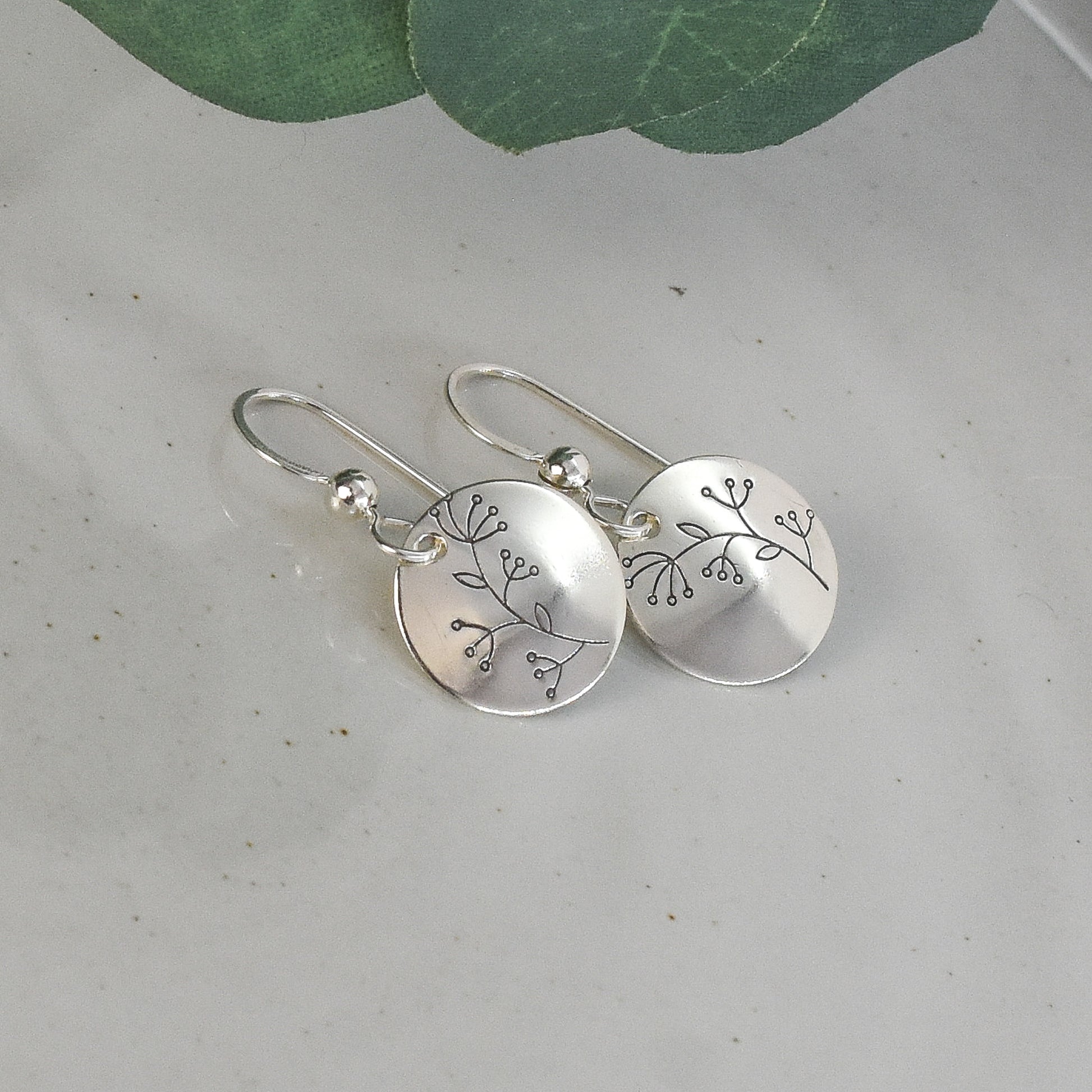 This budding branch charm earrings are handmade from sterling silver sheet metal. Stamped with punch and hammer, these petite dangle earrings feature a stylish yet minimalist botanical theme. Choose between ear wire options for a perfect fit.